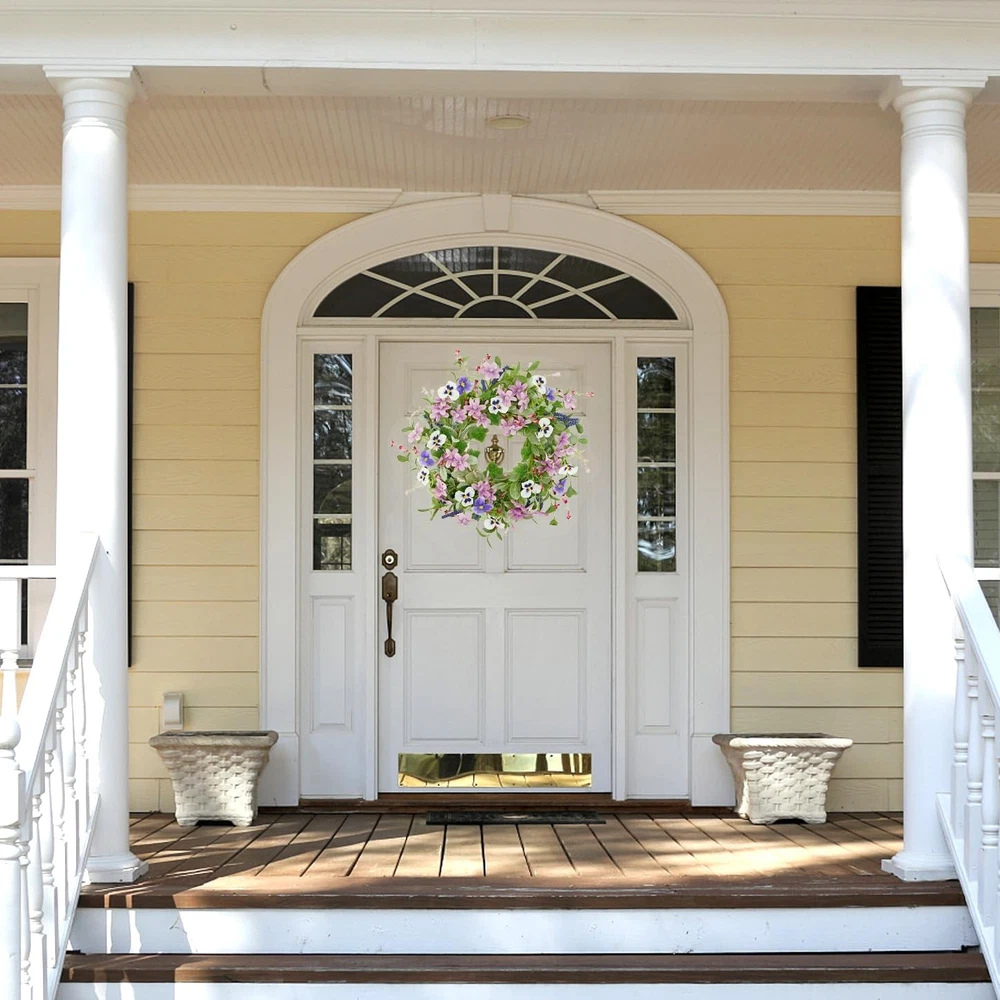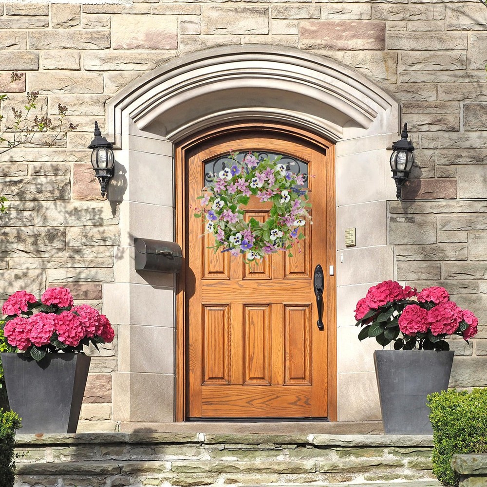 spring wreaths for Front Door Indoor Outdoor Farmhouse Porch Wall Holiday Window Decoration ADJUST WREATH SHAPE : branches of the spring summer wreath are made of bendable wire, so you can shape things as you go, and keep monkeying with them until you make it look just as you want. Please adjust or bend the branches on the wreath and arrange the pansy flower heads upward for best display.,the maximum size of wreath can be 20". VERSATILE DECOR:This spring summer floral wreath is suitable for front door, wall, indoors,outdoors,window,fireplace,farmhouse, living room, porch, centerpiece party, wedding, holiday and festival celebration. It will provide your home a feeling of natural and vatality. BEST FRIENDS FOR spring summer wreath : Suitable for spring, wedding, home, wall, window, front door, fireplace, living room, bedroom, dining room, fireplace, porch, window and other indoor and outdoor decoration. Add glamour to your spring and summer season with this striking pansy and lavender wreath. EASY CLEAN: The handmade wreath is convenient to clean, just wipe it with a try towel to make the wreath like brand new. The green leaves and branches are not easily falling apart. This wreath can be used for a long time. PACKAGING DESIGN: we pack the wreath to gift box and we Tighten the wreath when packing so that the wreath can be protected when delivery,pls open and fluff the wreath and adjust the branches,flowers, the maximum size of wreath can be 20".