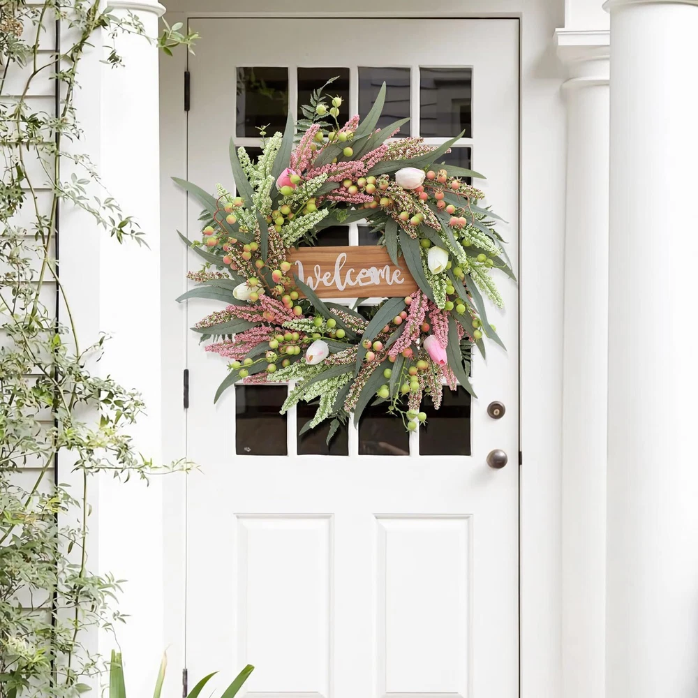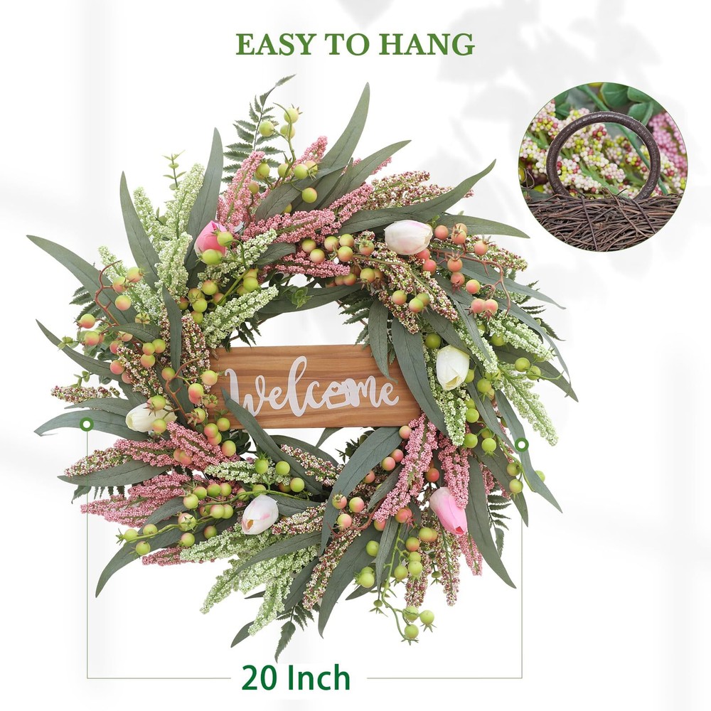 Wreaths for Front Door 20 Inch Tulip Wreath withTulip,Berries,Boxwood and Cattails Welcome Door Wreath, Porch, Window - Green Decor for Home, Farmhouse - Spring, Summer, Fall, All Seasons 【Full and realistic】 Green eucalyptus leaf wreaths hand - made by Wish Wreaths,features eucalyptus leaves, tulip,green berries, andmany Made from lots of small berries in various colors, these look like cattails embellishedon it, making the wreath full, natural and realistic. Its elegance add a vibrant and pleasant vibe to your home. 【Perfect Size】 This spring wreath is 20 inches in diameter. Each rustic farmhouse eucalyptus wreath is packed in a sturdy and exquisite box, suitable as a gift for friends. Note that because the wreath is compressed by the box to avoid being damaged during delivery, please fully stretch it to reach its maximum size. 【Versatile】 It is suitable for all seasons of the year, spring, summer, fall and winter. You can add elements of each season on it, such as maple leaves, bells, etc. welcome wreaths It comes with a solid wood "welcome" sign. You can use it in cafes, restaurants, malls, and more. And you can DIY it however you like! When you design it yourself, you will find that your wreath is the most unique scenery 【Durable】Made of high-quality materials. Colors will never fade; leaves will never fall; berries will never rot.The base of the front door wreath is made of Anatural grapevine base, which is solid and not prone to falling off, ensuring lasting stability. It can be hung on the wall, front door, porch, bedroom, living room, etc. It is perfect for indoor and outdoor, weddings and parties. It's elegance is sure to impress your family and friends. 【Guarantee】: All our spring wreaths for front door are guaranteed by quality,And every wreath is handmade. If there are any problems with our products, please 【contact us】 at the first time, we will definitely give a perfect answer. Elegant 20-Inch Tulip Wreath: Handcrafted Masterpiece for Your Home Add a touch of timeless elegance to your home with our 20-inch tulip wreath. Made with premium silk tulips and a sturdy grapevine base, this handcrafted beauty is designed to last. Perfect for doors, walls, and centerpieces, it offers vibrant color and sophisticated charm year-round. Whether adorning your entryway or enhancing your indoor decor, this exquisite wreath promises to infuse any space with grace and style. Experience the superior craftsmanship and lasting appeal of our elegant tulip wreath today. SHIPPING Domestic Buyers - We have confidence in our products, but if you are not fully satisfied please contact us within 30 days of purchase and you will get full refund. - We ship within 3 business days of payment, usually sooner - We offer FREE shipping on all orders! - We only ship to the lower 48 states, no APO/FPO addresses or PO Boxes allowed International buyers – please note: Import duties, taxes, and charges aren't included in the item price or postage cost. These charges are the buyer's responsibility. - Please check with your country's customs office to determine what these additional costs will be prior to bidding or buying. * Order Cancellation Policy ** You can return a product for up to 30 days from the date you purchased it. 1. The seller reserves the right to cancel the special case only due to eBay cancellation fee. 2. The decision of seller is the final. 3. The seller will respond to the cancellation request within 2 business days. Please wait for the result of cancellation. 4. In case the cancellation is not completed by some reasons, the buyer can follow the options below to get the refund. 4.1 The buyer can reject the item when it arrives. 4.2 The buyer can send the item back to the seller within 30 days If the buyer receives item (USA Shipment ONLY). The seller will provide the FREE return label to the buyer when the buyer opens " Return Item" case on eBay by using the reason as "Change my mind" ONLY. 5. When buyer has placed the order. The order will be processed and completed by automatic warehouse system within 5 minutes. In case that buyer sends the cancellation request after 5 minutes of placing the order, the request will be rejected. **Sending direct message to cancel the order is not allowed for every case.* Return Policy For the return case - If buyer would like to return the items for refund or replacement, please CONTACT SELLER to receive the free return label from seller. The refund or replacement will be processed with the tracking number of return label which is provided by seller only. The other ways of return which are not approved by seller will not be processed for the refund or replacement.