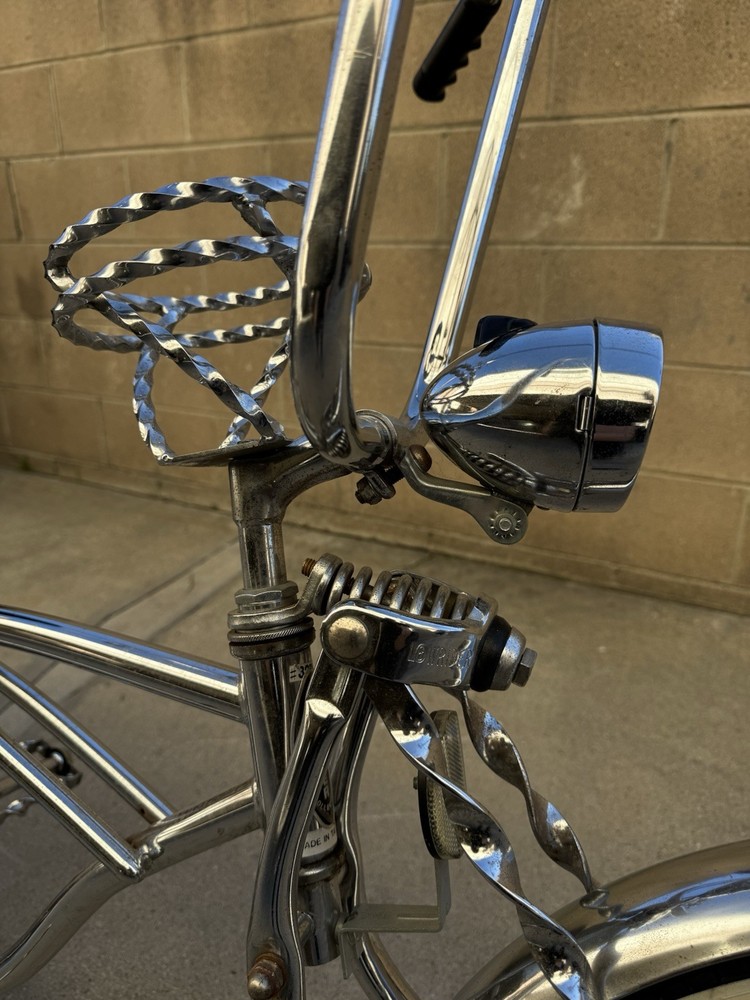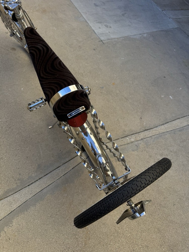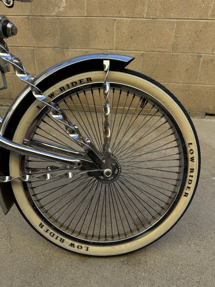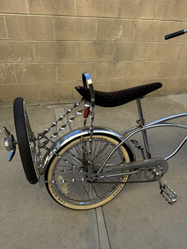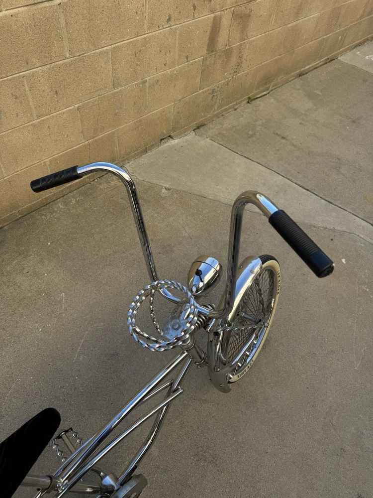 20” Chrome Lowrider Bike Custom lowrider bike with full chrome finish, 144 spoke wheels, black velour seat, and twisted chrome parts. Clean, classic lowrider style. Great for cruising, shows, or collection.