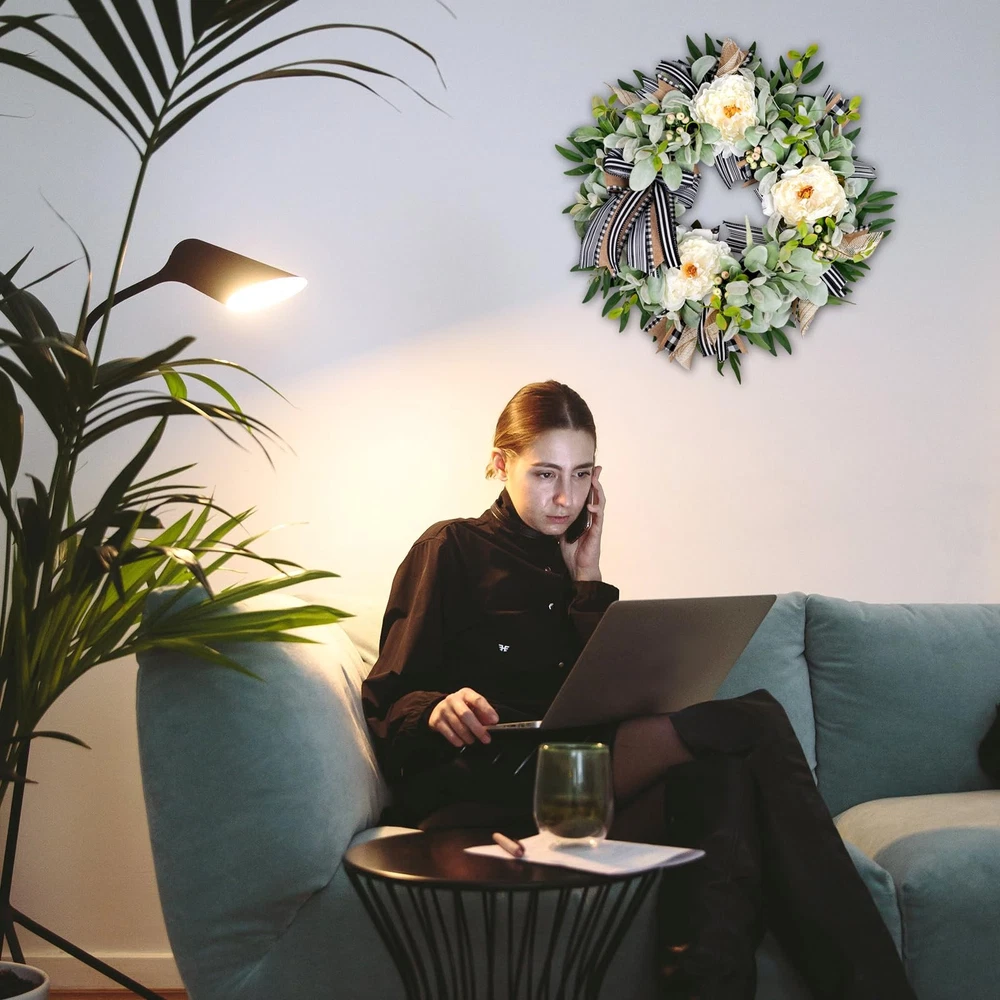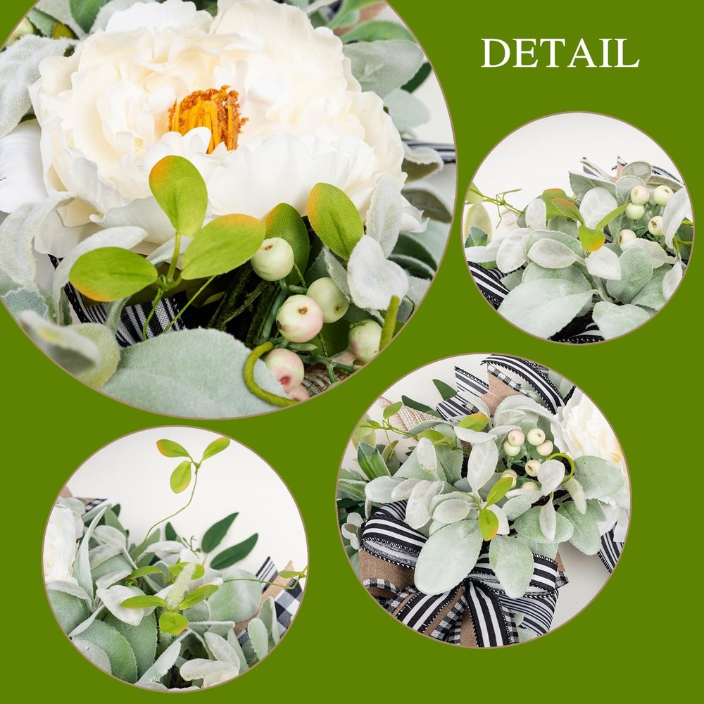 This handcrafted premium peony wreath brings the beauty of nature into your home, perfect for year-round display with a unique and elegant style. Featuring three large, realistic white peonies, delicate berries, and soft lamb’s ear leaves, this wreath front door creates a rich, layered look that perfectly balances simplicity and sophistication. The classic black-and-white buffalo plaid bow adds a touch of modern charm, making it a focal point in any setting. Whether celebrating a holiday, enhancing your front door décor, or adding ambiance to special occasions, this door wreath brings warmth and elegance to your space. Ideal as wreaths for front door, this versatile design fits seamlessly with any season or home style. Perfect for spring wreaths for front door, it can also be displayed year-round, making it a standout front door wreath for all seasons. Whether used as a winter wreath, lamb's ear wreath, or farmhouse wreath, it complements your décor beautifully. This artificial wreath is designed for both indoor and outdoor wreath use, making it a perfect door wreath for front door outside. Lambs Ear Wreaths for Front Door All Season:Enhance your home with the unique beauty of nature. This handcrafted wreath brings a touch of elegance with a design that’s perfect for every season. Not only ideal for holidays and seasonal décor, but it’s also a wonderful accent to brighten everyday spaces. Bring this stunning wreath home today High-quality Materials: Featuring three large, realistic white peonies, delicate berries, and lush lamb’s ear leaves, this wreath offers rich layers and a unique design that showcases the refined beauty of nature Artificial Spring Summer Farmhouse Wreath: A classic black-and-white buffalo plaid bow adds a stylish, timeless touch, making this wreath versatile for various settings Front Door Wreath for Home Decor:Whether displayed on your front door, in the living room, porch, fireplace, dining room, or for special occasions like Thanksgiving, Birthdays, Mother's Day or Christmas, this wreath effortlessly elevates any space Gift Box:It arrives in gift-ready packaging and is an excellent gift choice. Just adjust the lamb’s ear leaves and bow upon receiving for the perfect look