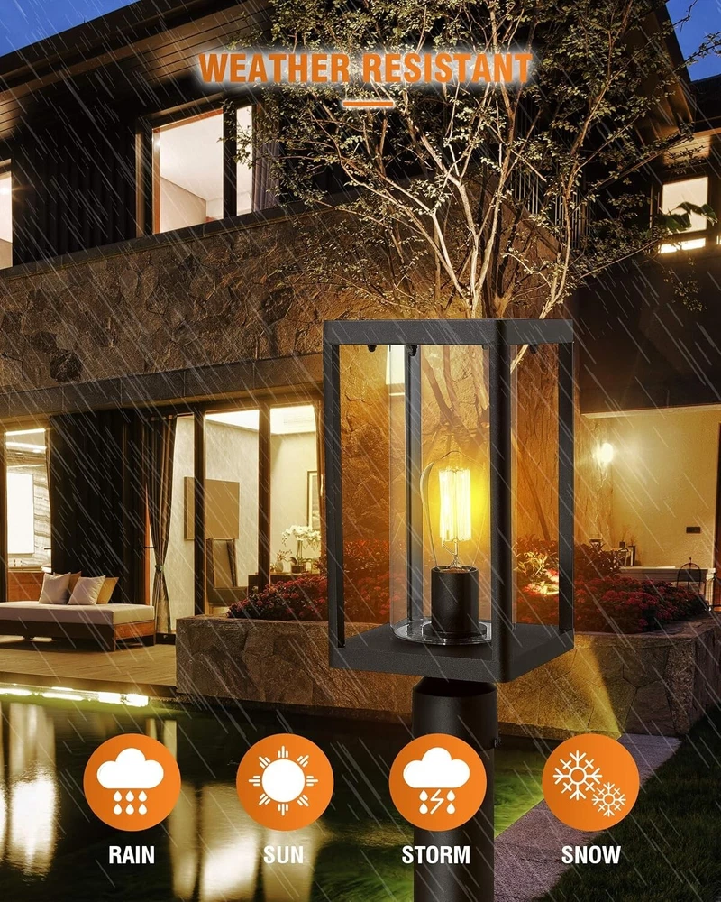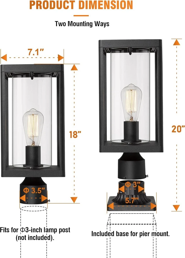 20" Modern Outdoor Post Light - Black Cast Aluminum Lantern with Clear Glass ‹ › ‹ › ‹ › ‹ › ‹ › ‹ › ‹ › ‹ › ‹ › 20" Modern Outdoor Post Light - Black Cast Aluminum Lantern with Clear Glass Features: Modern minimal design that showcases simplicity and elegance. Durable die-cast aluminum construction with a weather-resistant, powder-coated finish. Compatible with multiple mounting options: pier mount or post mount. Surrounding clear glass highlights a vintage filament bulb beautifully. Suitable for use in wet locations, perfect for enhancing outdoor spaces. ETL listed for guaranteed safety and quality. Specifications: Overall dimensions: 7"L x 7"W x 20"H Pier mount base dimensions: 5.75"L x 5.75"W x 1.75"H Fits standard 3" post (not included, sold separately) Power: 110-120V AC Hardwired Compatible with E26 medium base Edison bulbs (60W max) including LED, Fluorescent, and Incandescent bulbs (bulbs not included) Service support for 2 years Why choose our Modern Outdoor Post Light? Transform your outdoor spaces with our 20" Modern Outdoor Post Light. Designed with a sleek, minimalistic aesthetic in mind, it not only illuminates pathways and gardens but serves as a stylish statement piece. Made from durable materials, this post light can withstand the elements while highlighting your favorite vintage-style bulbs. With its versatile mounting options and compatibility with various bulb types, you can customize your lighting experience to suit your needs. Light up your yard, driveway, or path with elegance and functionality—order your Modern Outdoor Post Light today and create a warm, welcoming atmosphere in your outdoor retreat! Shipping Free & Fast Shipping - We offer free shipping to most of the USA with a normal delivery time of 3-10 businessdays. However, due to various situations, additional delivery time (up to 3 weeks) may be required for some items. Alternative Carriers - We may use alternative carriers (e.g. USPS, FedEx, UPS, etc.) to ensure your package arrives safely and on time. Due to the use of multiple carriers, we are unable to provide a tracking number automatically. Handling Time - Orders are processed and shipped within 1-5 business days of receiving cleared payment. Shipping Restrictions - Shipping to Alaska, Hawaii, Puerto Rico, Guam, and other US territories may incur shipping charges or delivery restrictions. Please contact us before ordering, or your order can be refunded/cancelled. State Restrictions - There may be restrictions based on your state of purchase. For example, certain items may not be shipped to California due to state regulations. Contact for Tracking Updates - If you require tracking updates or have any concerns about the delivery of your order, please feel free to contact us, and we will be happy to assist you. Return Please see our ebay return policy. We do not accept return on most products. This is to avoid customers mis-using ebay returns. All sales are final. Please be sure to check the return policy listed at the top of the listing. In rare cases, we may accept returns, if the buyer pays both ways shipping and 20% restocking fee. If you are un-sure of return policy of a particular item, please ask before buying. Payment We accept all major credit cards, PayPal, and Apple Pay for your convenience. Your payment information is secure and encrypted to ensure a safe and seamless transaction. Please complete your payment within 3 days of purchase to avoid any delays in shipping. Feedback Your feedback is extremely important to us. We strive to provide the best products and customer service possible. If you are satisfied with your purchase, please take a moment to leave us a positive review. If you have any concerns or issues with your order, please contact us before leaving negative feedback. We are committed to resolving any problems and ensuring your satisfaction. Contact Us If you have any questions or concerns, please feel free to reach out to our customer support team. You can contact us through the eBay messaging system. We are available Monday to Friday, 9:00 am to 5:00 pm EST, and we will do our best to respond to your inquiry within 24 hours. Buy it now and enjoy a pleasant shopping experience! UPC: Not Set Unit Quantity: 1 Features: Weather Resistant,Modern Design,Durable,Corrosion Resistant,Easy Installation,Includes Mounting Hardware,Suitable for Wet Locations Theme: Modern Light Color: Black,Clear Mounting: Pier mount,Post Mount Material: Aluminum,Glass,Cast Aluminum Control Style: App Control,Push Button Smart Home Compatibility: Not Set Labels & Certifications: Not Set Type: Post Light Brand: Unbranded Power Source: Corded Electric Installation Area: Outdoor Sensor Type: Not Set Lighting Technology: LED Number of Lights: 1 Color: Black Number of Settings: 1 Energy Star: Not Set MPN: Not Set EC Range: Not Set Style: Modern Finish: Powder Coated Size: Large Power Consumption: 60 W IP Rating: Not Set Voltage: 120 V Bulb Shape Code: E26 Item Diameter: Not Set Country/Region of Manufacture: Not Set Lumens: Not Set Color Temperature: Not Set Bulb Life Hours: Not Set Model: Not Set Item Height: Not Set Item Length: Not Set Item Weight: 5.6 lb Item Width: Not Set Unit Type: lb