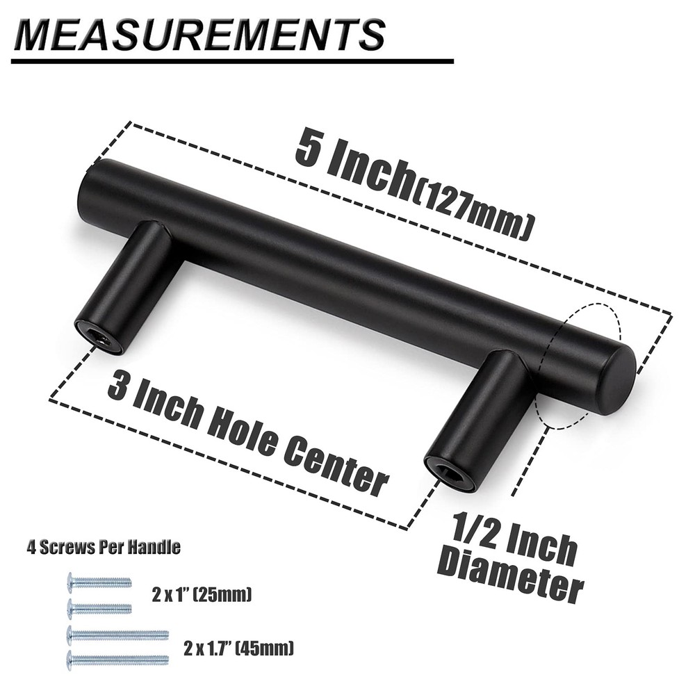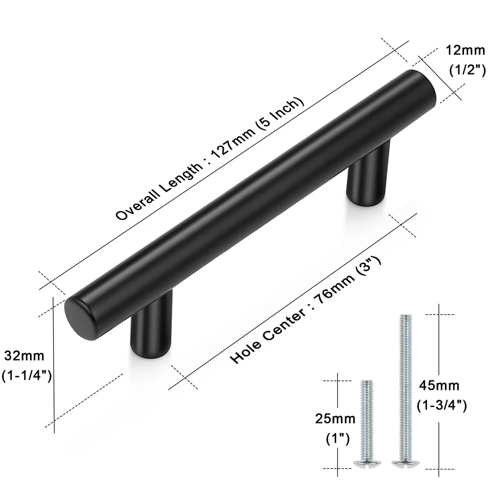 Metal & Finish: 20 Pack T Bar Kitchen Cabinet Handles, Flat Black Finish, Hollow Tube, Made of high quality Stainless Steel, Sturdy and will not get dirty easily Measurement: Hole Centers(CC):76mm(3"), Overall Length:127mm(5"), Tube Diameter:12mm(1/2") Screws: *25mm and *45mm screws are included for choice. The screws are suitable for most standard cabinet board thicknesses. Design:These modern style stainless steel cabinet handles will make cabinet hardware a part of your home decor today. Application:The black cabinet pulls are suitable for different styles of cabinets, closets, drawers, cupboards, kitchens, bathrooms, bedrooms, home doors.