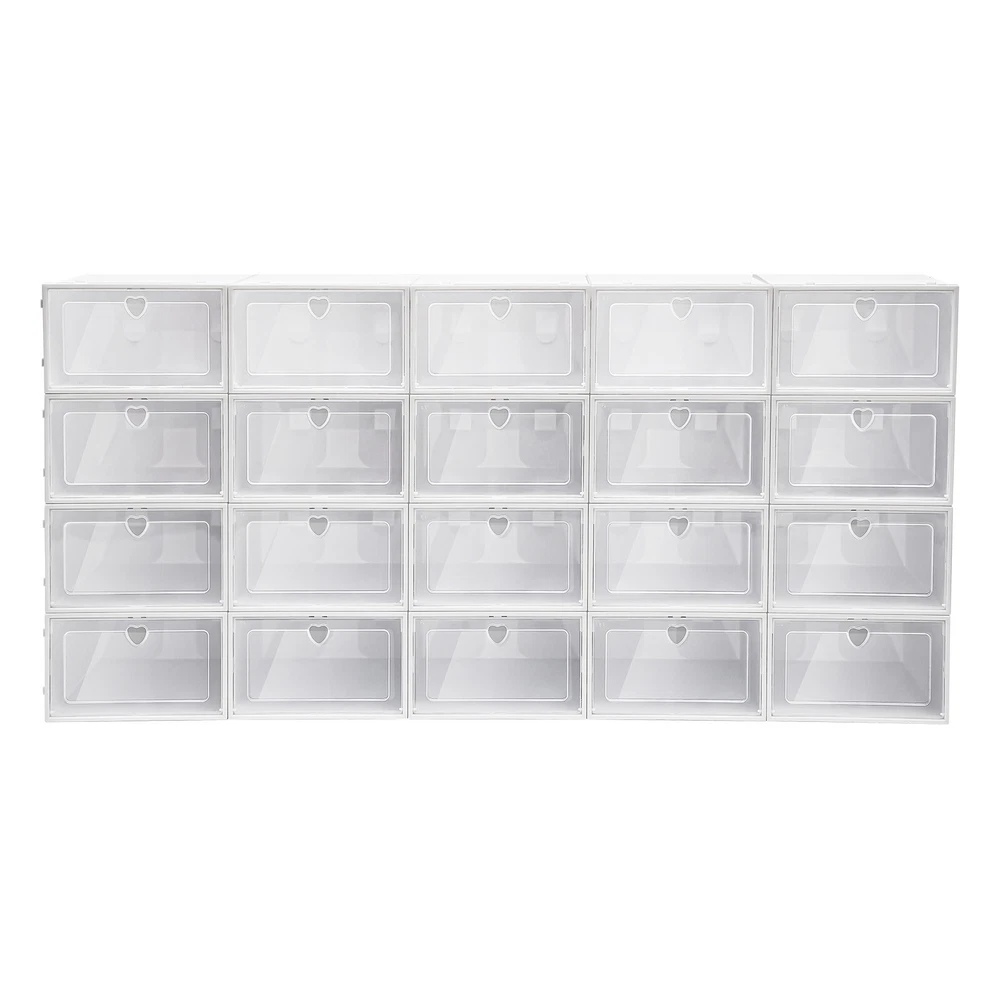 Specifications Material: PP Color: White, Clear Style: Simple, Modern Special Feature: Stackable Shape: Rectangular Number of Items: 20 Suitable Shoes: Up to 10 (Women, US), Up to 9 (Men, US) Frame Thickness: 1.1cm/0.43inch Each Organizer Size: 23*33*14cm/9*13*5.5inch Package Size: 47*37*12cm/18.5*14.6*4.7inch Gross Weight: 4.45kg/9.8lbs Net Weight: 4kg/8.8lbs Package Included 20*Shoe Organizers 20 Pack Foldable Shoe Box Organizer Stackable Clear Plastic Shoe Storage Case Description A beautiful life starts with organized storage. A set of 20 shoe organizers is enough for your neat storage needs. The transparent design ensures that your collection can be displayed and also allows you to easily find the right shoes without opening the box. In addition, it can maximize your space saving and keep your home neat and beautiful. If you are still struggling with messy shoes, try the stackable shoe organizers! Key Features High-quality Material: It is made of PP, which is harmless, environmentally friendly, impact-resistant, non-yellowing, and non-deformable, making it suitable for long-term use. Free Stacking: With the snap interlocking system, they can be firmly stacked up and down and be connected side to side to create different shapes without easy separation when you accidentally bump into them to suit different sized spaces and unique decorations. Stacking upwards saves a lot of space. Easy to Access: The transparent doors allow you to quickly find and select the shoes you want to match your outfit for the day. Flip-up doors allow for secure and easy shoe access. Powerful Storage Capacity: The combination of 20 shoe organizers can meet almost all your shoe storage needs. Besides, it can also store a large number of living and learning items to lighten the load of your cabinet. Placing boards on top of the stacked boxes can also hold keys and other miscellaneous items. Lightweight and Foldable: They can be folded for easy storage and transportation when not in use. The lighter PP organizer makes it easy for you to move it to any room to serve its storage and decorative purpose. Easy to Install: The already-made creases, simple construction, step-by-step installation diagram and installation video allow you to spend less time and effort on the installation. Easy to Clean: It is made of dirt-resistant PP. When it gets stained, you just need to rinse it with water and dry it to make it look new again. Life Assistant: This practical shoe storage assistant can help us organize our messy shoes, avoiding the panic of finding shoes in a pile and creating a cleaner, warmer living environment. Ideal Gift: With its simple appearance and good performance, this product can be used as a gift for housewarming, or you can give it to your family or friends so that they can also enjoy a neater environment. Details Heart-shaped Hollow Handle: The lovely heart-shaped handle not only is convenient for opening the door, but also promotes air circulation to prevent shoes from moisture and odor. Practical Door: Compared to a doorless organizer, it comes with a door to protect your precious shoes from dust and moisture. Flip-up doors are easier to open/close and also better protect your skin from scratches, compared to left and right opening doors. Smooth Rounded Corners: They protect your hands from being scratched during installation and movement for safer use. Application The set of shoe organizers can store flat shoes, leisure shoes and sneakers, and women's shoe size 10 (US) and men's shoe size 9 (US). It is widely used in the entrance, study, toy room, bedroom and closet to organize clothes, toys, toiletries, books, magazines, documents, sundries and so on. Installation Steps 1. Shape the box along this crease. 2. Bend the bottom of the box. 3. Snap the buckle into the bottom holes. 4. Fold the 3 tabs. 5. Snap the tabs into the frame of the box. 6. Installation is complete. Specifications Material: PP Color: White, Clear Style: Simple, Modern Special Feature: Stackable Shape: Rectangular Number of Items: 20 Suitable Shoes: Up to 10 (Women, US), Up to 9 (Men, US) Frame Thickness: 1.1cm/0.43inch Each Organizer Size: 23*33*14cm/9*13*5.5inch Package Size: 47*37*12cm/18.5*14.6*4.7inch Gross Weight: 4.45kg/9.8lbs Net Weight: 4kg/8.8lbs Package Included 20*Shoe Organizers Notes 1. Please note that this product is manual available in English, German and French, please contact customer service for more information. 2. Please measure your shoe size before your purchase. High-top shoes and boots can't be put up vertically, but can be placed flat if they are true to size. 3. For greater stability, it is recommended not to stack the boxes too high. 4. Please allow the slight color difference caused by the shooting light and 1-3cm error due to manual measurement, and make sure you do not mind before you order. Notes:Please note that this product is manual available in English, German and French, please contact customer service for more information. Payment Delivery details Terms of sales About us Contact us Payment We accept ebay payment 。 Fees such as import duties, taxes are not included in the item price or shipping costs. These charges are the buyer's responsibility. Delivery details Shipping: 2-9 working days to: USA Terms of sales We maintain high standards of excellence and strive for hundred percent customer satisfaction. Feedback is very important to us. We hope that you contact us immediately before you give neutral or negative feedback, so that we can address your concerns. It is impossible to address issues if we do not know about them! About us Your satis faction is our ultimate goal. We work hard to earn your trust and future business. Our certified technicians have tested each item before shipping. The unit comes with 1 year limited warranty on all manufacturing defects. a) If you receive a defective item, you may return it or ask for a discount. Please contact us within 14 days after you receive the packa