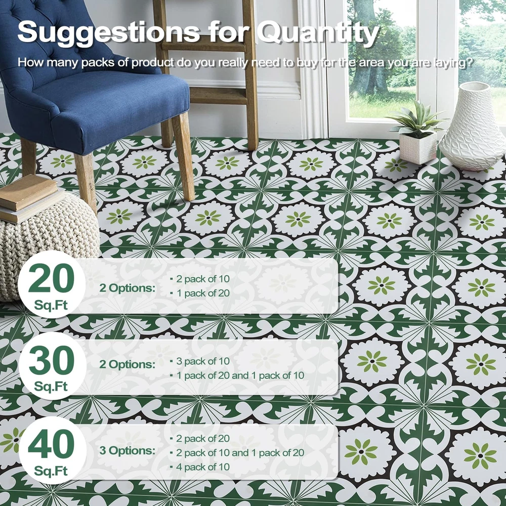 Weight:8.25 PoundsSize:11.8 × 11.8 Inch 20 PcsItem Form:Peel And StickMaterial:VinylUPC:Does not applyType:Does not applyStyle:ModernUnit Count:20.0Part Number:20240307KGrade Rating:Residentialgtin13:Does not applyItem Shape:SquareBrand:RomdecoItem Package Quantity:20Package Dimensions LxWxH:12.32x12.28x0.98 InchesColor:GreenPattern:Floral