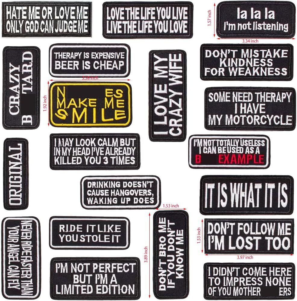 20 Pcs Sew On Iron On Patches for Motorcycle Biker Vest Backpacks Jeans This mix pack assortment letter iron patches vintage include 20pcs different slogan iron on decals applique patches for adult clothes. Iron patches are great for clothing, especially Jeans, Jackets, Shirt, Backpacks, Pants, Hats; Front side of patch is polyester fabric, rear side is covered with hot-melt adhesive film; All iron on patches for clothes have different size. Size of la la la i'm not listening: 3.34x1.57inch; Patches ironed are washable and can be ironed on again if it start to peel off. One U-Sky patches can be ironed at least 2-3 times; Easy to apply, which only takes few mins to repair holes on pants or decorate your jackets and backpacks; Set Iron to "Cotton" at degree clothes can undertake, for 20-40 seconds; Shipping We offer FREE shipping on all orders! We ship within Three business days of payment, usually sooner. We use a selection of shipping services such as UPS, FedEx, USPS etc. We only ship to the lower 48 states, no APO/FPO addresses or PO Boxes allowed. Local pickups and combined shipping options are not provided at this time. Return You can return a product for up to 30 days from the date you purchased it. Any product you return must be in the same condition you received it and in the original packaging. Please keep the receipt. Customer satisfaction is very important to us. If you have any problem with your order, please contact us and we will do our best to make you satisfied. Contact Us If you have any queries, please contact us via ebay. We usually respond within 24 hours on weekdays. Please visit our eBay store to check out other items for sale! Thank you for shopping at our store.
