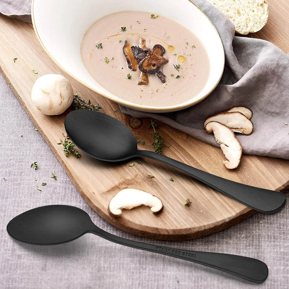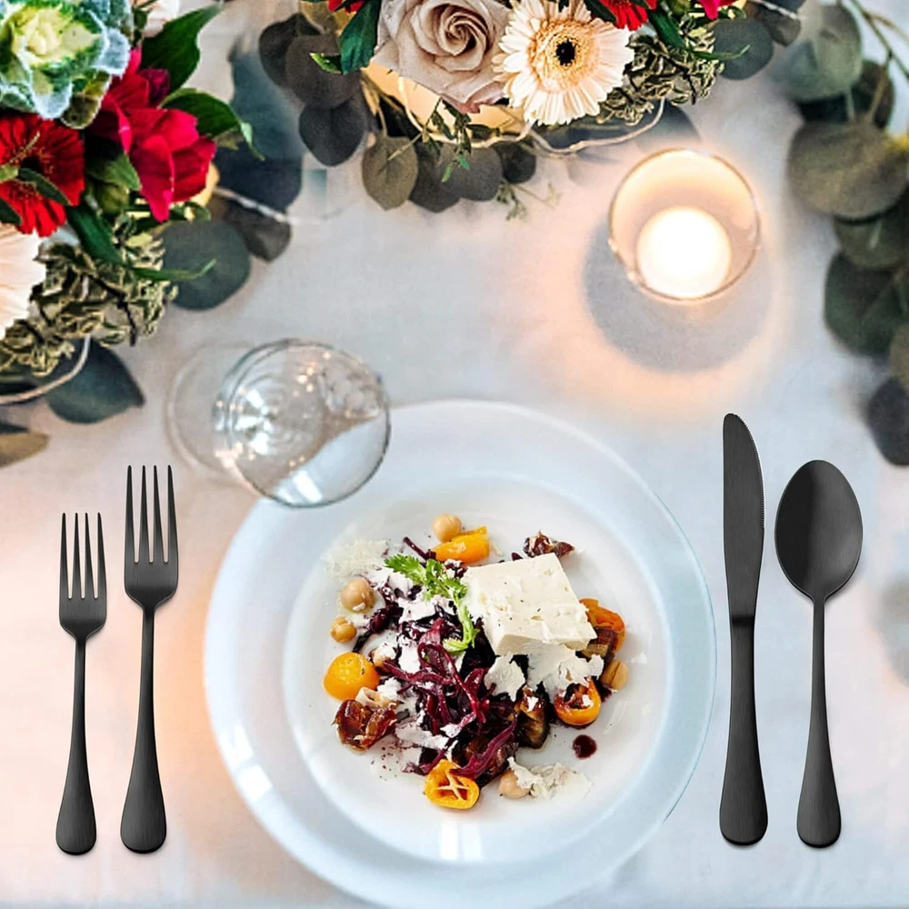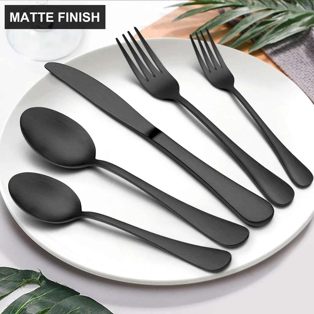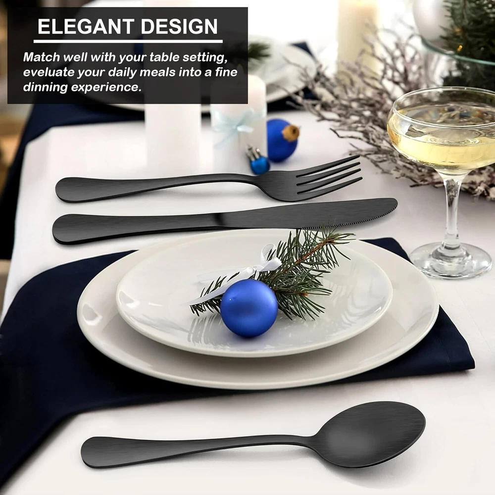 20 Piece Matte Black Silverware Set, Stainless Steel Black Flatware Cutlery Set for 4, Fancy Kitchen Utensil Tableware for Home Restaurant Party, Satin Finish, Dishwasher Safe 20 Piece silverware set service for 4, consists of 4 dinner spoons, 4 tea spoons, 4 dinner knives, 4 dinner forks, 4 dessert forks, nice black flatware set great for family daily use, entertaining guest, restaurant, party, wedding and any formal or causal occasions Superior quality, forks and spoons silverware set is made of premium stainless steel, resist rust and corrosion, vacuum electroplate technology ensures long lasting of black finish, will not chip off or fade its color, durable to serve you well for s to come Unique matte black silverware set, fancy eating utensil set feature with satin finish surface, fancy and stylish, add a touch of elegant and luxurious dining sense on your table setting, standing out from those common flatware, evaluate your daily meals into a fine dining experience Nice workmanship, smooth edge without rough spots to ensure your safety, ergonomic handle with a slight curve combine with the holding posture of hand to offer maximum comfort, proper weight provide great hand feel for both teenager and adults Dishwasher safe, stainless steel tableware set is easy to clean and maintain, smooth matte finish surface makes cleaning in breeze, dishwasher safe to save your labor, wonderful gift for housewarming, wedding, birthday, Christmas, festivals ABOUT US: specializes in the production and sales of various silverware and kitchenware. The quality of all our products is gauranteed.