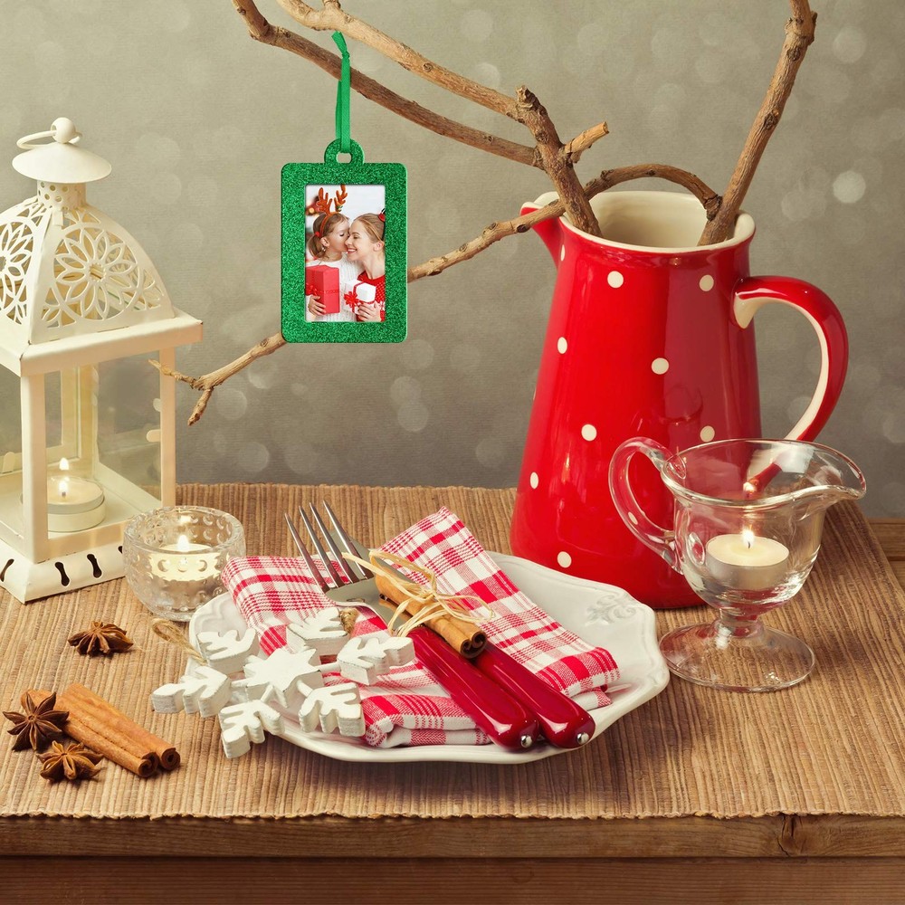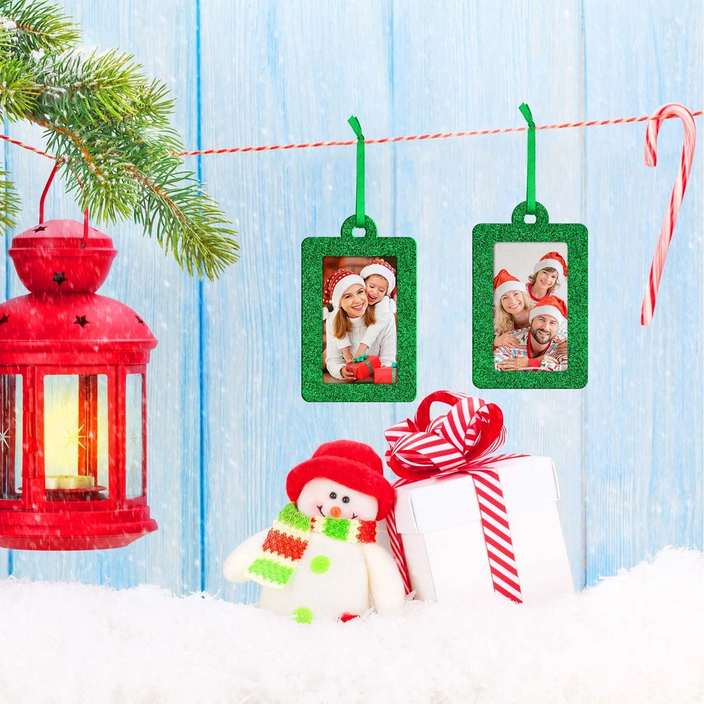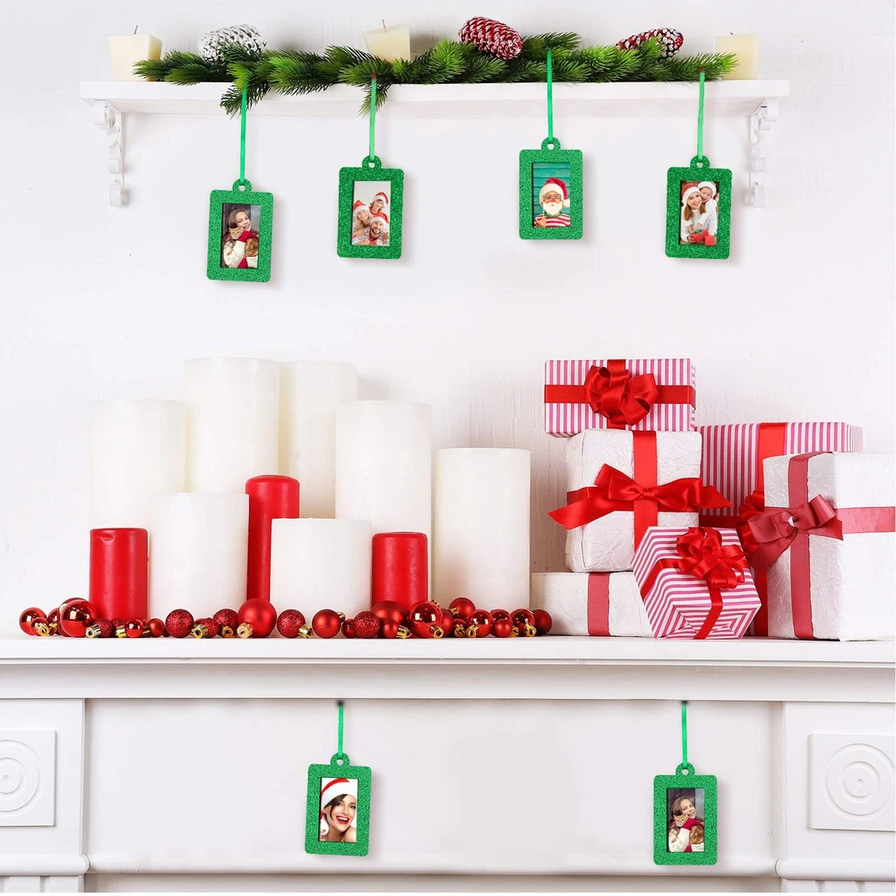 Sufficient quantity: you will receive 20 pieces of felt Christmas photo frame ornaments with glitter design; You can put your cherished family photo in this beautiful festive picture frame ornament, which is suitable for Christmas trees decoration; Sufficient quantity, that you can share with your friends and neighbors Glittering and durable material: these Christmas holiday frames are made of bright felt glitter material, glittering and durable can make your photos more beautiful; They won't weigh your tree limbs down because of their lightweight feature, and they are durable to last season after season; Your photos can be protected by our frames Appropriate size: you want enough space to display your photos; The frame size of Christmas photo frame is 7 x 5 cm, and the inner ring is suitable for 3 x 5 cm/1.2 x 2 inch photos, which is the appropriate size for decoration; This photo frame is also a meaningful gift for family and friends Christmas decoration: these mini photo frames are suitable for decorating your Christmas family picture, they are attractive decoration for Christmas family party, Christmas tree decoration, Christmas gathering and so on; You can hang the Christmas photo ornaments on many items, such as Christmas trees, door, window, staircase, fireplace and more Lightweight design: the hanging ornament frames are made of felt, which is lightweight, easy to carry and not easy to deform; They are also proper for hanging in many places