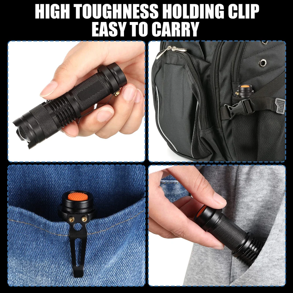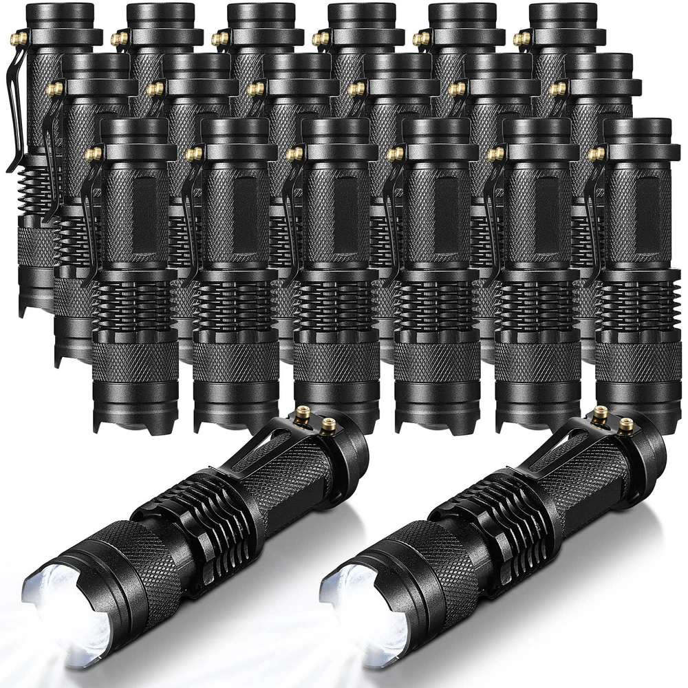 What You Will Receive: the package contains 20 pieces of zoomable LED flashlights in black color, the LED flashlight is powered by 1 AA battery ( not included) , which are sufficient to meet your needs for daily activities and sharing Trustworthy Material: tactical flashlights are mainly made of quality aluminum alloy, sturdy, reusable, waterproof, non slip and not easy to deform or fade, which can can withstand heavy rain, heavy snow and other bad weather, bringing you much convenience in daily life Portable and Compact: zoomable pocket led flashlight is about 3.58 x 0.98 inches, the mini size makes it easy to put into your pocket, backpack or purse, featuring with clips, mini flashlights can clip to your binder, shirt, backpack, belt or pants pocket 3 Modes Adjustable Brightness: small led flashlights with 3 adjustable modes, namely high, low and strobe modes, bright enough to light up an entire room, you can change the on or off buttons to adjust the mode according to your needs Adaptable to a Variety of Environments: simply press the switch on the end of the pocket torch flashlight to turn it on or off; You can use waterproof tactical LED flashlight in many scenarios, such as fishing, biking, night walks, camping, hiking, hunting, reading at night, you can also store handheld flashlights in your home, car, home shelter, basement, office or other places