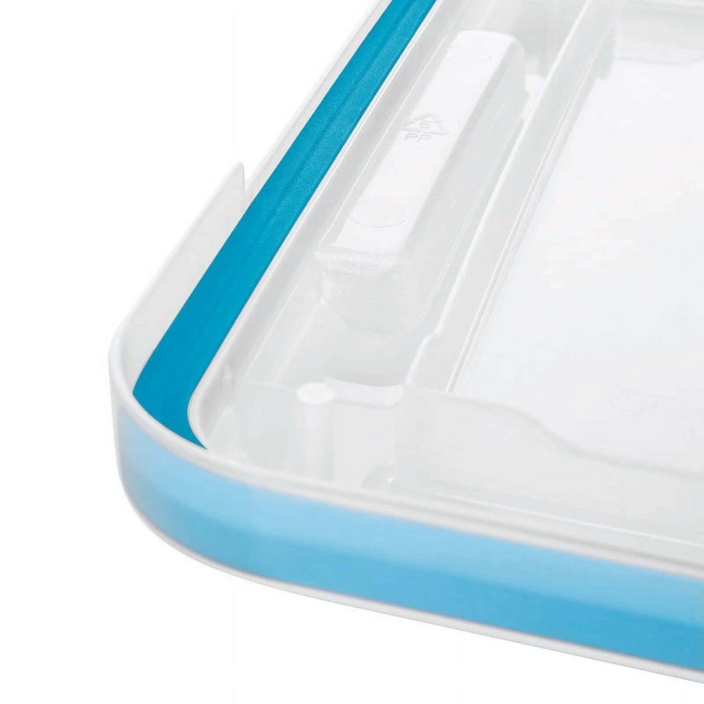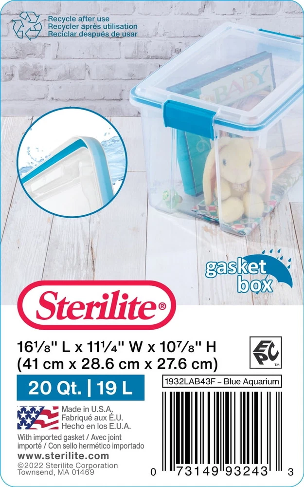 Sterilite's Gasket Box line is the ideal storage solution for keepsakes, photographs, important documents, linens, and other items that need to be stored away and protected. Gasket Boxes offer a gasketed seal to safeguard items from both air and moisture, keeping those special belongings safe from the elements, dust and pests. Durable, tight-fitting latches keep the lid secured to the base, and the clear lid and base allow contents to be easily identified, without opening the lid. The 20 Quart size is ideal for organizing school projects, paperwork and photographs that need to be protected, and fits conveniently on 16" wire closet shelving, making it ideal for organizing and storing small items in the closet. Sterilite 20 Quart Gasket Box, Weather-Resistant Clear Storage Bin with Lid, Blue Outside Dimensions: 16 1/8" x 11 1/4" x 10 7/8" Interior Dimensions at bottom: 12" x 8 5/8" x 9 5/8" Ideal solution for those items that need to be stored away and protected Gasketed seal safeguards items from air and moisture, dust and pests Durable, tight-fitting latches keep the lid secured to the base Clear base and lid allow for easy identification of contents, without having to open it BPA-free and phthalate-free