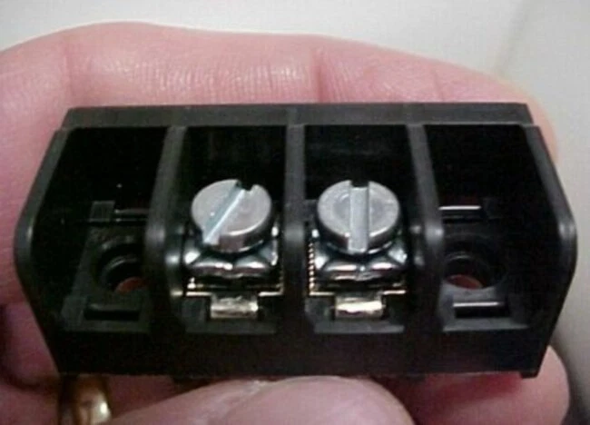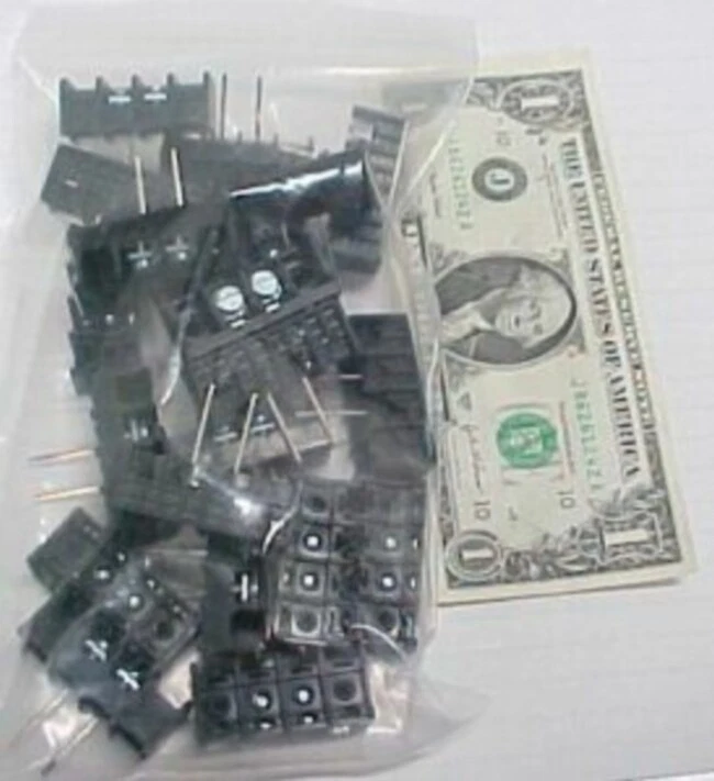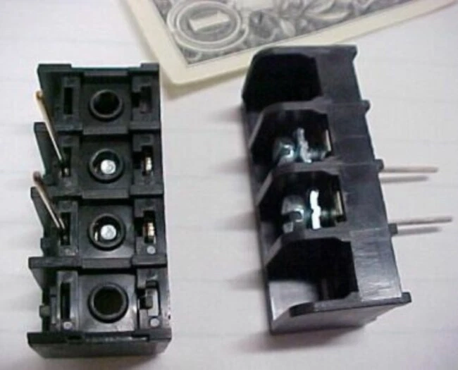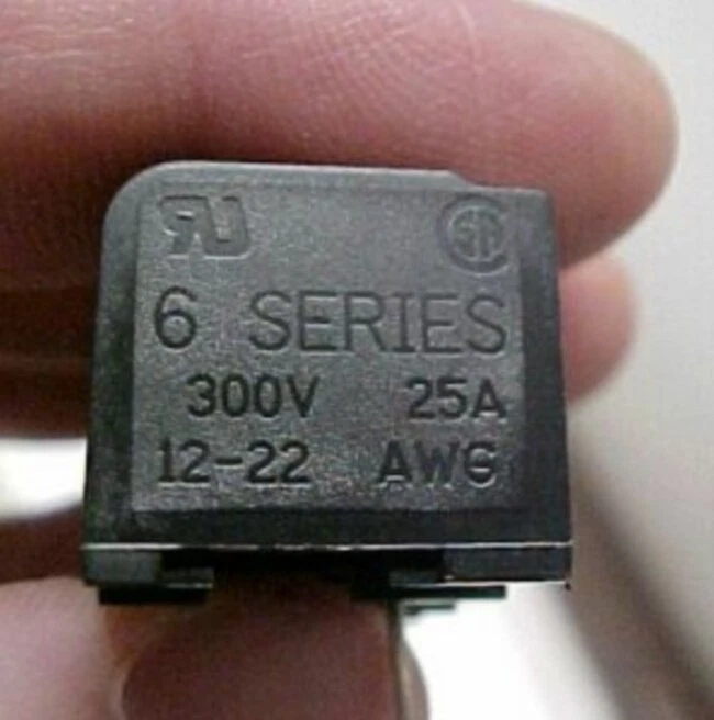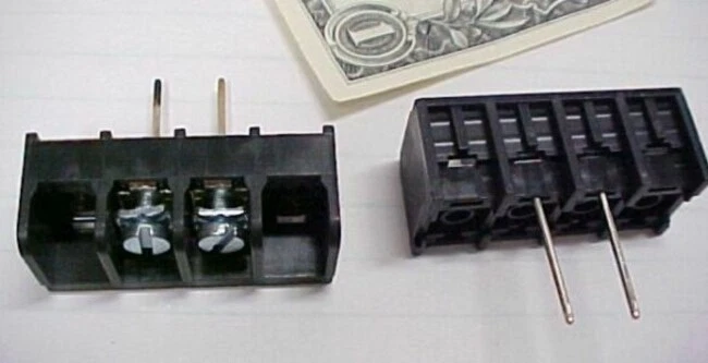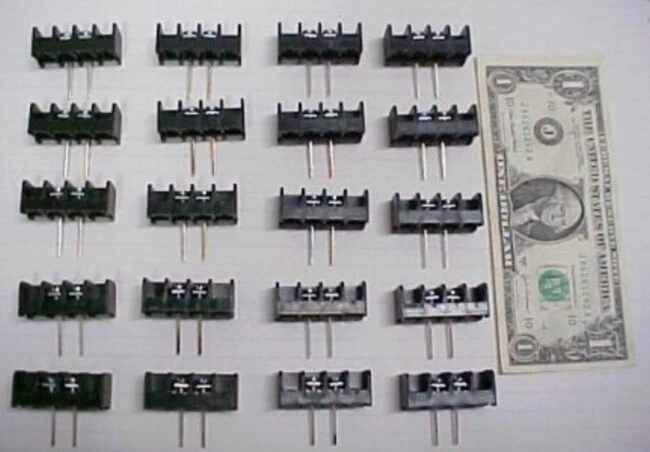 1169F7D.42 New Thomas & Betts, 6 Series, 2 Position Terminal / Barrier Blocks. Each bid quantity is for a Lot of Twenty (20) Pieces. You may bid / buy any number of lots, up to the total quantity available above. More pictures below. These were acquired in a plain box so we do not have a part number for them. According to what it says on the blocks, they are suitable for 300 volts, for #12 to #22 AWG wire, and for 25 amps. Pitch (pin spacing) is 10MM. Overall length is 1.565." Width/depth is .700." Height is .604." Pin length (below mounting surface) is .675." Mounting holes are 1.135" OC (on centers).