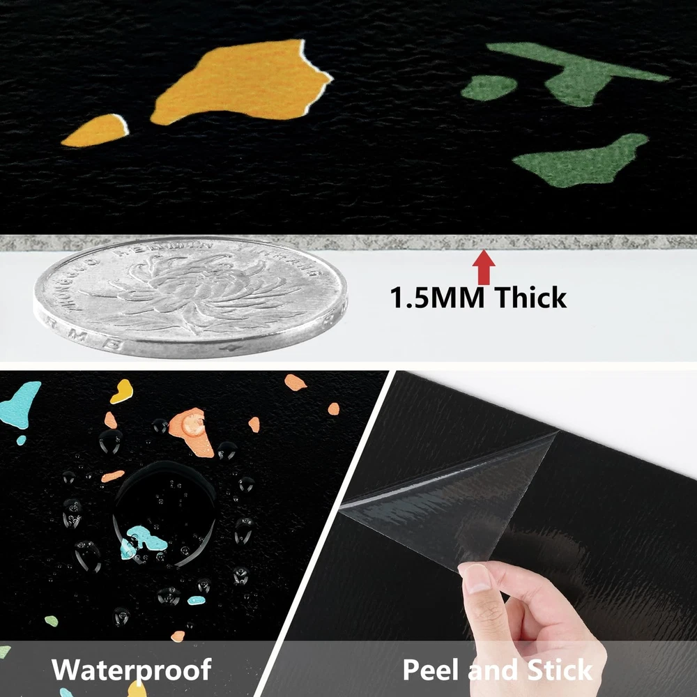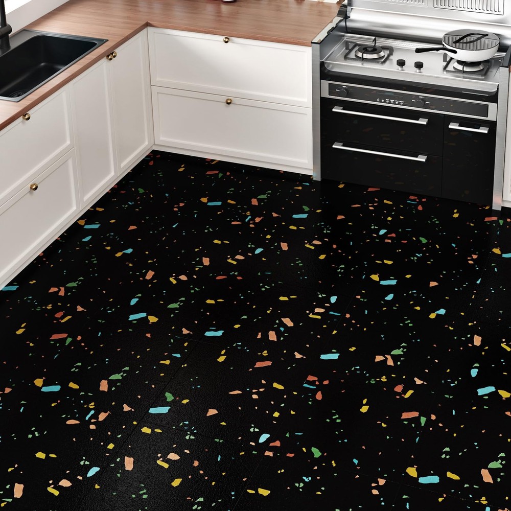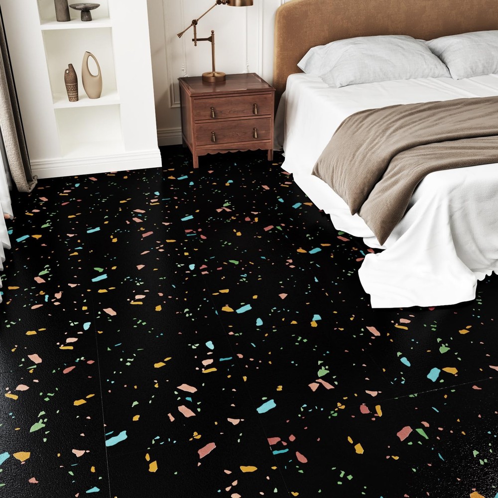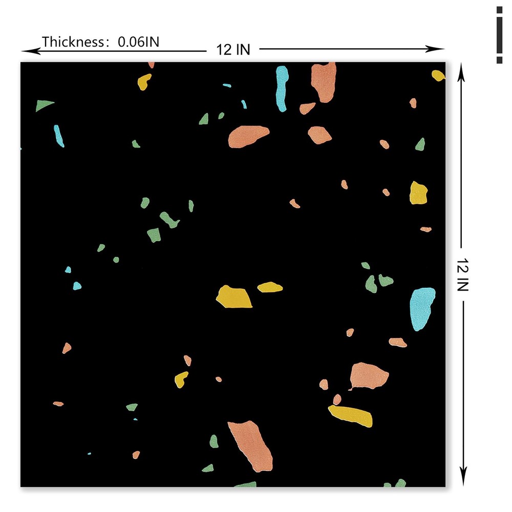 Introducing our versatile and stylish peel and stick floor tile, the perfect solution for quick and easy flooring updates! Our vinyl peel and stick flooring offers a hassle-free way to transform any space with minimal effort and maximum impact. Made with high quality materials, our vinyl flooring are durable, waterproof, and scratch-resistant, making them ideal for high-traffic areas like kitchens, bathrooms, and even garages. The black peel and stick tile design adds a touch of sophistication and modern elegance to your floors, enhancing the aesthetic appeal of any room. With the convenience of self-adhesive technology, our tile sticker can be easily installed without the need for messy glue or special tools. Simply peel off the backing and stick the tiles onto any clean, flat surface for a seamless and professional finish. These marble floor tile are perfect for renters looking for a temporary flooring solution that is easy to remove and won't damage the existing floors. The 12x12 inch size of our peel and stick vinyl flooring allows for easy customization and trimming to fit any space, making them suitable for various applications such as kitchen flooring, bathroom floors, flooring for bedroom, dance floors, and more. The kitchen tile floor can also be used to update garage waterproof flooring, creating a clean and modern look in your workspace. Not only are our floor covering practical and functional, but they are also easy to maintain and clean. The waterproof vinyl flooring is resistant to water, oil, and scratches, ensuring long-lasting durability and a beautiful finish for years to come. Say goodbye to sticky floor tiles that peel or bubble. Our self adhesive stick on flooring are designed to stay in place and withstand daily wear and tear. Convenient Size Options: Peel and stick floor tile are made of vinyl and the thickness is 1.5 mm. Available in convenient 12" x 12" tiles, we offer two versatile packs to suit your needs: A box containing 4 tiles (4 sq ft) for smaller projects or 20 tiles (20 sq ft) for larger transformations. Perfect for DIY enthusiasts seeking flexibility Premium colorful textured peel and stick flooring: Elevate your living space with our sophisticated terrazzo peel and stick floor tile that boast terrazzo textured. These vinyl flooring not only exude elegance in any room but are also remarkably durable. Black brings timeless versatility and bright style Multi-Purpose: Floor tiles peel and stick waterproof is an affordable solution for a quick and stylish floor upgrade. Floor tiles is incredibly easy to install and cut to fit, allowing for seamless integration into any layout. Peel and stick tile floor can be used in kitchen flooring, bathroom, bedroom, living room, office, garage floor, kids room, camper, warehouse, hallway, gym, dance studio, laundry room, farmhouse, etc Simple Clean & Long-Lasting Durability: Say goodbye to cumbersome floor care. With bathroom floor tile water and oil resistance, heat and scratch resistance, our stick on floor tiles are a breeze to clean. Simply wipe them down with a damp cloth or mop for effortless maintenance Self Adhesive & Removable: Please clean the surface before use and make sure to apply the floor sticker on a flat, dry and clean floor. No grouting or special tools needed for install. To remove waterproof flooring, soften the glue with a hair dryer, you can easily lift it off by inserting a pry bar or chisel into the edge of the renter friendly floor peel and stick. Suitable for renters and apartments