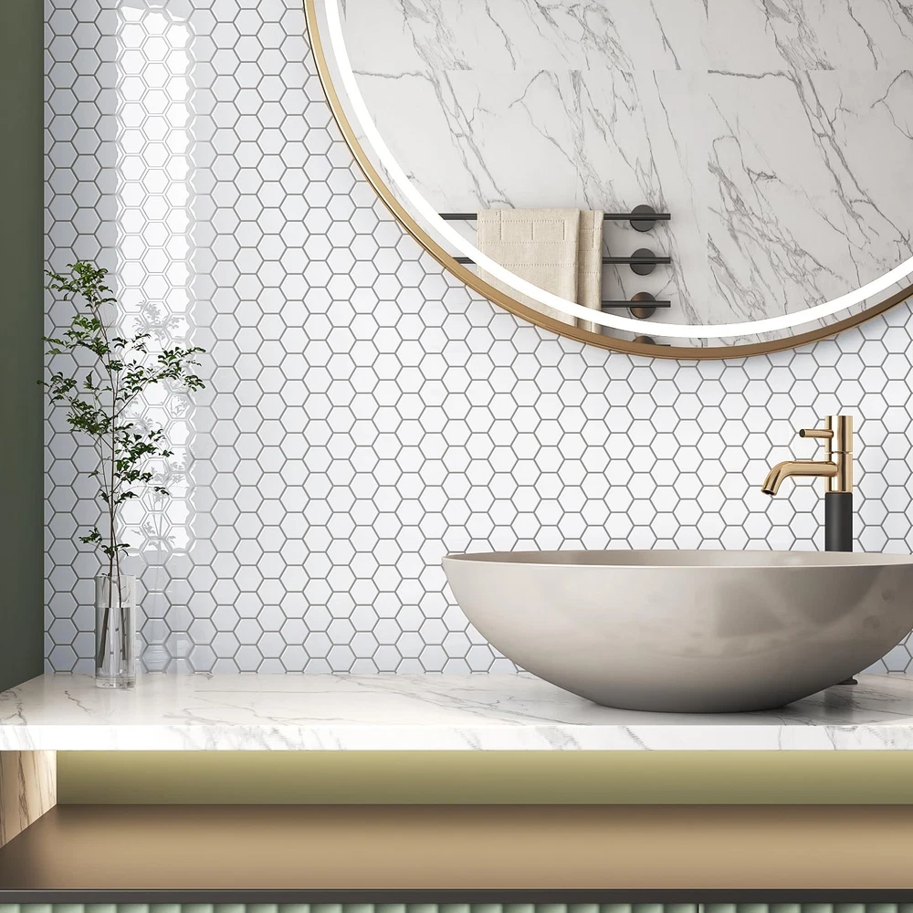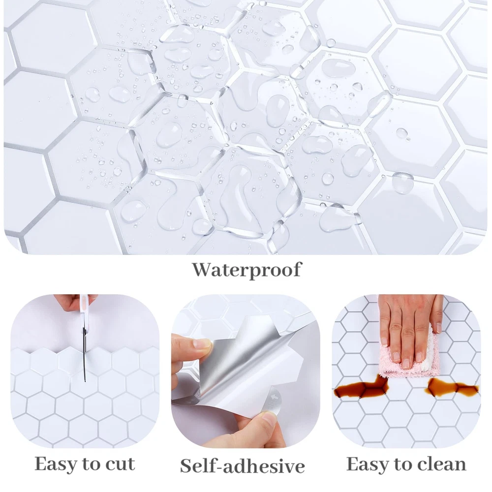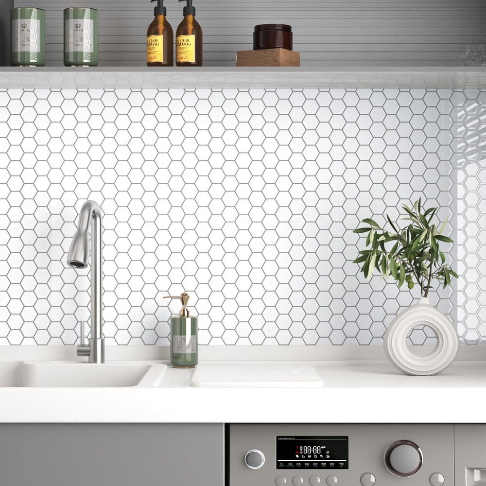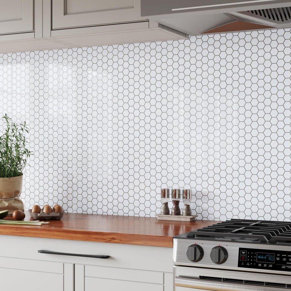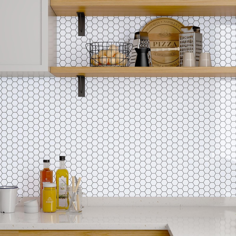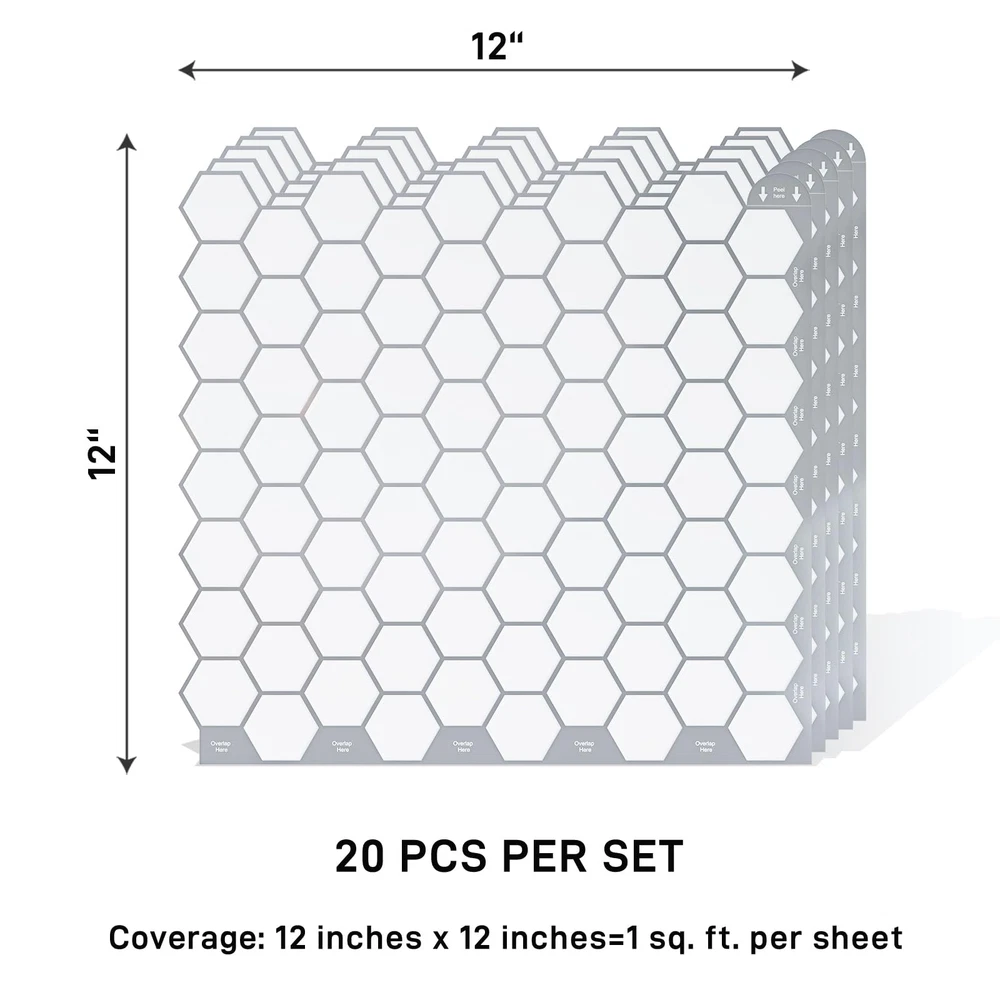 Size & Material: Each wall tile measures 12''x12'', thickness is 0.05'', 20 sheets per pack, total covers about 20 square feet. Small white hexagon design, silver grout. Realistic tile effect with 3D texture. Made of premium vinyl, glossy finish, flexible, light weight, durable, not easy to crack, not fade over time Features: Kitchen backsplash peel and stick is waterproof, oil-proof, dust-proof, moisture-proof, easy to clean and maintain. Heat resistant, withstand high temperature around the stoves, protect the walls from splashes and oil. Removable adhesive tiles, no residue after removal, no damage to walls, friendly to renters and homeowners. Good adhesion, thick and durable, providing great covering power Easy to Install: Just peel and stick! No extra glue, no grout, no mess, no special tools and no experience needed. Quick and inexpensive solution to transform your living space. Flexible and can be bent around the corner. Easy to cut into any sizes, meet your different needs. Repositionable when making mistake, friendly to beginners. There are detailed installation instructions on the box Application: Stick on tiles are versatile and can be used in a variety of settings. Peel and stick backsplash for kitchen, kitchen stove backsplash tiles, peel and stick bathroom wall tile, decorative tile, vanity backsplash, peel and stick tile for shower walls, wall tiles peel and stick for laundry room, kitchen island walls, fireplace, bathroom backsplashes, bedroom walls, Living Room, RVs, stairway, hallway, pantry Tips: Self stick wall tiles can be used on flat and smooth surfaces. Textured and rough surfaces are not recommended. Please consider 10% cutting loss and purchase enough tiles at one time to avoid slight color differences between batches. If you have any questions about our wall tiles, please feel free to contact us before or after your purchase. We will be happy to assist you