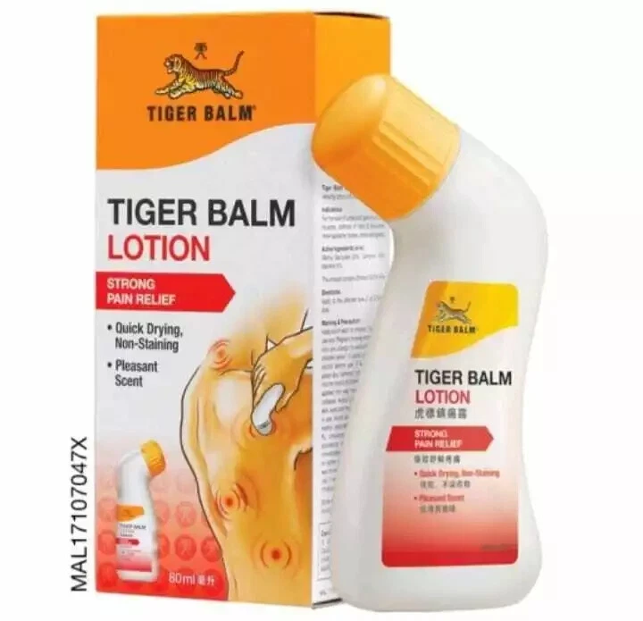 product description Leave pain behind with new Tiger Balm Lotion. Made with a unique Tiger Balm formulation, its quick drying, has a pleasant scent and comes in a handy bottle that can be applied directly to harder to reach places. Grab one and you wont look back. - Extra-strength pain relieving lotion - Convenient applicator for hard to reach areas - Pleasant scent, quick drying and non-staining liquid formulation - 80ml
