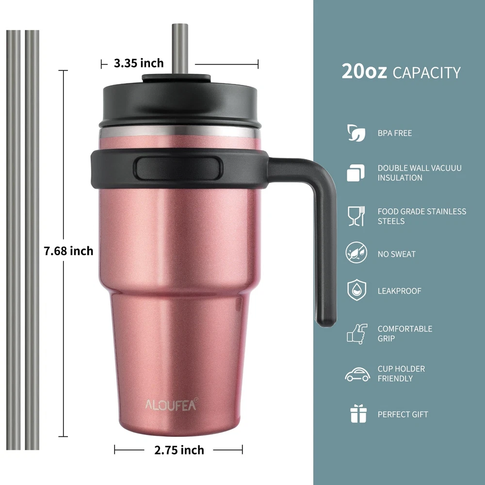 20 OZ COFFEE MUG TUMBLER: The water tumbler with handle is made from 18/8 food-grade stainless steel, it is durable, easy to wash, unbreakable, compact and portable. With a unique 2-in-1 sip and straw lid, a lid for every drinking need CUPHOLDER FRIENDLY: The bottom of the coffee cup has a tapered shape that fits perfectly into car cup holders, ensuring you can enjoy your essential hydration on even the busiest of days KEEP DRINKING FRESH: The double-walled tumbler vacuum insulation design slows down heat transfer to the outer walls, ensuring your drink stays cold or hot until the very last sip COMFORTABLE HANDLE: The coffee mug adopts the design of an open-ended large handle, easy to hold, especially for those with grip troubles, makes it easy to carry and can easily hold and take a one-handed sip BEST COMPANION FOR LIFE: The stylish colors and high-tactile insulated coffee tumbler. Not only is it perfect for daily use, work and travel drinking but also as gifts for birthdays, Thanksgiving, Christmas, friends, teachers, colleagues and sisters