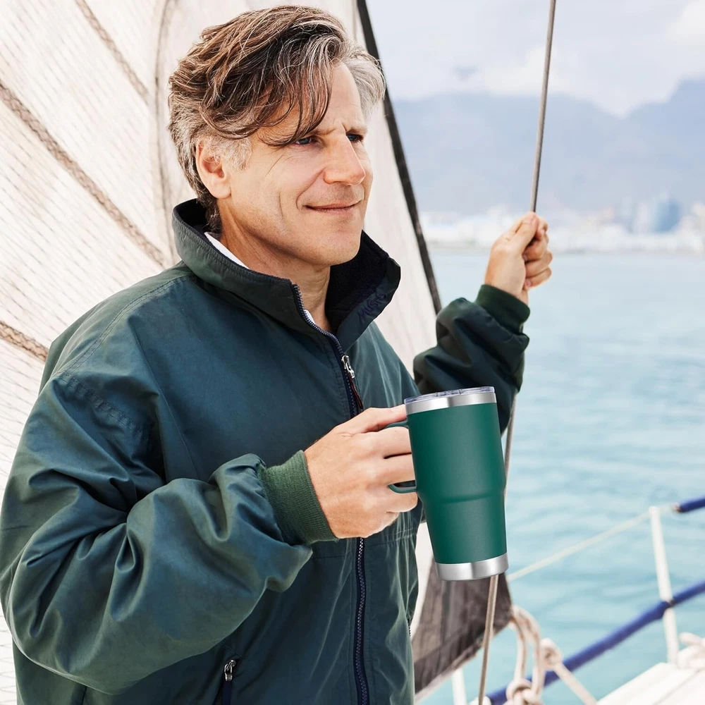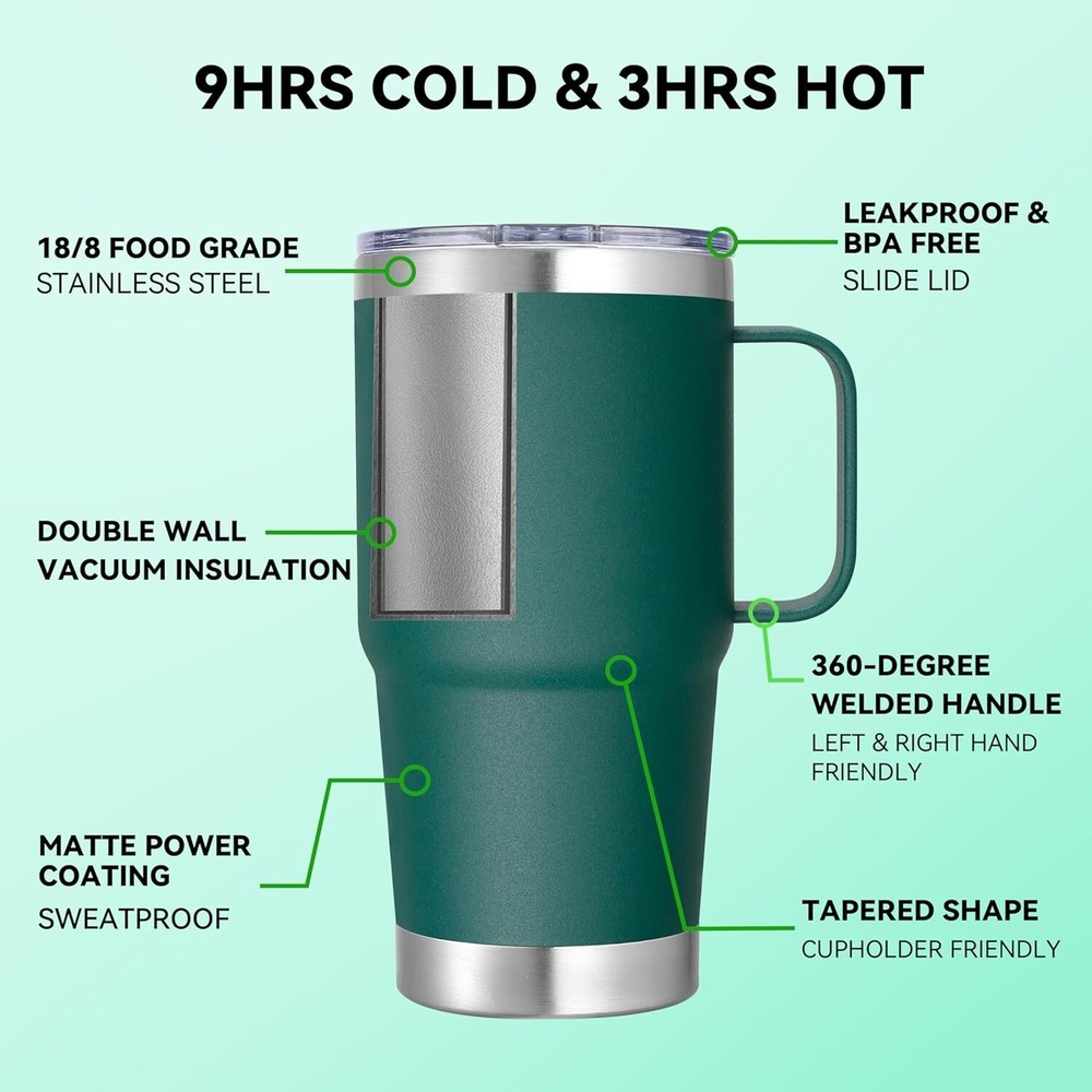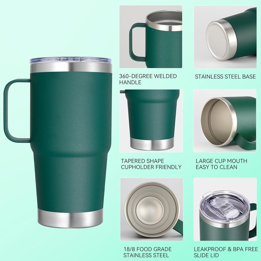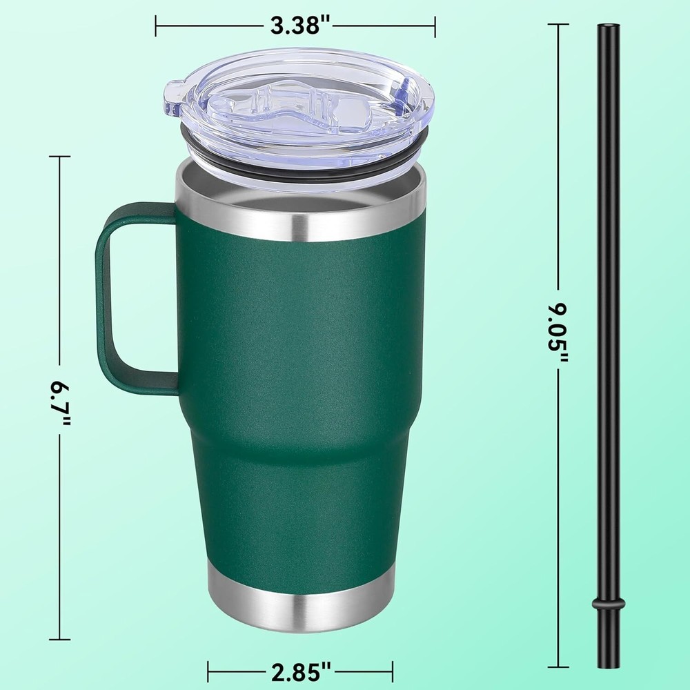 20 oz Stainless Steel Tumbler with Handle Bulk Metal Insulated Tumblers Travel Coffee Mug with Handle Double Wall Tumbler Cup with Lid and Straw, New Dark Green 12 Pack High Quality And Easy To Hold: The 20 oz travel coffee mug is made of thickened 304 18/8 stainless steel. Electro polished inside make you every sip of water pure and sweet. Matte powder coating outside is sweatproof. Equipped with a sturdy 360°welded handle let you easy to hold the coffee travel tumbler Hot And Cold Insulated Tumbler: 20oz stainless steel tumbler is double walled and vacuum insulated. It's cool to touch when filling with hot water also keeps your favorite beverage hot for 6 hours and cold for 12 hours. 20oz Capacity is just fine for daily use Multiple Color Options: The is crafted with stylish color powder coating, gives you multiple color options. Also make the tumbler advanced matte texture, delicate and sweat proof. Let you have a good mood when you use the water cup every time Cupholder Friendly: The travel coffee tumbler 20oz is designed with a tapered shape which fits most car cup holders, Diameter " large cup mouth makes it easier for you to clean the coffee mug Stylish and Practical Gift: travel coffee mug as fashion gifts for women, men, mom, dad, gifts on Christmas, Valentine's Day, Mother's Day, Father's Day, birthday, anniversary, wedding, Thanksgiving Day, new , holiday. Classic stocking stuffers for women men mom dad and nice gifts for employees from boss company Coffee Mug: 20oz travel coffee mug comes with 1 * slide lid and 1 * reusable plastic straw. We also provide tumblers bulk option Welcome to Store We focus on creating high quality 18/8 stainless steel tumblers.