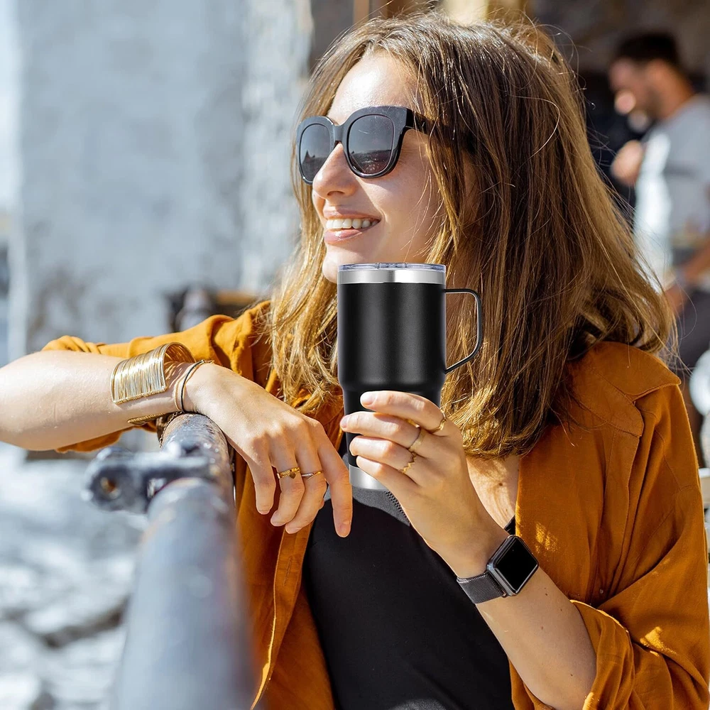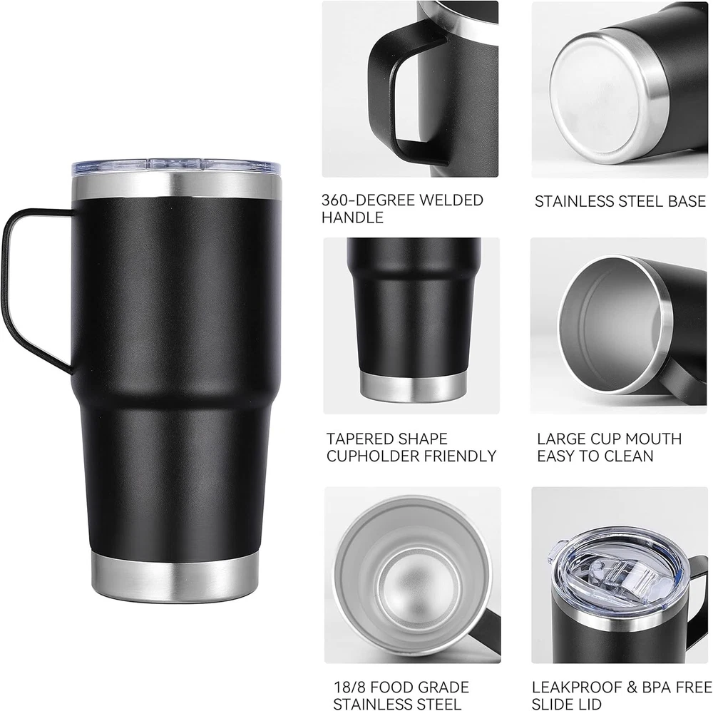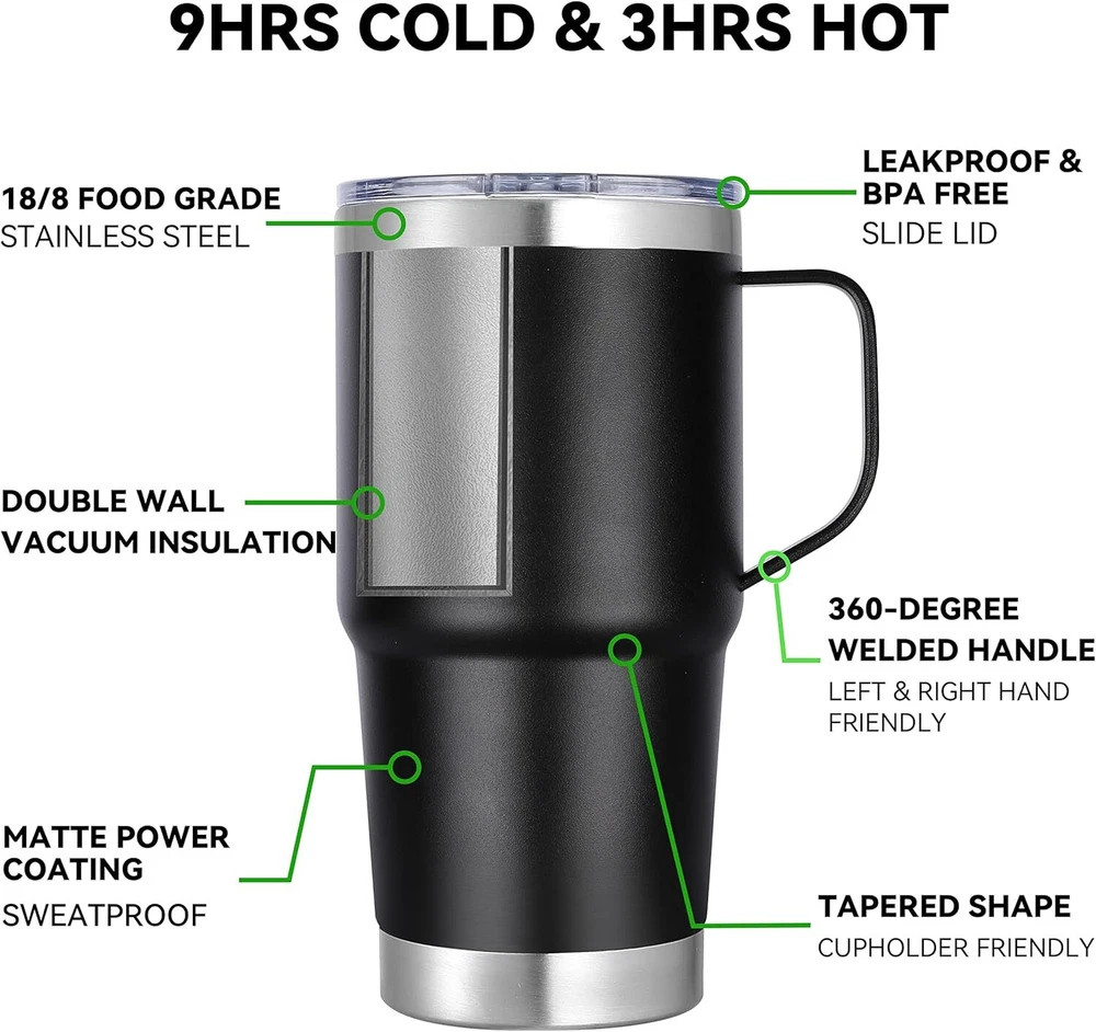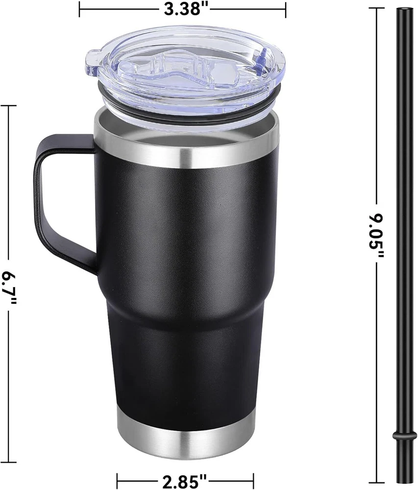 Product Details Brand: Abbrevi Color: Black Special Feature: Sliding Lid, Vacuum Insulated, Double Wall Style: Modern Theme: Travel Recommended Uses For Product: Travel, Nursing, Home Included Components: Lid, Straw Specific Uses For Product: Cold Drinks, Hot Drinks Shape: Round Pattern: Solid Product Care Instructions: Hand Wash Only Age Range (Description): Adult Material Feature: Insulated Reusability: Reusable Unit Count: 1.0 Count Product Dimensions: 3.38"W x 6.7"H Material Type Free: BPA Free Number of Items: 1 Finish Type: Matte Manufacturer: Abbrevi Size: 1 Item Weight: 15.5 ounces Country of Origin: China Item model number: 20 oz tumbler with handle MaterialCapacity: Stainless Steel1.3 Pounds OccasionItem Weight: Mother's Day, Christmas, Father's Day, Birthday, ThanksgivingMother's Day, Christmas, Father's Day, Birthday, ThanksgivingMother's Day, Christmas, Father's Day, Birthday, Thanksgiving See more 0.44 Kilograms High Quality And Easy To Hold: The 20 oz travel coffee mug is made of thickened 304 18/8 stainless steel. Electro polished inside make you every sip of water pure and sweet. Matte powder coating outside is sweatproof. Equipped with a sturdy 360°welded handle let you easy to hold the coffee travel tumbler Hot And Cold Insulated Tumbler: 20oz stainless steel tumbler is double walled and vacuum insulated. It's cool to touch when filling with hot water also keeps your favorite beverage hot for 6 hours and cold for 12 hours. 20oz Capacity is just fine for daily use Multiple Color Options: The 20 oz tumbler with handle is crafted with stylish color powder coating, gives you multiple color options. Also make the tumbler advanced matte texture, delicate and sweat proof. Let you have a good mood when you use the water cup every time Cupholder Friendly: The travel coffee tumbler 20oz is designed with a tapered shape which fits most car cup holders, Diameter 3.38" large cup mouth makes it easier for you to clean the coffee mug Best Gift Idea: Each 20oz coffee travel mug comes with 1 * slide lid and 1 * reusable plastic straw. We also provide tumblers bulk option. The classic coffee tumbler is a stylish and practical gift for your friends, families, colleagues on Christmas, birthday, Valentine's Day, Mother's Day, Father's Day