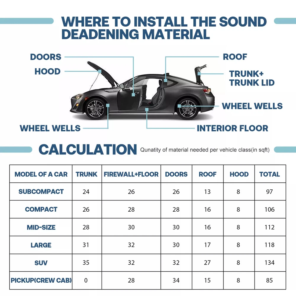 Description: Material: Aluminum & Foam & Adhesive Backing Color: Silver&Black Recommended Install Temperature: -10°C ~ +60°C Resistance Temperature Range: -40°C ~ +300°C Waterproof & Fire Resistant: Yes Thickness:10mm=394mil=0.394” Dimension: 50*30cm (20"×12") Quantity: 12pcs Specifications: Yongl73 Best choice of motor parts 20 sqft Sound Deadener Car Insulation Heat Shield Dampening Self-Adhesive Mat US Description: Material: Aluminum & Foam & Adhesive Backing Color: Silver&Black Recommended Install Temperature: -10°C ~ +60°C Resistance Temperature Range: -40°C ~ +300°C Waterproof & Fire Resistant: Yes Thickness:10mm=394mil=0.394” Dimension: 50*30cm (20"×12") Quantity: 12pcs Specifications: Features: car heat / sound insulation Function: Car sound insulation Temperature Rating: 200 Degrees nominal Outer Material: 99.4% pure polished aluminum reinforced facing Reinforced / Crush Resistant: Yes Mildew & Mold Resistant: Yes Water resistant: Yes Non-toxic: Yes Features: 【Reduce road noise】 If you often drive on uneven roads or on noisy highways, sound insulation can bring you more comfort. It will reduce the noise of roads and other drivers. It will make your driving smoother and have the added benefit of better media listening 【Enhance the music】 Use sound insulation to make your radio clearer. You will no longer have to turn it up because of traffic noise. Not only is it good for music, but audio books and telephones will sound better, too 【Improve privacy】 If you don't want other people on the road to hear what you're listening to, the sound insulation prevents the noise from escaping. Sound insulation will help you 【Warm in winter and cool in summer】 The car insulation will help reduce your interior temperature in the summer, and in winter, the heat insulation can keep you warm in the car, which is conducive to warmth reduce engine/tunnel/console 【Protect car paint】 In summer, the temperature is too high, the engine runs at high speed and accelerates for a long time, and generates heat, which can easily cause the aging and fading of the car paint; the heat insulation pad can protect it 【Increase the life of the car】 In summer, due to high temperature and long-term driving, it is easy to cause the cabin to heat up and cause a fire, which may seriously damage your car. Using heat insulation pads can extend the life of the car Installation: Step 1 : Remove the door panels Step 2 : Install the screws back in original place, it will easy be found when you mount, avoiding holes be covered Step 3 : Make insulation materials and sheet metal firm fit, and play best adhesive, damping performance Step 4 : According to the effect you want choose Heat and Noise Insulation Cotton. Step 5 : You can also use on car roof floors, hood , firewall, chassis, trunk room, trunk lid and so on.. Do not cover the chassis wiring or air holes. Item Specifics Brand Modigt Type Car Truck Noise Reduce Dampening Material Aluminum & Foam & Adhesive Backing Placement on Vehicle Cargo/Trunk/Bonnet/Dashboard/Under Seat/Doors Color Silver&Black Superseded Part Number Heat Sound Deadener Insulation Mat Universal Fitment Yes Manufacturer Part Number Car Heat / Sound Insulaiton Deadener OE/OEM Part Number Deadening Material Insulation Cars & Truck Items Included 12 pcs 20" X 12" Sound Deadener Fitment Type Direct Replacement Vintage Car Part Yes Manufacturer Warranty 2 Years Performance Part Yes Easy Installation All Curves and Corners Without The Need For Heat Application 1 Turbo,Front Fender,Rear Fender Application 2 Hood,Firewall,Doors,Floor,Roof Application 3 Trunk Lid,Trunk Room,Engines,Tailgate Application 4 Ceiling,underneath bonnets,Underfelt Application 5 Underlay,Boot,Panel,Chasis Application 6 Automotive,Motorhome,Camper,Restorer Application 7 Classic Car,Race Car,Stock Car,Old Vintage Car,Pickup,SUV,Caravan Application 8 Van,Truck,limousine,Camper,Boat,Motor Homes,School Bus,Low Rider Application 9 Muscle car/Hot rods/Corvettes/Imports/Tuners/Street rods/Rat rods Application 10 Cockpit Floor, Tailgate, Firewall U Type Wall Application 11 For Use in The Application Of Any Sound Deadening Application 12 Car& Home Interior Heat Sound Deadener Insulation Function 1 Protects Paint from Blistering Function 2 Reduce the road/ Engine/ Wind noise Function 3 Dustproof, Waterproof, Anti-moisture Features 1 Noise Reduction, Easy to Cut, Self-Adhesive Features 2 Easy Installation, Waterproofing, Fireproofing Features 3 Protects Paint from Blistering, Anti-moisture Thickness 10mm=394mil=0.394” Size 12PCS X 20'' X 12''=20sqft Surface Finish As picture shows Product status 100% brand new Item Width 50cm=20inch Item Length 30cm=12inch For More Detail Please View in Description Payment 1. It will be much appreciated that you finish your payment asap or it will make UPI (unpaid item case) on your account leading to be suspended or restricted by eBay when those UPI cases carry over to certain amount. 2. Any problems please contact us for more details. Shipping 1. All items will be shipped to buyer's ebay address. 2. All items will be shipped within 24-48 working hours upon receipt of payment, and multiple items will be combined shipping. 3. In most cases, delivery takes around 3-5 business days, it's highly depended on the efficiency of the shpping carrier. If your item doesn't arrive on time, please contact us immediately for further assistance. Please note there is no local pickup service available. Returns If you are not 100% satisfied with your purchase, you can return the product and get a full refund or exchange the product for another one. Please Note: Please write us a message before your return, otherwise we will not accept the package. Any product you return must be in the same condition you received it and in the original packaging. Contact Us 1. We care about our valued buyers, if you have any questions, our Customer Service staff will be very glad to help you. We try our best to r