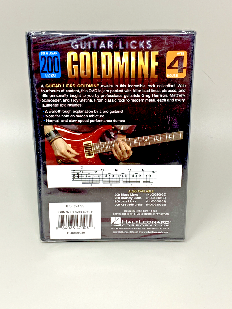Studio: Hal Leonard MPN: HL00320930 Release Year: 2011 Director: na Producer: na Music Artist: na Rating: NR Genre: Special Interest-Instructional Run Time: 254 minutes Edition: Standard Edition Aspect Ratio: 4:3 Country/Region of Manufacture: United States Features: Full Screen Movie/TV Title: Guitar Licks Goldmine: 200 Rock Licks Region Code: DVD: 0/All (Region Free/Worldwide) Type: DVD Subtitle Language: na Cinematic Movement: na Language: English Format: DVD Franchise: na Case Type: Tall/DVD Case gtin13: 0884088470081 Actor: na Video Format: NTSC UPC: 0884088470081 Season: na Sub-Genre: Music Video (Concert/Performance)