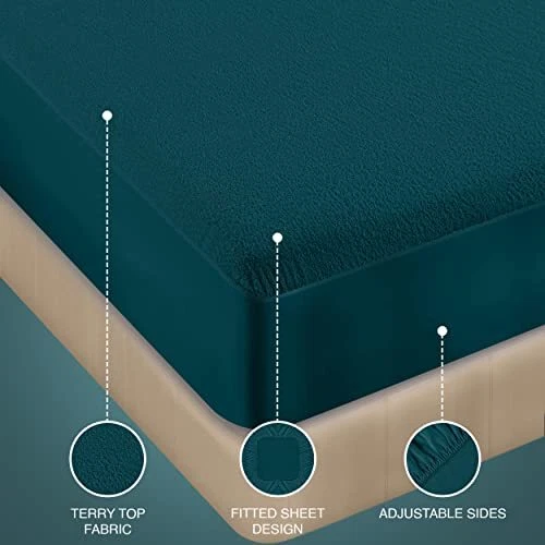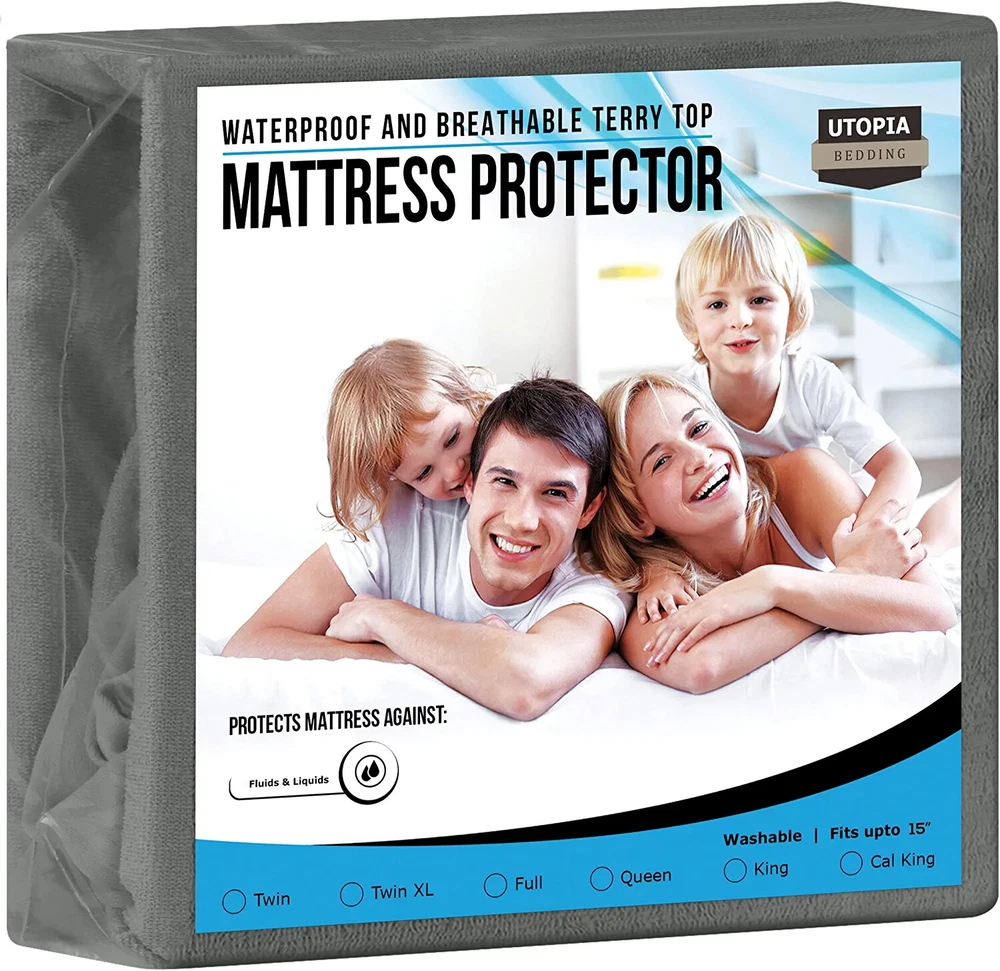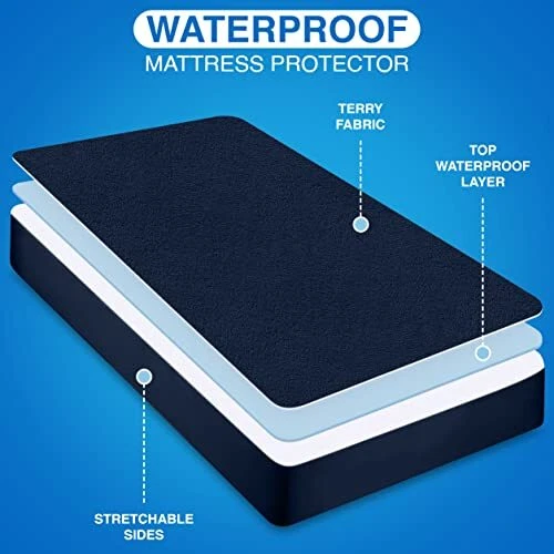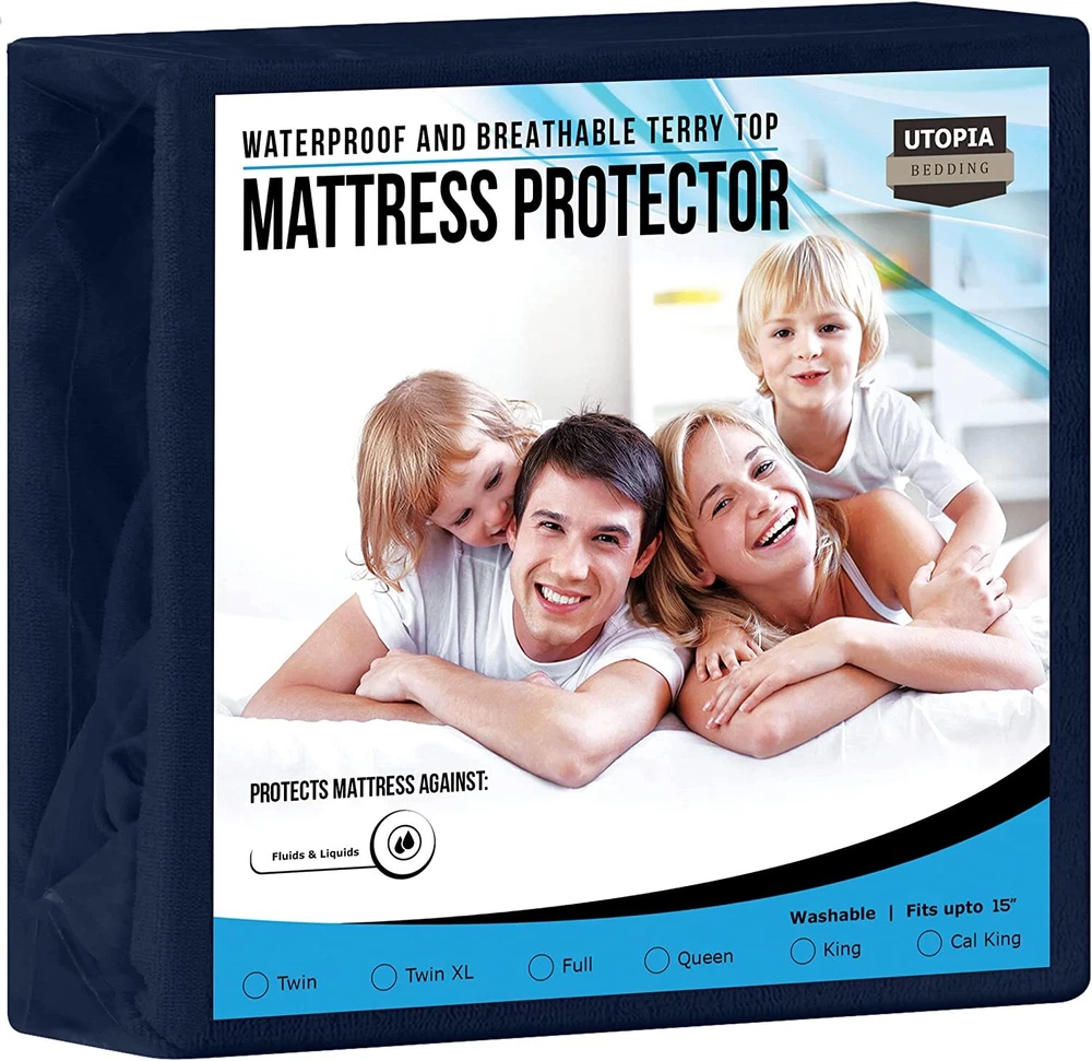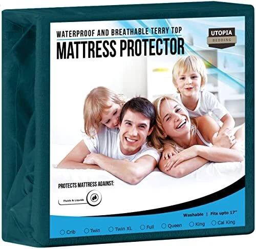 MATTRESS PROTECTOR - Fits Twin XL size mattress perfectly with dimensions 39 inches by 80 inches by 15 inches, featuring professionally turned hems and deep fitted pockets Fits Queen size mattress perfectly with dimensions 60 inches by 80 inches by 17 inches, featuring professionally turned hems and deep fitted pockets Fits Twin size mattress perfectly with dimensions 39 inches by 75 inches by 15 inches, featuring professionally turned hems and deep fitted pockets Fits California King size mattress perfectly with dimensions 72 inches by 84 inches by 17 inches, featuring professionally turned hems and deep fitted pockets Fits Full size mattress perfectly with dimensions 54 inches by 75 inches by 15 inches, featuring professionally turned hems and deep fitted pockets Fits King size mattress perfectly with dimensions 78 inches by 80 inches by 17 inches, featuring professionally turned hems and deep fitted pockets COMFORT SURFACE: Soft blended surface is extra absorbent, cozy and breathable. The specially designed waterproof top and high quality seam construction stops liquids from passing through. FITTED STYLE ALL AROUND ELASTIC - Mattress protector with a fitted style all round elastic band creates a secure fit on mattress depths WATERPROOF PROTECTION - Mattress protector protects your mattress from unwelcome spills and keeps your mattress clean and safe. High quality TPU backing resist any leakage into the mattress CARE INSTRUCTIONS - Machine wash cold on gentle cycle; tumble dry low; do not iron; do not bleach; do not use fabric softener Product Description January February March April May June July August September October November December 1 2 3 4 5 6 7 8 9 10 11 12 13 14 15 16 17 18 19 20 21 22 23 24 25 26 27 28 29 30 31 2022 2021 2020 2019 2018 2017 2016 2015 2014 2013 2012 2011 2010 2009 2008 2007 2006 2005 2004 2003 2002 2001 2000 1999 1998 1997 1996 1995 1994 1993 1992 1991 1990 1989 1988 1987 1986 1985 1984 1983 1982 1981 1980 1979 1978 1977 1976 1975 1974 1973 1972 1971 1970 1969 1968 1967 1966 1965 1964 1963 1962 1961 1960 1959 1958 1957 1956 1955 1954 1953 1952 1951 1950 1949 1948 1947 1946 1945 1944 1943 1942 1941 1940 1939 1938 1937 1936 1935 1934 1933 1932 1931 1930 1929 1928 1927 1926 1925 1924 1923 1922 1921 1920 1919 1918 1917 1916 1915 1914 1913 1912 1911 1910 1909 1908 1907 1906 1905 1904 1903 1902 1901 1900