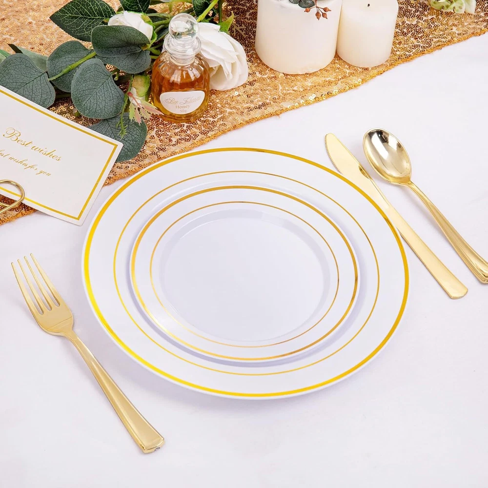 Color Gold Special Feature BPA Free Occasion Christmas, Wedding, Party, New Year, Birthday About this item 100% BPA Free: We promise the materials of plastic plates for party are BPA-free and no-toxic. These gold plastic plates are made of food-grade, reusable plastic. If you want reuse these white and gold plastic plates, just simply wash them with water. These plastic plates are also very ease and comfortable to use. Elegant Design:Our disposable plastic plates use the most classic and elegant design, white plates with gold rim, these plastic party plates will definitely give a deep impression for your guests at the event. Ideal for Any Occasions: This pair of gold disposable plates are suitable for dinner,dessert,salad,cake and appetizer. The elegant plastic plates are sufficient for 100 guests, also perfecting for parties, birthday, weddings, Thanksgiving, Christmas and others any occasions. Great Combination: You will receive a great plastic party plates set, including 100 gold dinner plates and 100 gold salad plates. After a fun,if you don't want waste you precious time, you can choose to discard these fancy wedding plates or reuse them. The decision is yours. Material Plastic Color Gold Special Feature BPA Free Occasion New Year, Party, Christmas, Wedding, Birthday Style Classic Shape Round Seasons All Seasons Product Dimensions 16.1"L x 7.2"W x 10.6"Th Recommended Uses For Product Dinner, Dessert, Salad, Cake, Appetizer Number of Pieces 200 Pattern Striped Product Care Instructions Hand Wash Only Size 200 Pcs Finish Type Glossy Is Microwaveable No Material Feature Disposable Is Dishwasher Safe No Included Components Gold Plastic Plates Theme Novelty Embellishment Gold Rim Product Name Dinner Plate Reusability Disposable Package Type Box Set Pattern Gold Plastic Plates Unit Count 200.0 Count Item Weight 14.26 pounds