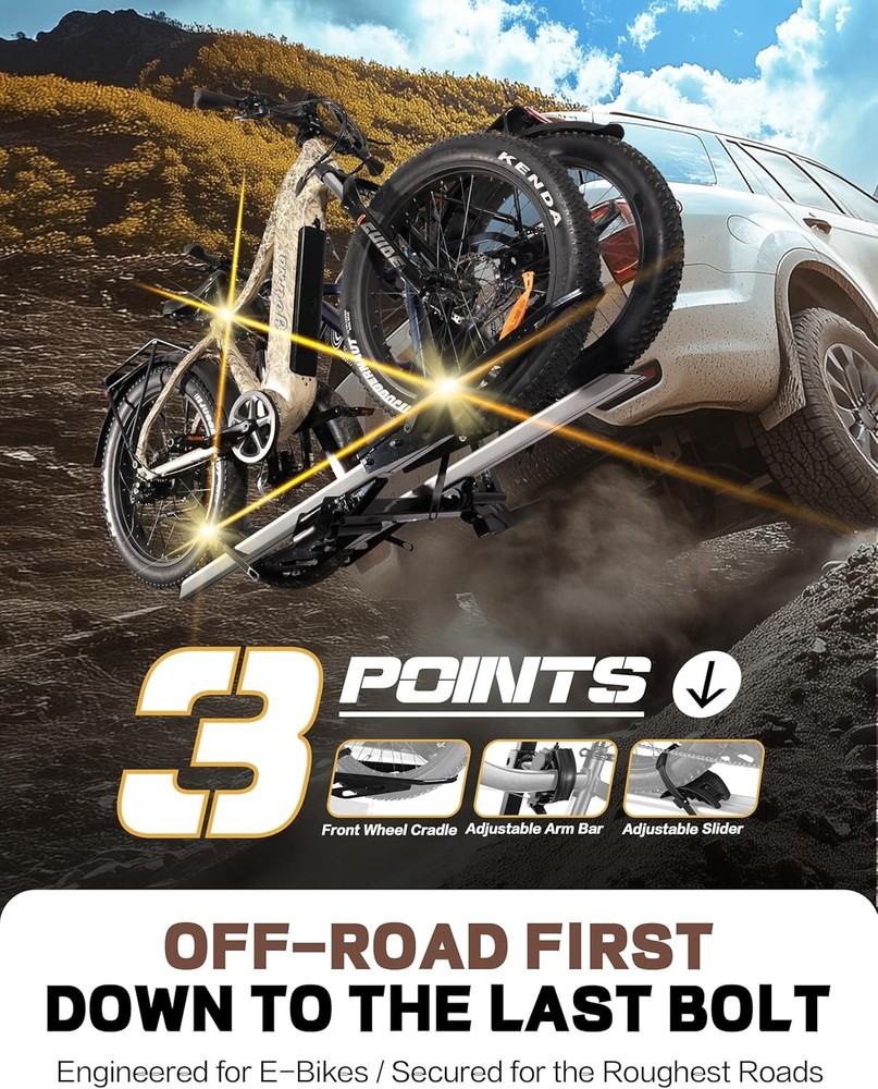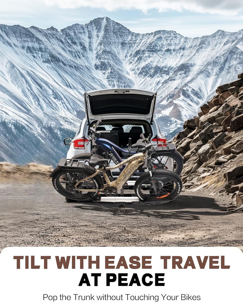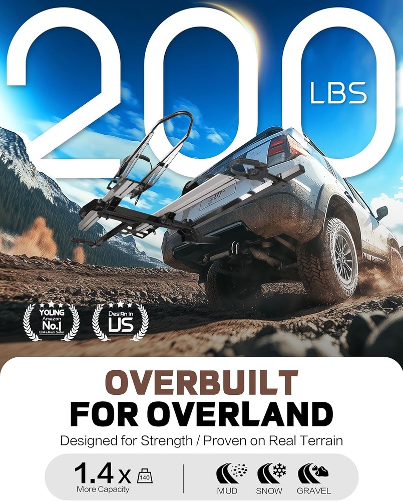 200 LBS. Hitch Mount Ebike Rack for Fat Tire Electric Bikes, Mountain Bicycles, fits Cars, SUVs, RVs, Trucks, Trailers with 2 Inch Receiver Item Description About this item DURABLE and SAFE: Young Electric bike rack is constructed with reinforced steel and aluminum which makes it durable and powerful enough to carry 2 bikes weighing 100 lbs each. Comes with 2-arm fix, patent secure wheel cradles and anti-wobble structure, that secure your E-bikes in place without swaying and knocking against vehicle. 200 LB TOTAL CAPACITY: Built for durability and strength, this bike rack boasts an impressive 200lbs capacity, securely accommodating heavier electric bikes or multiple conventional bicycles with ease. Trust in its robust construction for reliable, strain-free transportation. RV Approved: Specially designed for RV compatibility, this bike rack is RV Approved, ensuring hassle-free installation and safe, stable transport of your bicycles while on the road. Travel with confidence knowing it's tailored for motorhome adventures. Easy to use: Effortlessly load and secure bikes with our user-friendly bike rack. Its intuitive design allows for quick attachment and detachment, comes with convenient handle device that allows for folding the bike rack with one hand. 2 INCH HITCH RECEIVER: ONLY fits vehicles with 2" receivers, the rack is sturdy and does not wobble easily. Most parts come pre-assembled for easy installation. Parts including locking hitch pins, instruction manual and hardware.