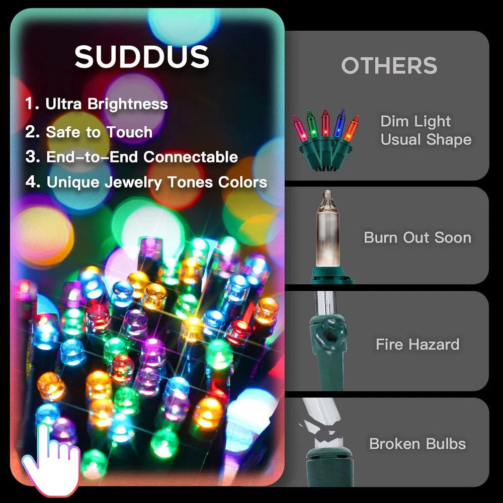 Store New Arrivals Add to Favorite View Feedback Contact Fast deliveries to the customer's home Quality customer service John Make the customers happy! 200 LED Multicolor Christmas Lights, 8 Modes Blinking Christmas Tree Lights with Remote, Colored Christmas String Lights for Outdoor Indoor Party Decoration Description π[Long Length and END-TO-END]: 200 LED multi colored Christmas Lights 66ft long, plus a 10ft extension cord. The updated mini outdoor Christmas lights are end-to-end connectable. It could be extended to a maximum of 6 light strings (total 396ft/1200led). Choose more than one, these extra-long strings of lights can be used to decorate any big scene you want. Just need 1 remote to control all lights and 1 socket for electricity. π[Super Bright and 4 Brightness Levels]: Super brightness Christmas tree lights to give your Christmas decoration icing on the cake. Both day and night, it is particularly conspicuous. The Christmas lights have 4 brightness levels, you just need to press the dim +/- button on the remote for settings of 100%, 75%, 50%, or 25%. π[5 Gorgeous Colors and 8 Modes]: SUDDUS blinking christmas lights have five unique colors: lime green, aquamarine, rose, ruby, and orange. SUDDUS exclusive multi-color Christmas lights have 5 superior jewelry tones colors, and higher quality. This 200led colored Christmas lights have 8 lighting modes: steady on and 7 flashing modes (comb, in waves, sequential, slo-glo, chasing/ flash, slow fade, and twinkle/ flash). Creating a colorful and twinkling dream world for you. π[Waterproof and Safety]: IP44 Christmas string light is waterproof (Both the plugs and end-to-end connectors have caps to block the ingress of water), suitable for indoor and outdoor decorations, including trees, pathways, garlands, houses, roofs, balcony, party, porch, garden and anywhere. UL588 safety-certified Christmas lights come with 3 strands of wires, which can withstand long working times. So it will be more durable. It will not have an overheating problem. Save to touch any time. π[Remote Control and Timer Function]: The range of the remote control is 32ft. With a wireless remote, you donβt need to walk across your yard to control the lights. The updated XMAS lights have 3 different Timer Functions to meet your various needs. When you press this button, you can free your hands and it will work functionally. Product Description Holiday Joy Shines Brightest with Festive Christmas Lights! The video showcases the product in use. The video guides you through product setup. The video compares multiple products. The video shows the product being unpacked. The colorful and twinkling lights bring joy to children and families, often becoming a source of wonder and excitement. Christmas lights are not just decorations; they become a backdrop for family photos and cherished memories. A Tree Filled with Kids' Holiday Delight Christmas Comfort Begins at the Fireplace's Glow Make Your Home's Yard the Talk of the Town From lawn to porch, create a merry winter wonderland with SUDDUS Christmas Lights! A well-decorated Christmas yard becomes a visual focal point in the community, drawing the attention of neighbors and passersby. It becomes a beacon of holiday cheer and celebration. IP44 Waterproof No matter what the weather, this Christmas light can work normally. Perfect for Christmas trees, garden decorations, balconies, shrubs, and fences. Safe to Touch It is safe to touch it at any time, do not worry about overheating. The light comes with 3 strands of wires, which can withstand a long working time. 8 Modes Christmas lights have 8 lighting modes: 1 steady on and 7 flashings. The memory function of the remote control can remember the last mode you set. 3 Timer 6: 6hr on, 18hr off. 8: 8hr on, 16hr off. 6639: 6hr on, 6hr off, 3hr on, 9hr off, every 24 hours Limitless Creativity with Connectable Christmas Lights! Whether you're decorating a vast garden, an expansive front yard, or creating a breathtaking holiday scene within your home, connectable Christmas string lights provide the flexibility and adaptability you need to bring your creative ideas to life. SUDDUS CHRISTMAS LIGHTS Add to Cart Add to Cart Add to Cart Add to Cart Add to Cart Add to Cart Add to Cart Customer Reviews 4.5 out of 5 stars 458 4.4 out of 5 stars 582 4.5 out of 5 stars 700 4.4 out of 5 stars 6,514 4.3 out of 5 stars 681 4.3 out of 5 stars 3,147 4.4 out of 5 stars 6,514 Price $29.99 $ 29 . 99 $26.99 $ 26 . 99 $24.99 $ 24 . 99 $14.99 $ 14 . 99 $18.99 $ 18 . 99 $15.98 $ 15 . 98 $14.99 $ 14 . 99 Power Source Plug in Plug in Plug in Battery Battery USB Battery Color Multicolor Warm White Warm White Warm White Warm White Warm White Multicolor LED Quantity 200 LED 200 LED 100 LED 200 LED 100 LED 200 LED 200 LED Connectable YES YES YES NO NO NO NO Special Features Unique Light Color Diamond-Shape Led Bulbs Clear Wired Strand Flexible Copper Wire Globe Shape Bulb Vertical Waterfall Lights Flexible Copper Wire Light Source Type LED Style Modern Indoor/Outdoor Usage Outdoor, Indoor Power Source Corded Electric Color Multicolor Theme Jewelry,Christmas Occasion Easter, Wedding, Christmas, Halloween, Thanksgiving Special Feature Corded Light Color Multicolor Size 200 LED ABOUT US We offer the best prices around on high quality products. Our E-store includes media such as books, movies, music and games while offering electronics, toys, sporting apparel, clothing, tools, general home, garden items and more. SHIPPING We are always working hard to ensure your package arrives as soon as possible. Please understand that some factors like weather, high postal traffic, and the performance of shipping companies are outside of our control. We offer free shipping to the lower 48 states and ship within 2 business days of payment, usually sooner. We do not accept P.O. Boxes. Please provide a physical address. For shipping outside of the continental USA, we only use eBay's Global Shipping Program. The item is shipped
