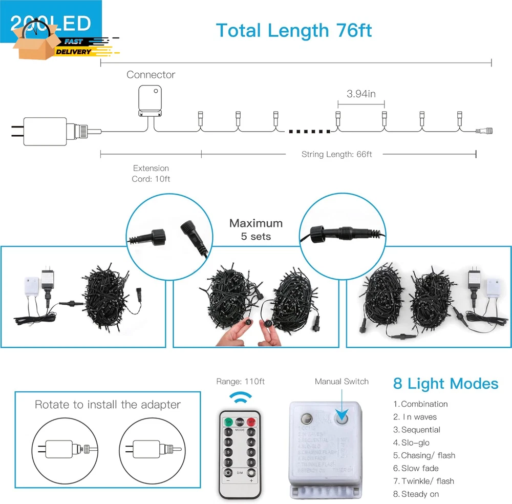 Store New Arrivals Add to Favorite View Feedback Contact 200 LED Multicolor Christmas Lights, 8 Modes Blinking Christmas Tree Lights with Remote, Colored Christmas String Lights for Outdoor Indoor Party Decoration Description Item model number SDSW-200MC Light Source Type LED Style Modern Number of Items 1 Power Source Corded Electric Number of Light Sources 200 Control Method Remote Theme Jewelry,Christmas Style Number SDSW-200MC Controller Type button,remote Wireless Communication Technology Infrared Occasion Type Easter, Wedding, Christmas, Halloween, Thanksgiving Seasons winter Additional Features Corded Package Dimensions 7.13 x 4.06 x 3.74 inches; 1.1 Pounds Indoor/Outdoor Usage Outdoor, Indoor Material Type Plastic, Rubber Light Color Multicolor Water Resistance Level Waterproof Item Weight 0.5 Kilograms Occasion Easter, Wedding, Christmas, Halloween, Thanksgiving Special Feature Corded Color Multicolor Indoor Outdoor Usage Outdoor, Indoor Voltage 120 Volts Included Components Remote Style Name Modern Size 200 LED π[Long Length and END-TO-END]: 200 LED multi colored Christmas Lights 66ft long, plus a 10ft extension cord. The updated mini outdoor Christmas lights are end-to-end connectable. It could be extended to a maximum of 6 light strings (total 396ft/1200led). Choose more than one, these extra-long strings of lights can be used to decorate any big scene you want. Just need 1 remote to control all lights and 1 socket for electricity. π[Super Bright and 4 Brightness Levels]: Super brightness Christmas tree lights to give your Christmas decoration icing on the cake. Both day and night, it is particularly conspicuous. The Christmas lights have 4 brightness levels, you just need to press the dim +/- button on the remote for settings of 100%, 75%, 50%, or 25%. π[5 Gorgeous Colors and 8 Modes]: SUDDUS blinking christmas lights have five unique colors: lime green, aquamarine, rose, ruby, and orange. SUDDUS exclusive multi-color Christmas lights have 5 superior jewelry tones colors, and higher quality. This 200led colored Christmas lights have 8 lighting modes: steady on and 7 flashing modes (comb, in waves, sequential, slo-glo, chasing/ flash, slow fade, and twinkle/ flash). Creating a colorful and twinkling dream world for you. π[Waterproof and Safety]: IP44 Christmas string light is waterproof (Both the plugs and end-to-end connectors have caps to block the ingress of water), suitable for indoor and outdoor decorations, including trees, pathways, garlands, houses, roofs, balcony, party, porch, garden and anywhere. UL588 safety-certified Christmas lights come with 3 strands of wires, which can withstand long working times. So it will be more durable. It will not have an overheating problem. Save to touch any time. π[Remote Control and Timer Function]: The range of the remote control is 32ft. With a wireless remote, you donβt need to walk across your yard to control the lights. The updated XMAS lights have 3 different Timer Functions to meet your various needs. When you press this button, you can free your hands and it will work functionally. Product Description Holiday Joy Shines Brightest with Festive Christmas Lights! The video showcases the product in use. The video guides you through product setup. The video compares multiple products. The video shows the product being unpacked. The colorful and twinkling lights bring joy to children and families, often becoming a source of wonder and excitement. Christmas lights are not just decorations; they become a backdrop for family photos and cherished memories. A Tree Filled with Kids' Holiday Delight Christmas Comfort Begins at the Fireplace's Glow Make Your Home's Yard the Talk of the Town From lawn to porch, create a merry winter wonderland with SUDDUS Christmas Lights! A well-decorated Christmas yard becomes a visual focal point in the community, drawing the attention of neighbors and passersby. It becomes a beacon of holiday cheer and celebration. IP44 Waterproof No matter what the weather, this Christmas light can work normally. Perfect for Christmas trees, garden decorations, balconies, shrubs, and fences. Safe to Touch It is safe to touch it at any time, do not worry about overheating. The light comes with 3 strands of wires, which can withstand a long working time. 8 Modes Christmas lights have 8 lighting modes: 1 steady on and 7 flashings. The memory function of the remote control can remember the last mode you set. 3 Timer 6: 6hr on, 18hr off. 8: 8hr on, 16hr off. 6639: 6hr on, 6hr off, 3hr on, 9hr off, every 24 hours Limitless Creativity with Connectable Christmas Lights! Whether you're decorating a vast garden, an expansive front yard, or creating a breathtaking holiday scene within your home, connectable Christmas string lights provide the flexibility and adaptability you need to bring your creative ideas to life. SUDDUS CHRISTMAS LIGHTS Add to Cart Add to Cart Add to Cart Add to Cart Add to Cart Add to Cart Add to Cart Customer Reviews 4.5 out of 5 stars 460 4.3 out of 5 stars 8 4.4 out of 5 stars 583 4.5 out of 5 stars 703 4.4 out of 5 stars 6,521 4.3 out of 5 stars 685 4.3 out of 5 stars 3,159 Price $29.99 $ 29 . 99 $24.99 $ 24 . 99 $29.99 $ 29 . 99 $24.99 $ 24 . 99 $14.99 $ 14 . 99 $18.99 $ 18 . 99 $15.98 $ 15 . 98 Power Source Plug in Plug in Plug in Plug in Battery Battery USB Color Multicolor Multicolor Warm White Warm White Warm White Warm White Warm White LED Quantity 200 LED 360 LED 200 LED 100 LED 200 LED 100 LED 200 LED Connectable YES YES YES YES NO NO NO Special Features Unique Light Color Unique Light Color Diamond-Shape Led Bulbs Clear Wired Strand Flexible Copper Wire Globe Shape Bulb Vertical Waterfall Lights ABOUT US We offer the best prices around on high quality products. Our E-store includes media such as books, movies, music and games while offering electronics, toys, sporting apparel, clothing, tools, general home, garden items and more. SHIPPING We are always working hard to ensure your package