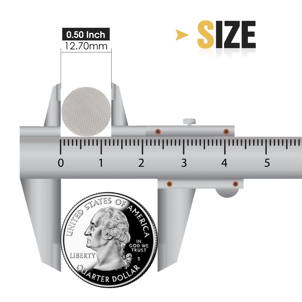 This Package Includes: - 200 x 1/2 Inch stainless steel pipe screens - 1 x storage box Product Includes: 200 Pieces Premium Quality 1/2" (0.5Inch/12.70mm) Stainless Steel Fine (60 mesh) Pipe Screens, and one Metal Storage Box. Manufactured with Stainless Steel, sturdy and durable. Universal shape: Thicker than ordinary pipe screens, but is flexible and easily fits into your pipe. Dimensions: We have many different precise dimensions. Before choosing one, our recommendation is to first measure the diameter of your pipe’s opening and then choose a dimension. Uses: These pipe screens can prevent dottle and ashes from getting sucked into your mouth while increasing airflow and aiding combustion.