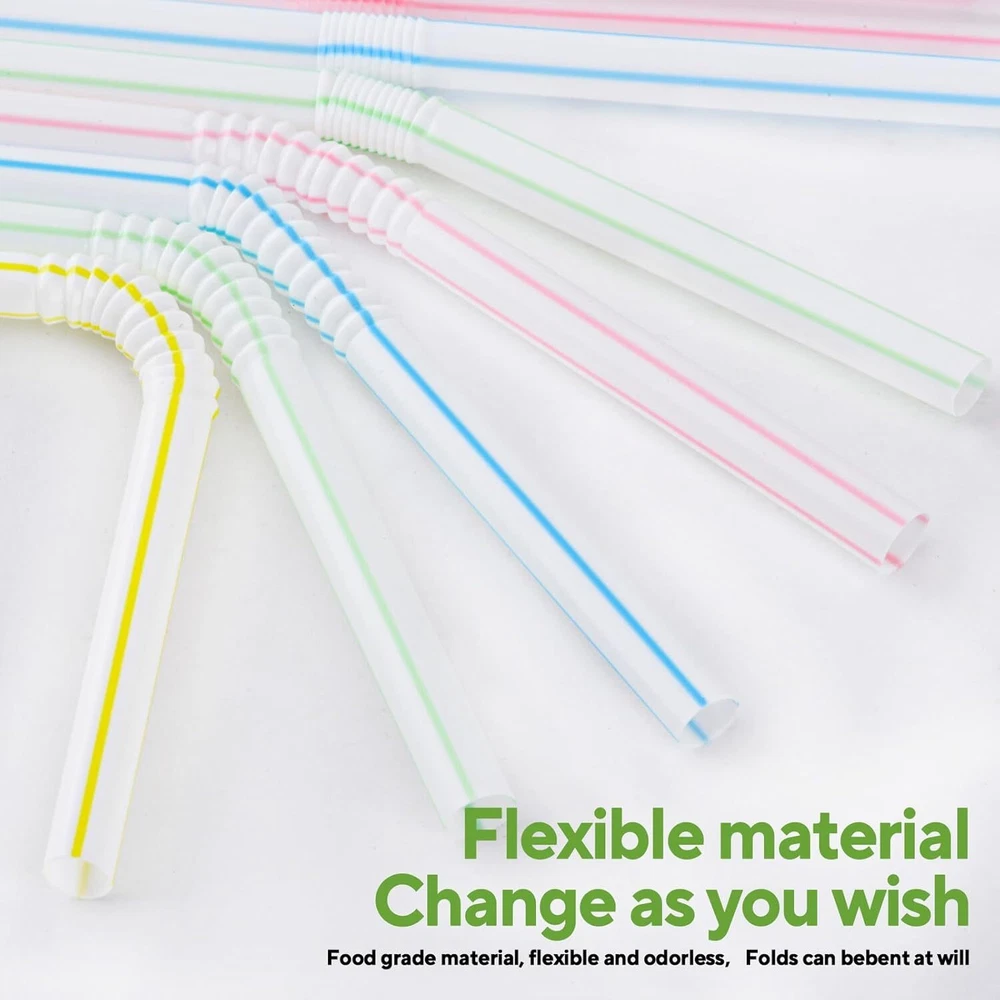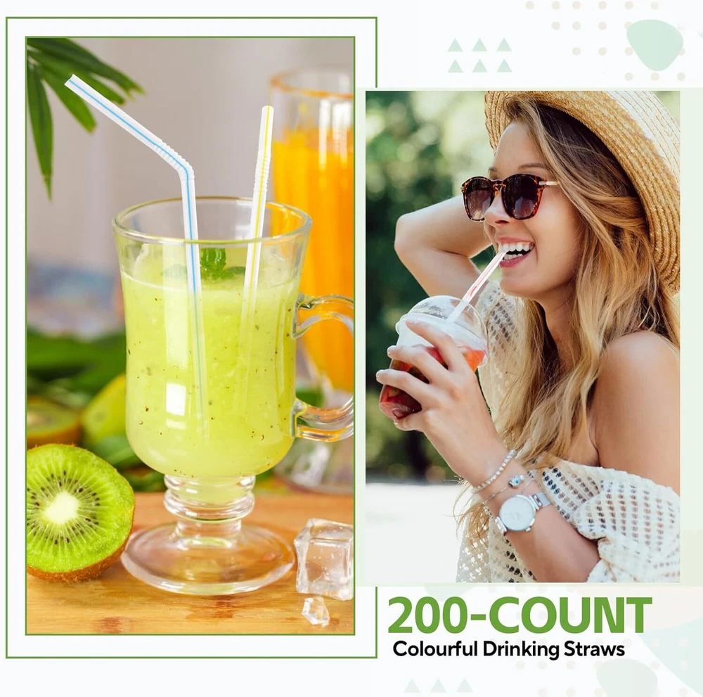 [200 Pack] 8.5" High Flexible Plastic Straws,Bendable Disposable 200PCS Product Details Material: Plastic Color: 200PCS Special Feature: Flexible Brand: SONGNASS Unit Count: 200.0 Count Number of Items: 200 Manufacturer: SONGNASS Package Dimensions: 8.58 x 5.04 x 2.05 inches Item Weight: 2.89 ounces Item model number: SONGNASS-200 SONGNASS [200 Count] Assorted Bright Colored Striped Plastic Flexible Drinking Straws for all your hot or cold drinking needs. 200 Count PP material disposable plastic drinking straws,about 8inch/21cm long, 0.2inch/0.6mm diameter of the mouth, suitable for all kinds of high and low cups, cans, beverage bottles, etc. Both ends are large bottle mouths, no sharp corners, will not scratch your mouth when eating, you can easily sip smoothies, bubble tea and milkshakes Suitable for cold drink shops, fast food restaurants, ice bars, tea shops, cafes, dessert shops and all kinds of fast-moving consumer places, schools and educational institutions, very cool at home parties, birthday parties and holiday parties. Customer Service - Please check the package contents when you receive the product. If you have any concerns, questions or dissatisfaction with our products, please feel free to ask us for help