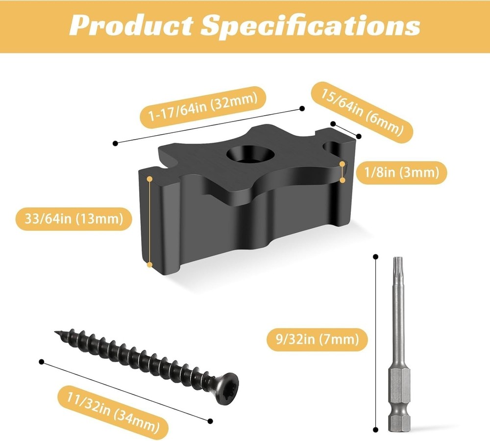 200 Pack Hidden Deck Fasteners for Composite Decking Board Composite Decking Size Name:200 Pack Match with Trex Board: Use our hidden fasteners to make your entire deck look clean and tidy. The fastener thickness is 3mm (0.125 inches) which matches most brands of edge groove composite, hardwood, wood decking, and composite decking. Premium Quality: Hidden fasteners are specially designed for easy installation of composite decks with grooves, making installation easier, and ensuring stability and reliability. Universal hidden deck fastener clips help create a compact and seamless finish, bringing you a nice user experience. Reliable to Use: Our hidden fasteners are made of high-density polymer material, durable and corrosion-resistant, ensuring long-term reliability in all weather conditions. The high strength and perfect toughness of composite decking clips provide a better fastening effect on the deck. Spare Parts Included: Hidden fasteners with each package include 100pcs of fastener clips with screws, and 2 driver bits, providing plenty of quantity for your use, replacement, and sharing demands, which can give you a nice shopping experience. Characteristic: Composite hideaway fastener's black-coated screw heads blend in with the deck providing a clean and screw-free effect for the deck, walk barefoot without worrying about being scratched. The consistent spacing and hidden installation, create a clean and tidy look for the deck. Easy to Install: Insert the hidden fasteners into the groove edges of the joist separately, and only tighten half of the screws. Then the next board fits into the previous board correctly. Fully tighten all the screws once all the boards are in place. Return Policy: We offer a 30 day return policy from the receiving date. Please contact us for a Free Return Label. Please use our return label so it will go back to our supplier and we can do a refund or replacement afterwards. Feedback: Your satisfaction is very important to us! If you have any problem with your order, please contact us and we will do our very best to make you satisfied. As long as you are happy with your purchase, please leave a positive feedback for us. We will always leave you a positive feedback in return. If you have any problem with your purchase, please do not leave a negative feedback. Please Contact us ... and your issue will be solved quickly and positively We are a small family-owned business trying to make a living, not a huge company that does not care ... We will ALWAYS do our best for you!