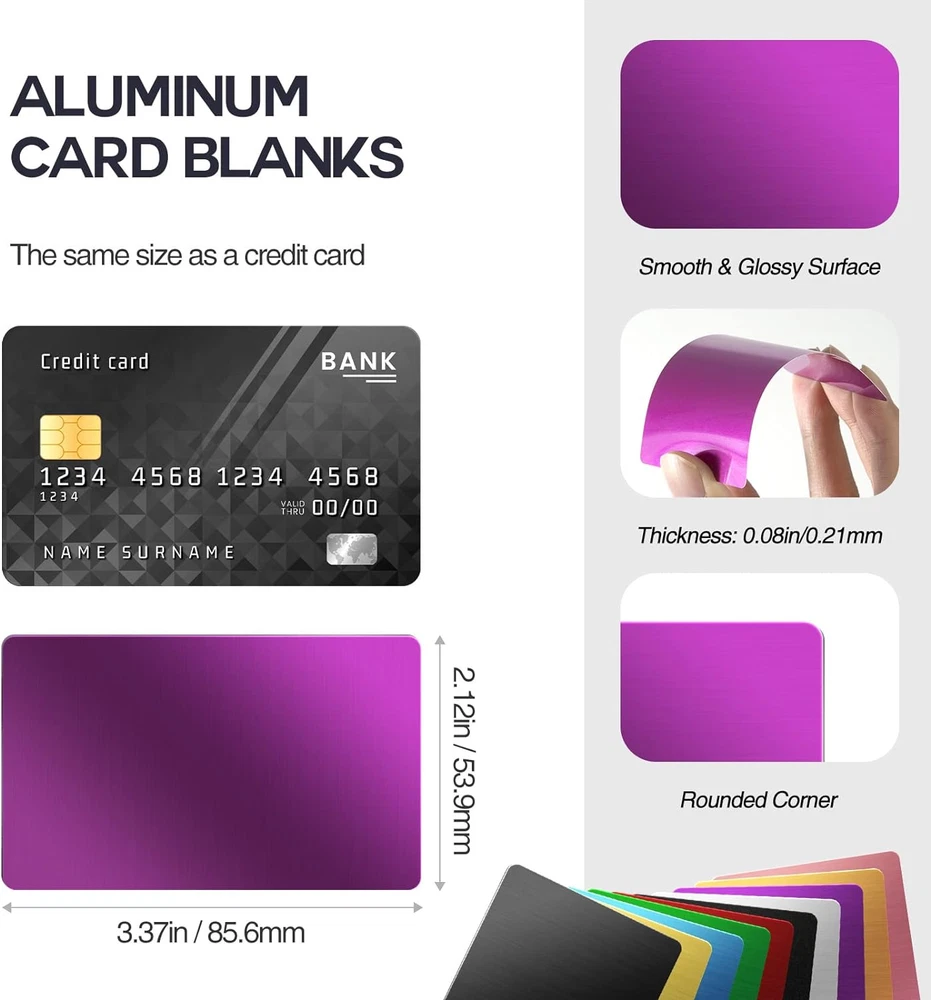 Durable Material: Our engraving blanks are made of high-quality aluminum alloy, ensuring long-lasting use and resistance to bending or breaking. Generous Quantity: This package includes 200 colorful laser blanks in 10 different colors, with 20 cards in each color, providing you with ample options for your various needs. Suitable Size: Each card measures 3.38 x 2.12 inches (8.6 x 5.4 cm) and 0.21 mm/0.01 inch thick, similar to the size of a bank or credit card, making it convenient for carrying and storage. Versatile Use: These metal business card blanks can be used for various purposes, such as business cards, luggage tags, emergency contact cards, thank-you cards, game cards, and more, allowing you to express your creativity and meet different needs. Compatible with Laser Engraving Machines: Our cards can be used with various laser engraving machines, such as Circut, CNC, Glowforge, Silhouette, CO2, and more, making it easy for you to customize your cards with your desired text, pattern, or design. Looking for a durable and versatile solution for your business or personal needs? Our Laser Engraving Blanks are made of high-quality aluminum alloy, ensuring long-lasting use and resistance to bending or breaking. [Package includes] 200 colorful aluminum cards in 10 different colors 20 cards in each color Suitable size: 3.38 x 2.12 inches (8.6 x 5.4 cm) and 0.21 mm thick, convenient for carrying and storage [Versatile use] Business cards Luggage tags Emergency contact cards Thank-you cards Game cards And more Perfect for entrepreneurs, artists, travelers, and anyone who wants to stand out from the crowd. Ideal for creating unique business cards for your company or personalized gift cards for your friends and family. Order now and experience the durability and versatility of our aluminum cards!