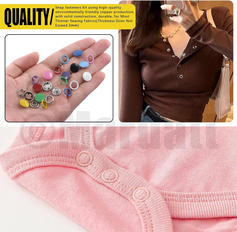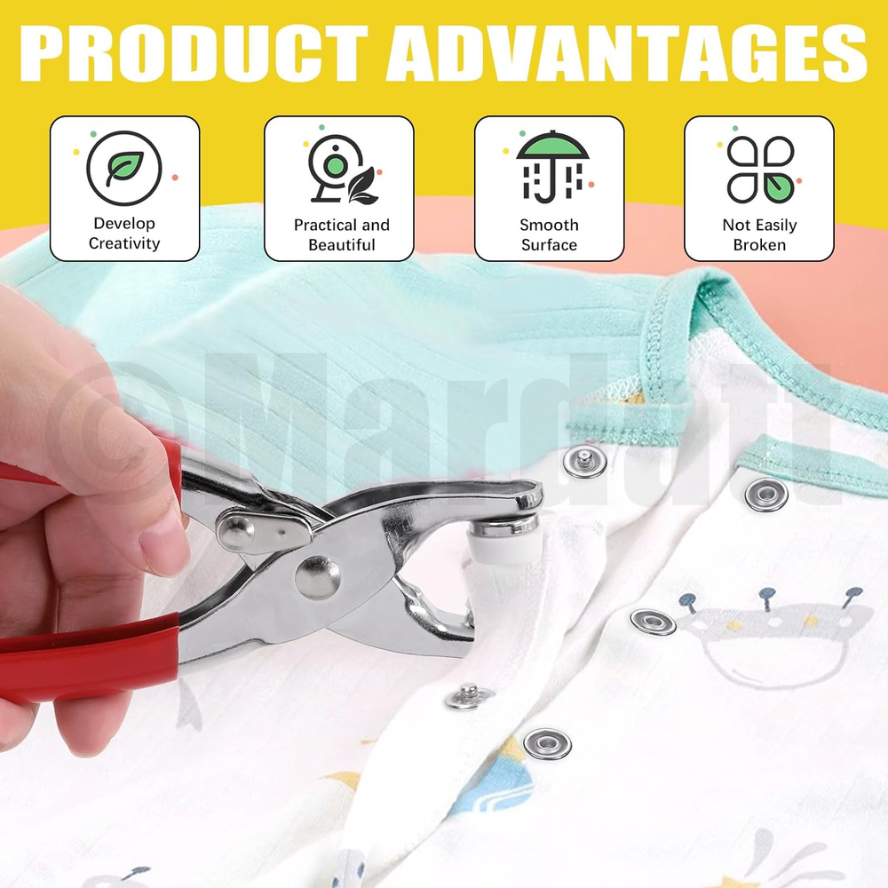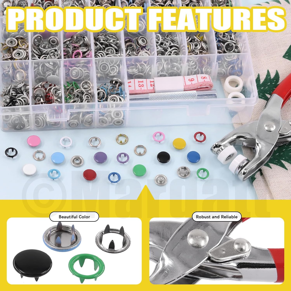 Store New Arrivals Add to Favorite View Feedback Contact 200 Sets Snap Fasteners Tool Kit Includes Hollow and Solid Metal Prong Snaps Buttons, Snaps Fasteners Pliers, Setting Tool and Ruler for DIY Leather Sewing Clothing(9.5Mm,10 Colors) Description Item model number M912 Style Hollow and Solid Snaps Buttons Color Multicolor Material Metal Country of Origin China Item Weight 1.02 pounds Head Style Button Model Name snapfastener Recommended Uses For Product Craft Product Dimensions 7.09"L x 6.69"W ✿【What You Will Get】In this kit, you will get 100 sets(400pcs) hollow snaps, 100 sets(400pcs) solid metal snaps, 2pcs spare rubber mats, 1pcs punching tool, 1pcs snap pliers, 2pcs sewing chalks and 1pc soft ruler, totally 807pcs. Each set of hollow/solid snaps consist of 1pcs male snap, 1pcs female snap and 2pcs hollow prong rings. All are packaged in a transparent plastic box for easy storage and carrying, avoiding mess and loss. The sufficient quantity can meet your daily using demands. ✿【High Quality Material】The snaps buttons are made of high quality copper material, rust proof and anti-corrosion, not easy to fade and deform, strong and durable. The snap pliers are made of high-quality aluminum body and feature a non-slip handle for comfort hold, easy to operate. ✿【Various Colors & Sizes】There are 10 different colors available for you: purple, red, pink, black, sky blue, blue, silver, green, yellow and white, which can meet your DIY button making of various colors of fabrics. Metal Snap size: approx. 6.5 mm/ 0.23" in inside diameter, 9.5 mm/ 0.35" in outside diameter, suitable for most crafts. ✿【Easy to Use】Just align the buttons on the pliers, place the clothes in the middle of the pliers opening, and then press the pliers down to make a pair of buttons. No need for hammer and drilling hole. These snap fasteners have five sharp corners on each prong, which can be securely fastened to ensure they do not fall off, so you can use it with confidence! ✿【Wide Application】The snap fasteners kit are widely used for DIY making clothes, such as cloth bags, quilt covers, backpacks, curtains, paper bags, pouch, bodysuit, shirts, raincoats and other household projects. You can also DIY snap button sewing kits with family or friends who enjoy handcrafting, exercise your hands-on skills, and have fun from DIY! Mardatt 807Pcs Snap Fasteners Tool Kit Includes Hollow and Solid Metal Prong Snaps Buttons, Snaps Fasteners Pliers, Setting Tool and Ruler for DIY Leather Sewing Clothing(9.5mm,10 Colors) Specifications: ➹Product Type: Snap Fasteners Tool Kit ➹Material: Copper ➹Size: Snap Buttons: 9.5 mm/0.37" in OD Please refer to the second picture for specific dimensions. ➹Color: purple, red, pink, black, sky blue, blue, silver, green, yellow, white ➹Quantity: 807Pcs ❥How to Use? ①Determine the positive and negative positions of the buttons on the pliers. Put the male and female snaps on the upper side of the pliers with holes. Place the prong rings on the underside of the pliers (no hole). ②Press the handle. ③Insert a colored hollow claw ring and a male buckle into the pliers. ④You can use the bar to hit it, prevent the buckle from loosening. Work done! ❥Why Choose Us? ★Premium Quality: The snap fasteners kit are made of high quality copper with solid construction, not easy to fade and break, long service time. ★Stable Structure: The snaps buttons feature five sharp corners, which can make the snap steady, not easy to fall off. ★Wide Application: Suitable for DIY crafts, cotton, clothing, backpacks, shirts, shoes, skirt and other sewing items. Suitable for women, professional or novice tailors. ❥Package Includes: 400Pcs/100 Sets x Hollow Metal Snap Buttons(10 colors, 10 sets of each color) 400Pcs/100 Sets x Solid Metal Snap Buttons(10 colors, 10 sets of each color) 1Pcs x Snap Fastener Pliers 2Pcs x Spare Rubber 2Pcs x Sewing Chalks 1Pcs x Punching Tool 1Pcs x Ruler Totally 807Pcs. ABOUT US We offer the best prices around on high quality products. Our E-store includes media such as books, movies, music and games while offering electronics, toys, sporting apparel, clothing, tools, general home, garden items and more. SHIPPING We are always working hard to ensure your package arrives as soon as possible. Please understand that some factors like weather, high postal traffic, and the performance of shipping companies are outside of our control. We offer free shipping to the lower 48 states and ship within 2 business days of payment, usually sooner. We do not accept P.O. Boxes. Please provide a physical address. RETURNS We offer a 30-Day Return Policy on items which you are not completely satisfied with. You have the option for a full-refund or an exchange of the item. No returns are available on items shipped outside of the USA. PAYMENT We accept PayPal. CONTACT US This page content is yet to come Please ad us to your favorite seller and visit again later Thank You CUSTOMER SATISFACTION We try our very best to make sure every customer is completely satisfied. If there's a problem, message us! We're happy to help.
