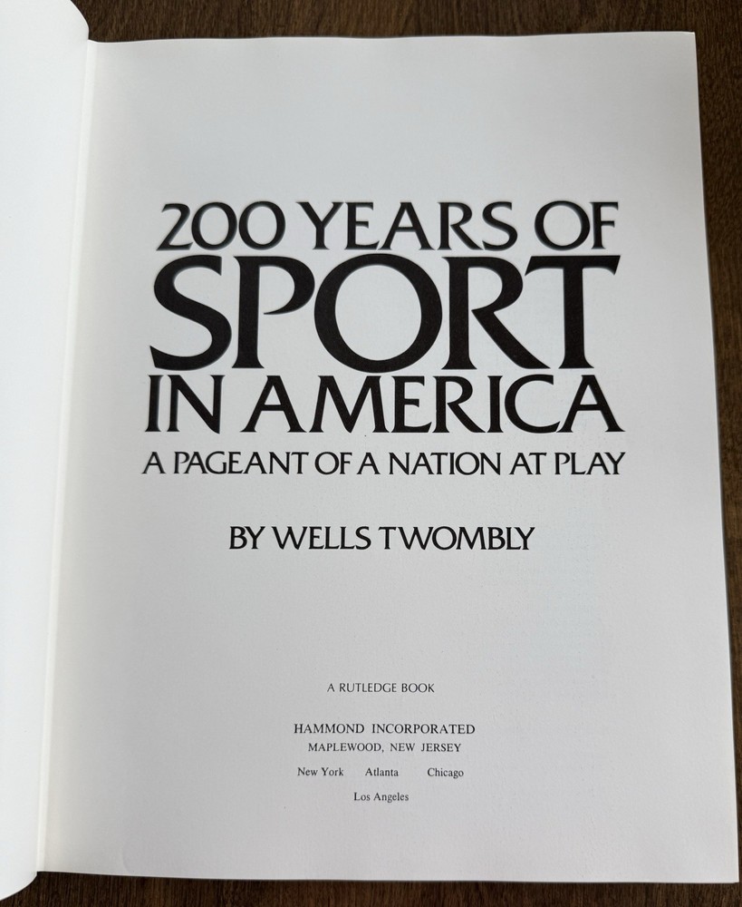 The product is a vintage 1976 edition of "200 Years of Sport in America" by Twombly, a classic sports book in English language. This leather-bound hardcover edition is a collector's item, making it a valuable addition to any sports enthusiast's library. The classicism topic, along with the focus on American sports history, makes it a timeless piece of literature that captures the essence of sports in the United States over the last 200 years. Was Personalized. Very Good Condition. Measures 11 1/4" X 8 1/2" with 287 pages. Packaged Securely