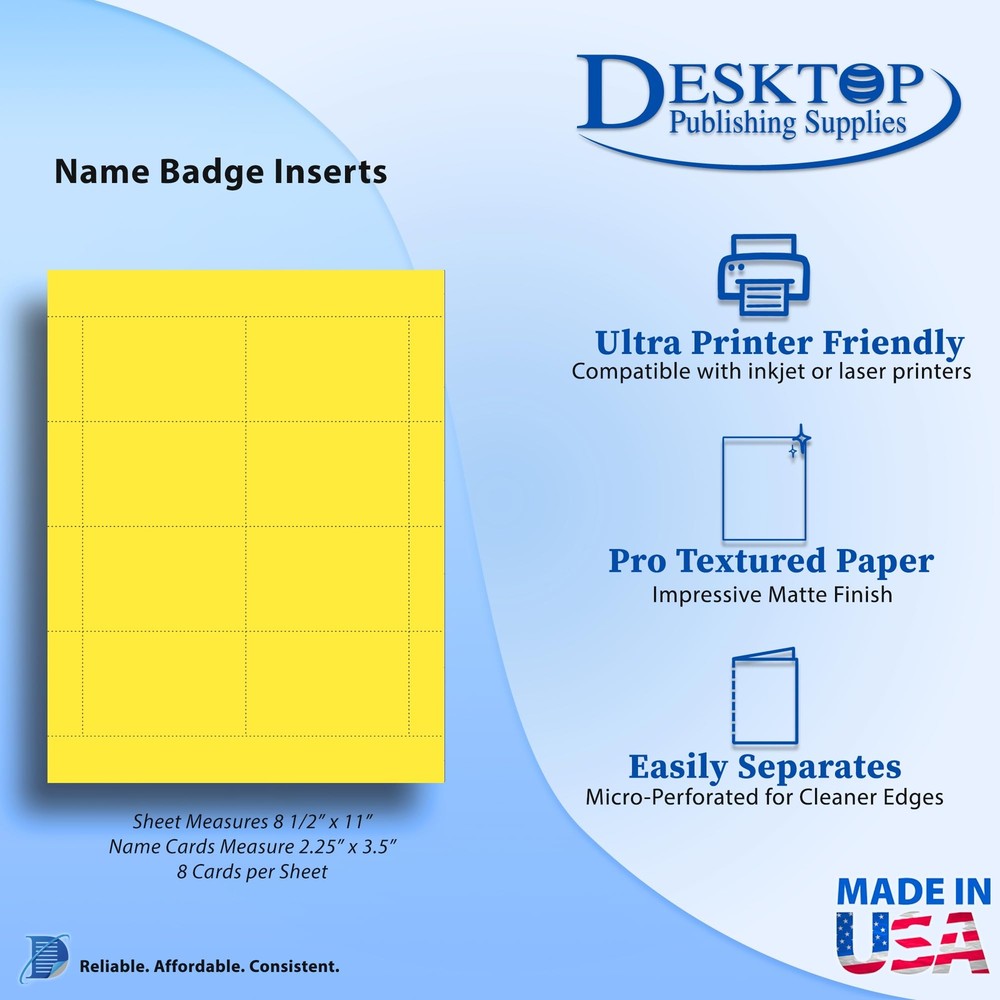 eBay Product Listing Welcome to Your Favorite My Store Your satisfaction is our top priority – Shop confidently 65lb Bright Name Badge Inserts 2.25 x 3.5-8 per Page - High Visibility Standard Printable Name Tag Cardstock for Inkjet & Laser Printer Compatible - 25 Sheets / 200 Printable Name Cards (Yellow) Item Gallery Item Description Blank perforated name tag refills measure 2.25" x 3.5" and are made to the industry standard Layout - Making it easy to use & compatible with almost all software Inkjet, Laser, and Copier printer compatible. Made from a quality 65lb Cover (176 gsm) Bright Yellow Cardstock with a matte finish Microperforated for easy breaking apart and cleaner edges - 8 Name Badge Refills per sheet 25 Sheets / 200 Cardstock Name Tags Special Features Brand 65lb Bright Colored 8up 2.25x3.5 Name Badge Inserts Sheets make it simple & affordable to create name badge insert cards from your home or office printer. These high quality sheets are microperforated with 72 perforations per inch for easy breaking apart and cleaner edges. Our Blank name tag cards are created to work with the industry standard 8up name badge card layout- making them work with virtually all design software! Each card measures 2 1/4" x 3 1/2". These cards are made from a 65lb Cover (176 gsm) Bright Colored Cardstock that is both inkjet and laser printer compatible. Our Guarantee To You We offer fast shipping, free delivery, and 100% customer satisfaction guarantee. Not satisfied? Return your item for free within 30 days. 30-Day Free Returns Shipping Details Items will be sent to your eBay address. Please verify before purchasing. Typical delivery within 3-7 business days. Professional shipping services used for all orders. We ship to the continental US (48 states only). Unable to deliver to Alaska, Hawaii, or territories. No APO/FPO or PO Box deliveries available. We use eco-friendly packaging Payment Options We accept these secure payment methods: All transactions securely processed through eBay's payment system. Simple Returns 30-Day Satisfaction Promise Contact us through eBay messages within 30 days of delivery. We'll provide return instructions and our address. Return the item in its original condition. We'll process your refund within 48 hours of receiving the item. Get In Touch Have questions about your order? Contact us through eBay messaging for prompt assistance. We typically respond within 24 hours.