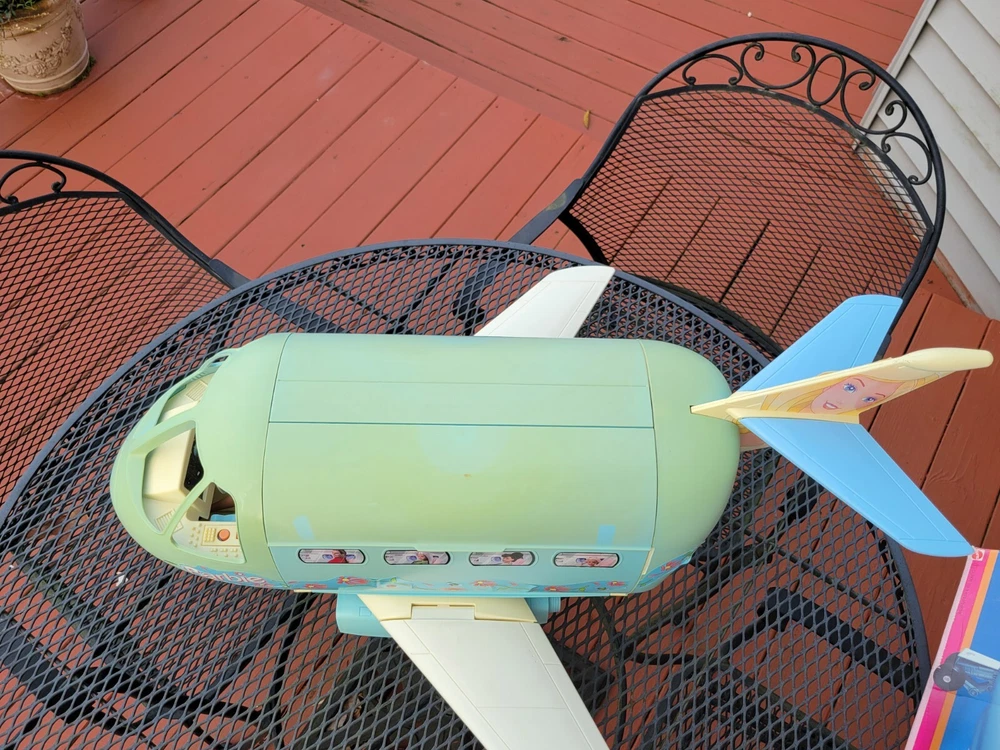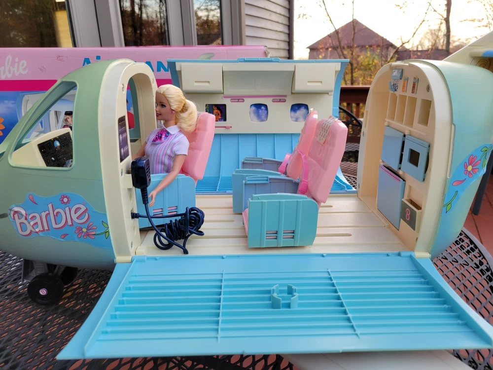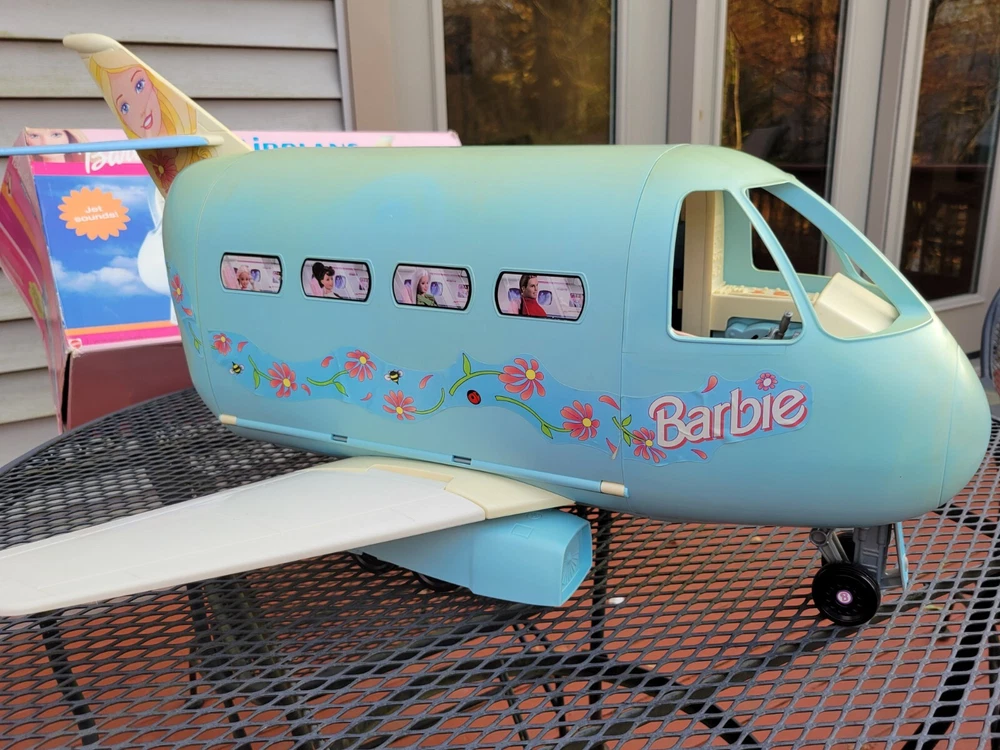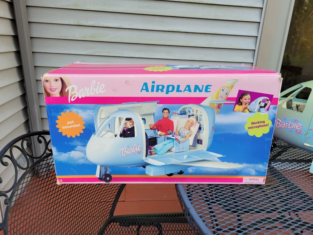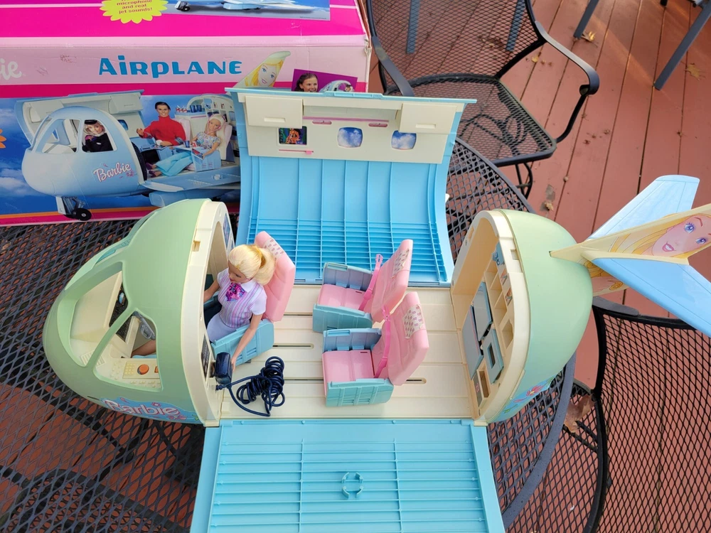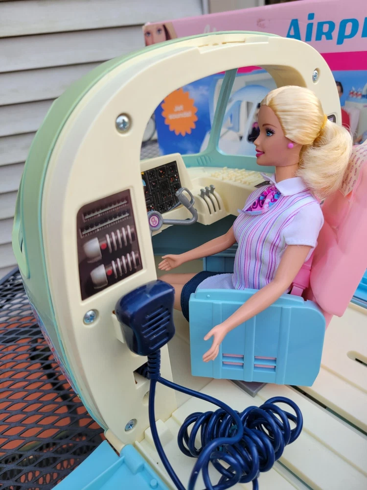 ~Mattel Vintage 2000 BARBIE AIRPLANE Blue Plane w/Barbie & Box~ ~Excellent Vintage Condition-see pics~ tested and works-makes airplane noises-takeoff and landing sounds ~microphone works. ~Accessories not included- includes Barbie w/ hat This vintage Mattel Barbie Airplane set from the year 2000 is a must-have for any Barbie collector or enthusiast. The airplane is compatible with 11.5" dolls and features battery-operated functionality. The set is an original, licensed reproduction and is perfect for display or play. Don't miss out on this opportunity to own a piece of Barbie history! COMES FROM A SMOKE/PET FREE HOME