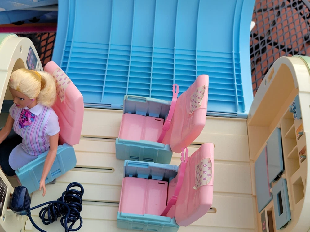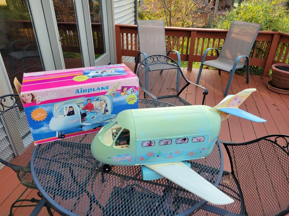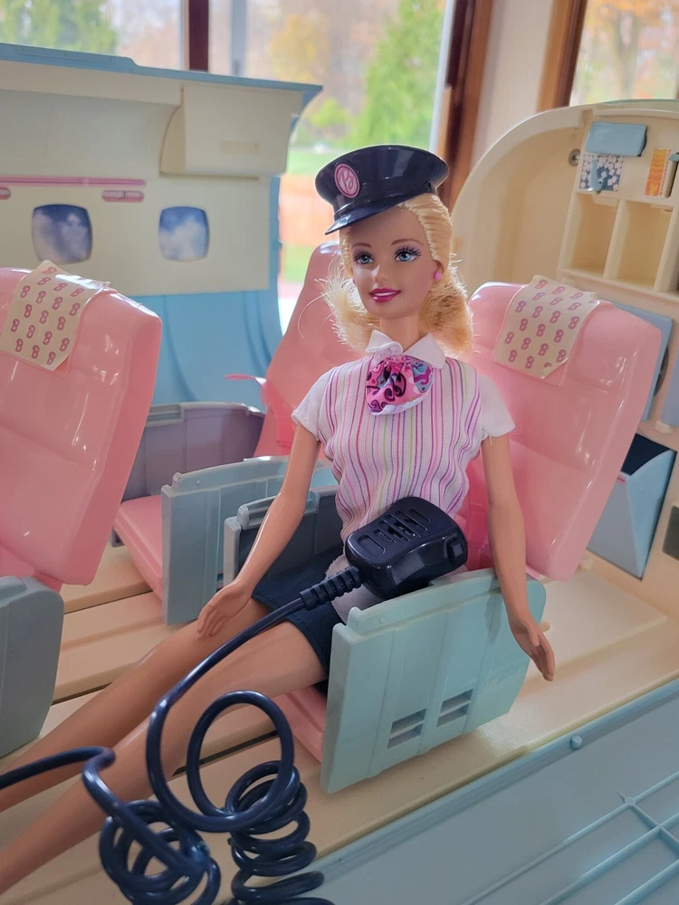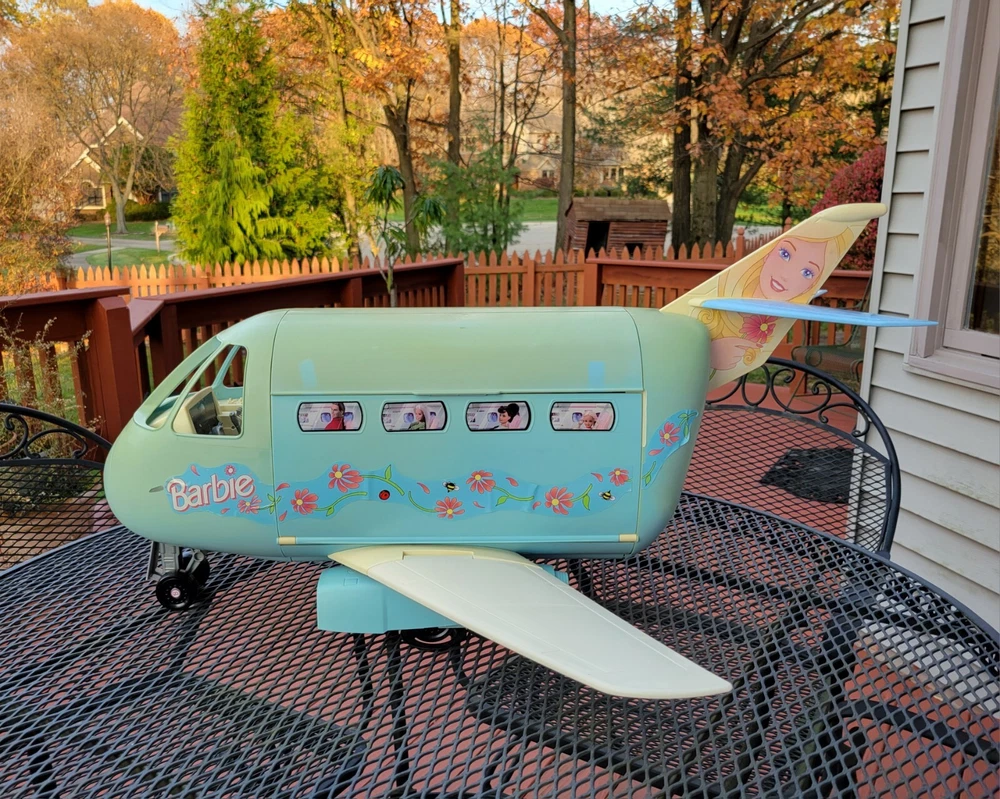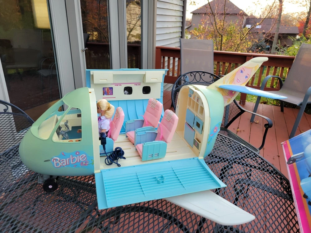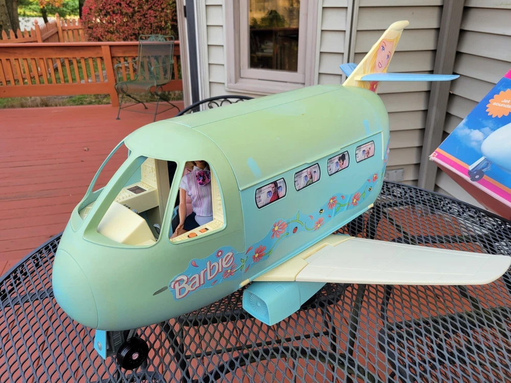 ~Mattel Vintage 2000 BARBIE AIRPLANE Blue Plane w/Barbie & Box~ ~Excellent Vintage Condition-see pics~ tested and works-makes airplane noises-takeoff and landing sounds ~microphone works. ~Accessories not included- includes Barbie w/ hat This vintage Mattel Barbie Airplane set from the year 2000 is a must-have for any Barbie collector or enthusiast. The airplane is compatible with 11.5" dolls and features battery-operated functionality. The set is an original, licensed reproduction and is perfect for display or play. Don't miss out on this opportunity to own a piece of Barbie history! COMES FROM A SMOKE/PET FREE HOME