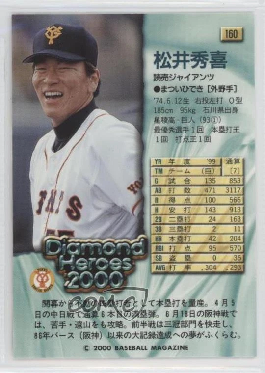 2000 BBM Diamond Heroes - [Base] - Promotion #160 Hideki Matsui - Rookie - Baseball Card - Featuring the Yomiuri Giants - Featuring Hideki Matsui Search for more: 2000 BBM Diamond Heroes Search for more: 2000 BBM Diamond Heroes - [Base] - Promotion View all of our Listings Auctions Buy It Now About Us Located in the beautiful Pacific Northwest, COMC (Check Out My Cards) is the world's largest consignment service for trading card singles. More than 10,000 people have used our consignment service to list over 50 million trading cards. We currently house 20 million cards, each listed for sale with front and back images of the actual card. Find out how we can help you consign your items on eBay by contacting us through eBay messaging. COMC -- "The Safe & Easy Way to Buy & Sell" Representative Image - Select Specific Item above to see image of actual item Representative Image - Select Specific Item above to see image of actual item Raw Condition for Modern Cards Unless otherwise noted, raw modern cards are listed in Near Mint-Mint condition or better. A NM-MT card appears to be Mint at first glance, but upon closer inspection, may exhibit some of the following: minor print defects (e.g. roller marks, print line, dimple), minor scratches, slight edge wear, and slight corner wear. Centering is clearly visible in the images provided and does not factor into our condition assessment. Raw Condition for Vintage Cards Unless otherwise noted, raw vintage cards are listed in Excellent condition or better. An EX card may exhibit some of the following: minor rounding of corners, surface wear, print defects, light scratches, and slight edge wear/chipping. Centering is clearly visible in the images provided and does not factor into our condition assessment. Domestic Shipping Combined shipping for multiple items is available. To receive combined shipping, please ensure all desired items are in your eBay shopping cart before proceeding to checkout. eBay limits orders to 40 items per order. We automatically combine multiple orders placed on the same day. If you place multiple orders on the same day, please contact us to request a refund of applicable shipping costs. Signature confirmation may be required on invoices over $400. Raw cards are shipped in toploaders. International Shipping COMC offers eBay's International Shipping (EIS) for international orders under $2,500* (see country exceptions below). All duties and import fees are paid at checkout; in the rare event that there are additional import fees upon delivery, these are borne by the buyer. EIS packages route through a shipping hub in Erlanger, KY before shipping to their final destination. Please note that EIS does not allow for combined shipments. The shipping rates are determined by eBay and cannot be adjusted. *Maximum sale price exceptions: Colombia, Kuwait ($2,000); Taiwan ($1,539); Chile, Costa Rica, Guatemala, Honduras, Trinidad and Tobago ($1,000); Antigua and Barbuda, Aruba, Belize, Dominica, Grenada, Philippines, Saint Kitts and Nevis, Saint Lucia, Montserrat, Turks and Caicos Islands ($500); Dominican Republic, El Salvador ($200). Please request a shipping quote through eBay messaging for orders that exceed the maximum sale price supported by eBay's International Shipping. You will be responsible for all duties and import fees for international orders shipped outside the EIS. Raw cards are shipped in toploaders. Payment COMC does not accept offers on our cards through our eBay storefront. COMC utilizes eBay’s managed payments system. If you are experiencing difficulties making a payment, please contact eBay for assistance. Return Policy Returns are only accepted on the rare occasion the item is not as described. If you are making a return, please initiate the return process through eBay so a mailing label can be provided for you. Prior to listing, our expert team carefully assessed this item to represent it accurately. Please review the description and high-definition images prior to purchasing to ensure this item meets your satisfaction. We welcome you to contact us if you have further questions about this item. Trust and Integrity COMC carefully assesses each item consigned to us to prevent fraudulent items from entering the marketplace. If you believe an item offered on COMC may be fraudulent, please contact us with details so we can investigate the issue. Items we determine are outside our supported items policy may be removed. Last Modified: 12/30/2024 7:22:16 PM PDT