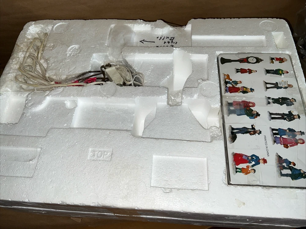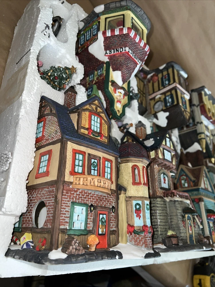 This exquisite 34-piece Victorian Village Set from Grandeur Noel is a must-have for any collector. The set features a variety of buildings and figures, all crafted from high-quality porcelain and painted in vibrant colors. It's perfect for creating a festive Christmas atmosphere in any room, and the set comes complete with a lighted village scene. The set is an original, from the year 2000, and is packaged in a beautiful box for easy storage. It's ideal for adults who appreciate the beauty of Victorian-style Christmas decorations, and would make a great addition to any collection. The set is not handmade, but it's sure to bring joy to anyone who displays it. Missing item #10. Everything else is in the box. Just like new.