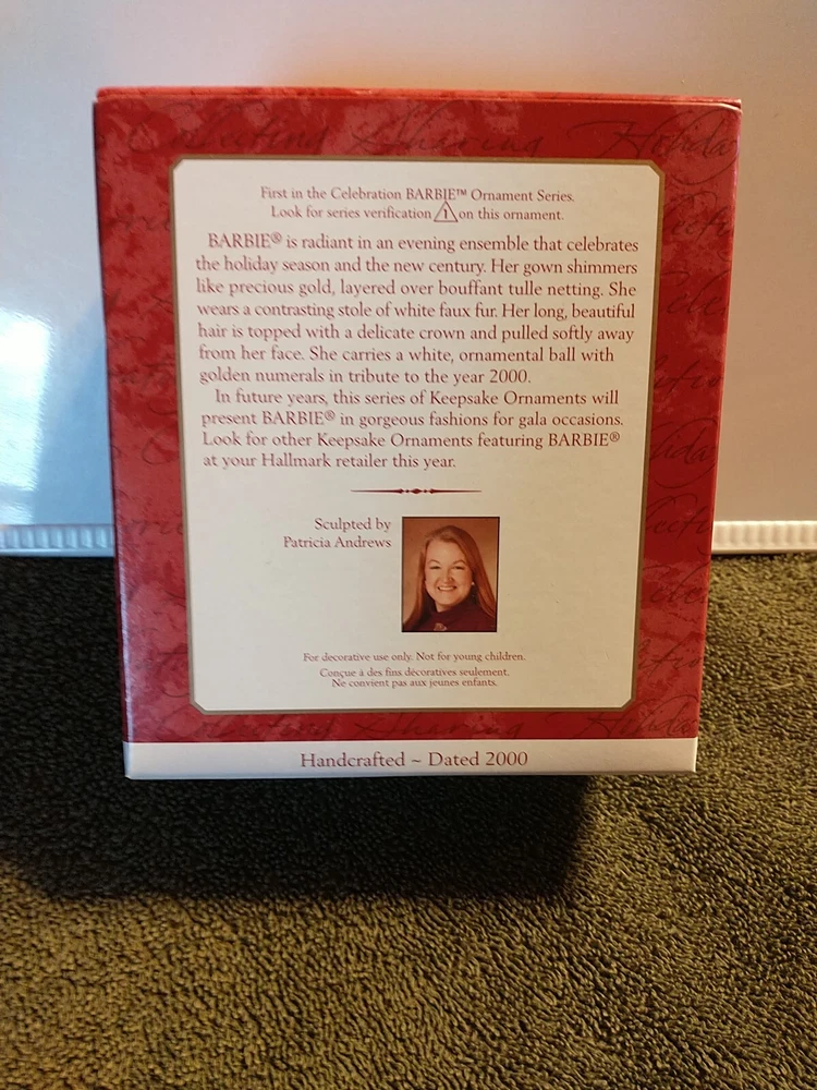 Collection:OrnamentsOccasion:ChristmasPersonalize:NoTheme:HolidayFeatures:HangingAntique:NoPattern:All-OverTime Period Manufactured:2000-2009Department:AdultFranchise:BarbieAge Level:12-18 YearsShape:IrregularOriginal/Licensed Reproduction:OriginalStyle:ContemporaryVintage:NoCountry/Region of Manufacture:ChinaSize:SmallMaterial:PlasticYear Manufactured:2000Type:OrnamentCharacter:BarbieRecipient:MultipurposeSet Includes:OrnamentBrand:HallmarkColor:MulticolorNumber of Items:1