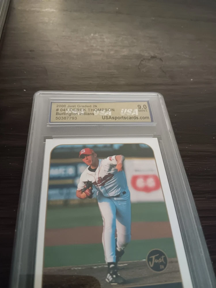 This 2000 Just Minors Just Graded sports trading card features Derek Thompson, a rookie player for the Burlington Indians in Minor League Baseball (MiLB). The card is part of the base set and has a card number of 041. It is manufactured by Just Memorabilia and is a great addition to any collection for fans of baseball. The card is from the 2000 season and is a must-have for collectors of trading card singles. Whether you are a fan of the Burlington Indians or just a collector of sports memorabilia, this card is a great addition to your collection.