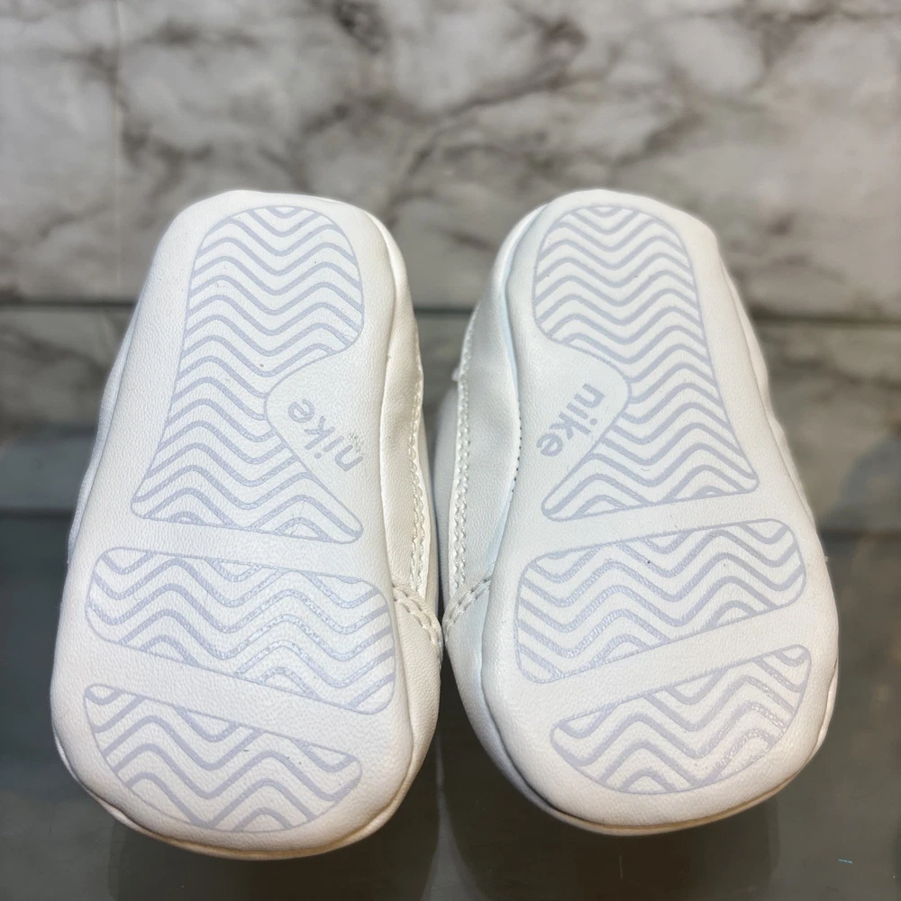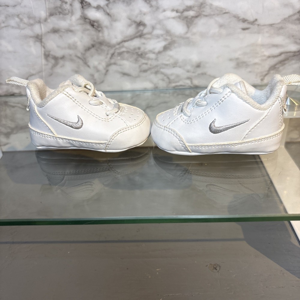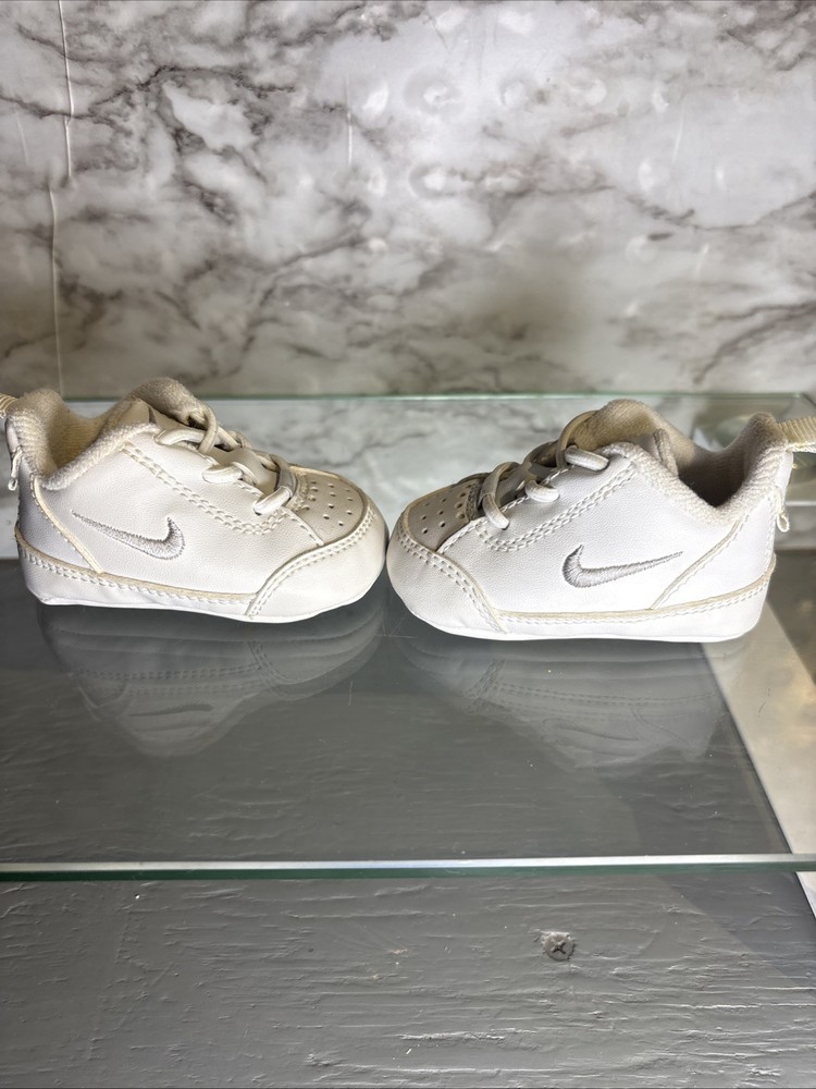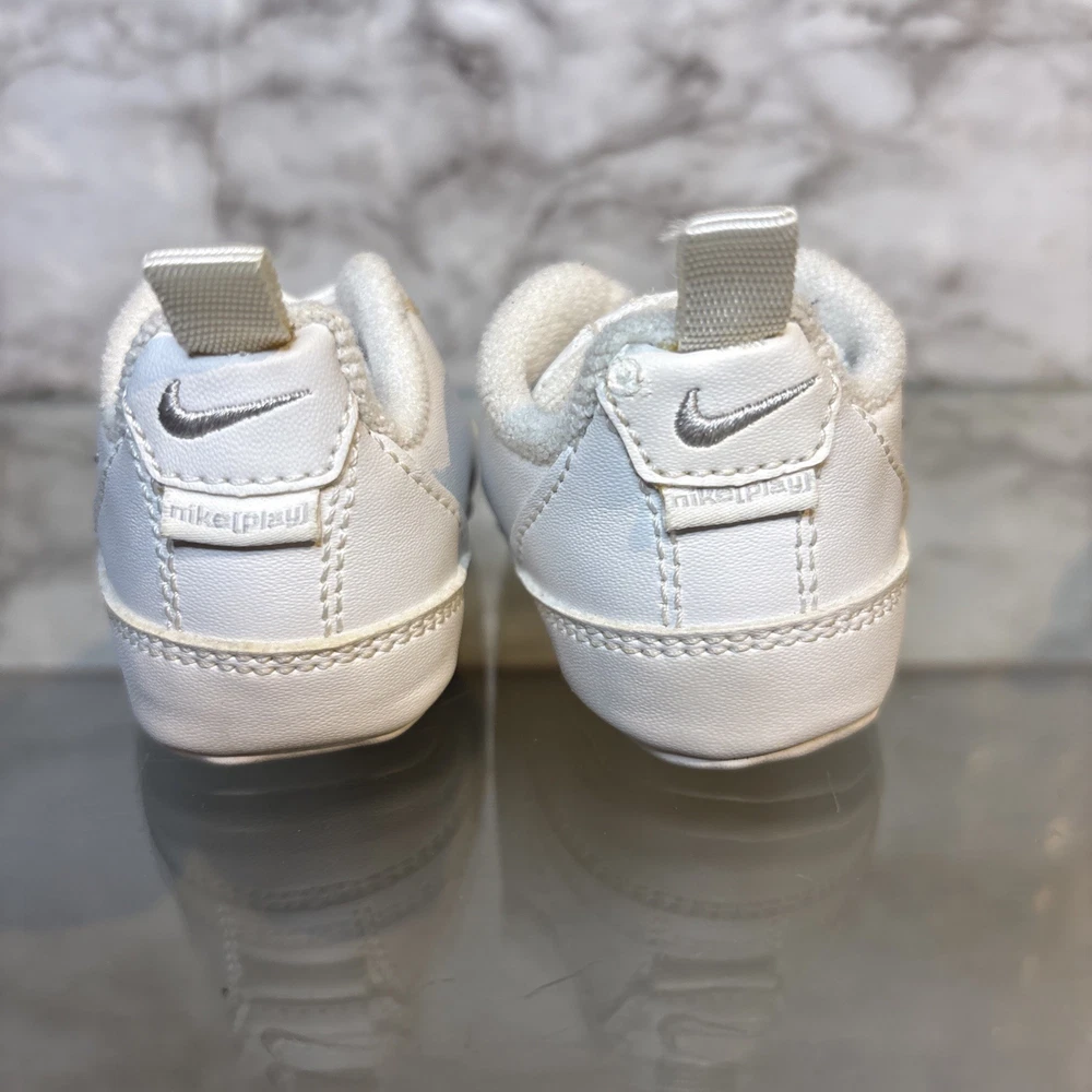 The product is a pair of vintage Nike Play Crib Shoes in unisex size 0C, featuring a white and gray color combination with a leather upper material. Manufactured in the year 2000 as part of the Nike Pico product line, these crib shoes are designed for baby boys and girls. With a UK shoe size of 1.5, US shoe size of 2, and EU shoe size of 17, these stylish and comfortable shoes are perfect for little feet in cribs. Made in Vietnam, these Nike crib shoes are a unique and fashionable choice for your baby's footwear collection.