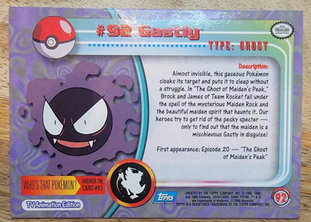 This is a vintage 2000 Pokémon trading card from the TV Animation Series 2 by Topps. It is a "Blue Logo" Base Card featuring Gastly, a Pokémon character. The card is in English and made of card stock. It is a standard size non-sport trading card part of the Pokémon franchise.
