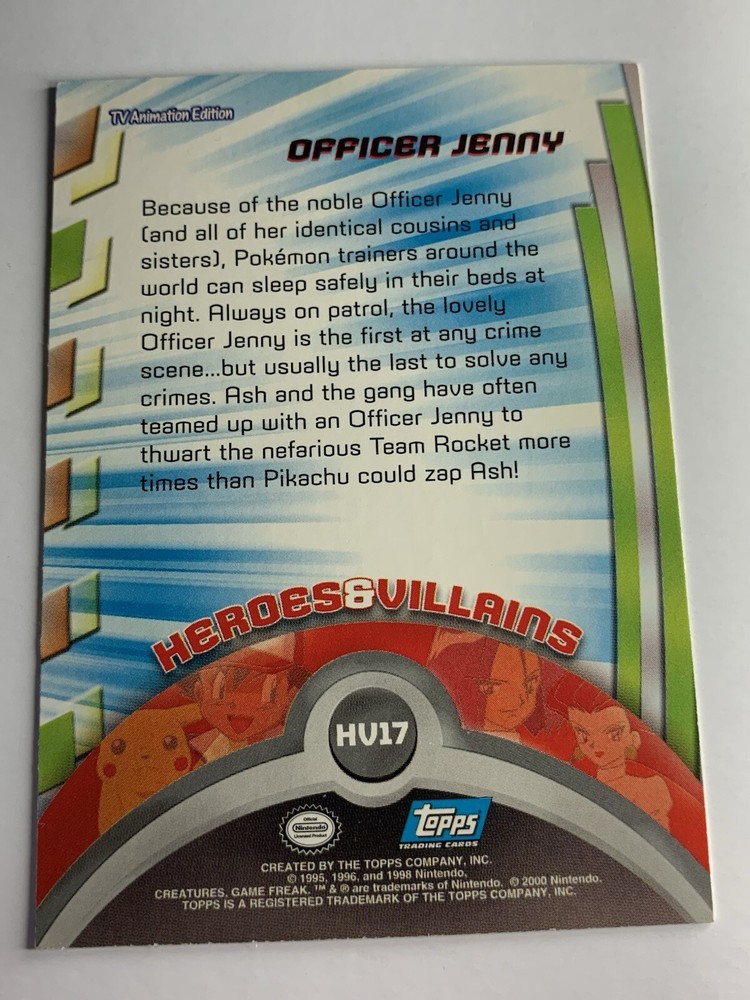 2000 Topps Pokemon TV Animation Series 3 #HV17 Officer Jenny Up for sale is a 2000 Topps Pokemon TV Series 3 card. Please review pictures as the card pictured is of the actual card that you will receive. The card will be placed in a penny sleeve and shipped in a cardboard box with delivery tracking. I have 100% positive feedback and have been selling items on ebay for many years. Let me know if you have any questions or need additional pictures and I will be happy to provide them. Yes - I do offer combined shipping. Additional shipping cost for each ungraded (raw) card is FREE and for each PSA graded item is only $0.50. Pokémon Official Trading Cards , informally known as Pokémon Trading Cards series 1 , was a set of Pokémon-themed trading cards manufactured by Topps in 1999. There were 90 cards in total: 76 Pokémon cards, 13 character cards, and a checklist card. Each of these 90 cards also had two foil card versions (silver and rainbow) in their main United States distributions. This set contained no bonus "chase cards". In the United States There were four different printings. These cards all had an oval Nintendo seal. The printings are distinguished by a blue, black, green, or red Topps logo, with card texts being updated between the first (blue) and second (black) printings. Due to an error, all foil cards after the first printing were printed with black logos, but can still be distinguished by the differences in their debossings. § 1st printing: blue logo on all cards, foil cards had a smooth texture with no debossings. § 2nd printing: black logo on all cards, Pokémon foil cards were debossed with rays and starbursts, while TV cards had a sandpaper finish. § 3rd printing: green logo on non-foil cards only, Pokémon foil cards were debossed with flames and teardrops, while TV cards had dots and rectangles. § 4th printing: red logo on non-foil cards only, Pokémon foil cards were debossed with Poké Balls and targets, while TV cards had dents. A fifth printing featuring foil cards with a smooth finish but a black logo (features of both the 1st and 2nd printings) was also produced to an uncertain extent. Pokémon Trading Cards series 2 was a set of Pokémon-themed trading cards manufactured by Topps in 2000. There were 72 cards in total: 41 Pokémon cards, 5 "Heroes & Villains" cards, 25 episode cards, and a checklist card. Each of these 72 cards also had two foil card versions (silver and rainbow). In addition, there were 27 bonus "chase cards" not included on the checklist, including 12 die-cut embossed cards, 10 animation stick-on cards, and 5 clear cards. Pokémon Trading Cards series 3 was a set of Pokémon-themed trading cards manufactured by Topps in 2000. There were 72 cards in total: 34 Pokémon cards, 12 "Heroes & Villains" cards, 19 episode cards, 6 puzzle cards, and a checklist card. Each of these 72 cards also had two foil card versions (silver and rainbow). In addition, there were 27 bonus "chase cards" not included on the checklist, including 12 die-cut embossed evolution cards, 10 pop-up cards, and 5 clear cards.