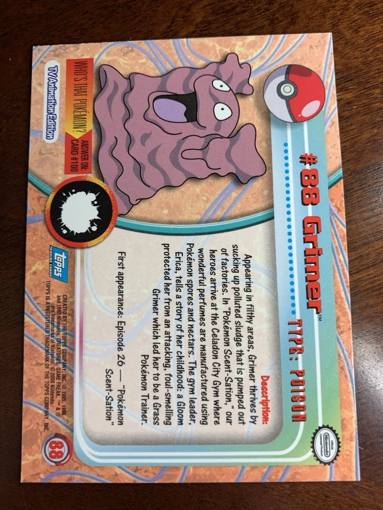 2000 Topps Pokemon TV Animation Series 2 #88 Grimer Up for sale is a 2000 Topps Pokemon TV Series 2 card. Please review pictures as the card pictured is of the actual card that you will receive. The card will be placed in a penny sleeve and shipped in a cardboard box with delivery tracking. I have 100% positive feedback and have been selling items on ebay for many years. Let me know if you have any questions or need additional pictures and I will be happy to provide them. Yes - I do offer combined shipping. Additional shipping cost for each ungraded (raw) card is FREE and for each PSA graded item is only $0.50. Pokémon Official Trading Cards , informally known as Pokémon Trading Cards series 1 , was a set of Pokémon-themed trading cards manufactured by Topps in 1999. There were 90 cards in total: 76 Pokémon cards, 13 character cards, and a checklist card. Each of these 90 cards also had two foil card versions (silver and rainbow) in their main United States distributions. This set contained no bonus "chase cards". In the United States There were four different printings. These cards all had an oval Nintendo seal. The printings are distinguished by a blue, black, green, or red Topps logo, with card texts being updated between the first (blue) and second (black) printings. Due to an error, all foil cards after the first printing were printed with black logos, but can still be distinguished by the differences in their debossings. § 1st printing: blue logo on all cards, foil cards had a smooth texture with no debossings. § 2nd printing: black logo on all cards, Pokémon foil cards were debossed with rays and starbursts, while TV cards had a sandpaper finish. § 3rd printing: green logo on non-foil cards only, Pokémon foil cards were debossed with flames and teardrops, while TV cards had dots and rectangles. § 4th printing: red logo on non-foil cards only, Pokémon foil cards were debossed with Poké Balls and targets, while TV cards had dents. A fifth printing featuring foil cards with a smooth finish but a black logo (features of both the 1st and 2nd printings) was also produced to an uncertain extent. Pokémon Trading Cards series 2 was a set of Pokémon-themed trading cards manufactured by Topps in 2000. There were 72 cards in total: 41 Pokémon cards, 5 "Heroes & Villains" cards, 25 episode cards, and a checklist card. Each of these 72 cards also had two foil card versions (silver and rainbow). In addition, there were 27 bonus "chase cards" not included on the checklist, including 12 die-cut embossed cards, 10 animation stick-on cards, and 5 clear cards. Pokémon Trading Cards series 3 was a set of Pokémon-themed trading cards manufactured by Topps in 2000. There were 72 cards in total: 34 Pokémon cards, 12 "Heroes & Villains" cards, 19 episode cards, 6 puzzle cards, and a checklist card. Each of these 72 cards also had two foil card versions (silver and rainbow). In addition, there were 27 bonus "chase cards" not included on the checklist, including 12 die-cut embossed evolution cards, 10 pop-up cards, and 5 clear cards.