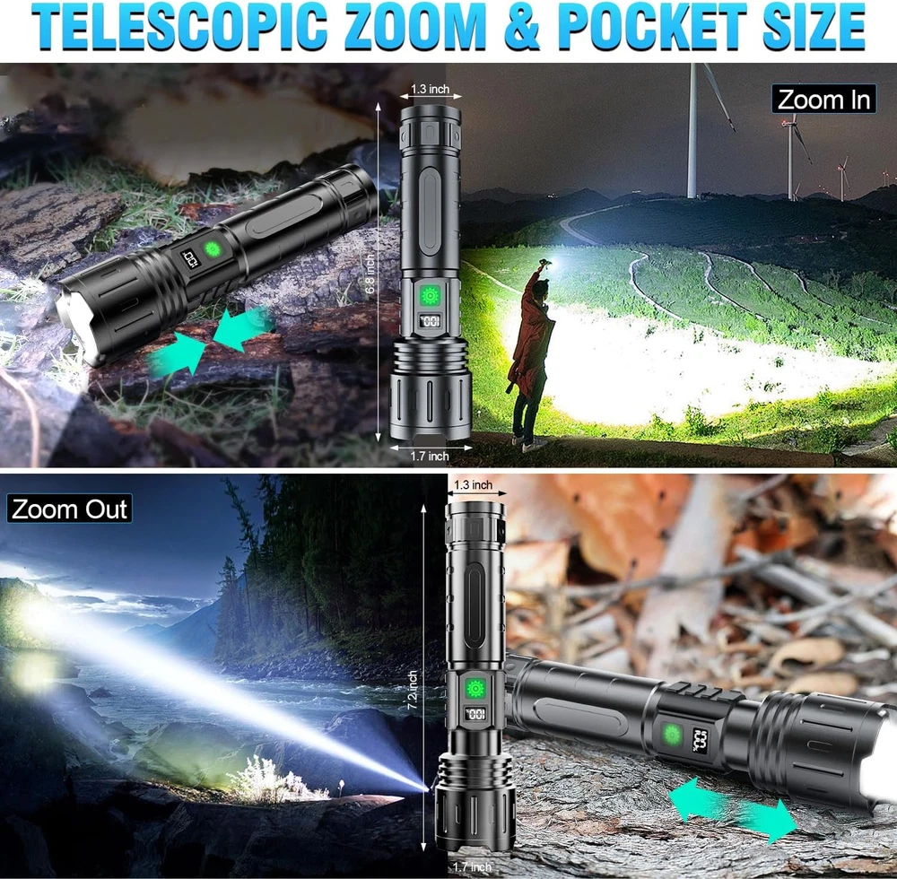 Store New Arrivals Add to Favorite View Feedback Contact Waterproof Rechargeable Flashlight 20000 High Lumens with Storage Box-1500 Meters Long Beam Super Bright LED Flash Light with Power Display & IPX5 Waterproof for Camping, 20H Runtime,5 Modes,Zoomable Handheld Flashlight Description Light Source Type LED Style Rechargeable LED Flashlight Power Source Battery Powered Battery Cell Composition Lithium Ion Light Path Distance 1500 Meters Batteries Included? Yes Specification Met UL Assembled Height 1 inches Batteries Required? No Product Dimensions 4.7 x 1 x 1 inches Material Aluminum Assembled Width 1 inches Included Components 1pcs LED Tactical Flashlight, 1pcs USB Cable, 1pcs 5000 M-a-h B-a-tt-er-y,1pcs user manual,1pcs storage box Battery Description Lithium-Ion Bulb Features Long Beam LED White Brightness 20000 Lumens Light Source Wattage 5 Watts Brightness 20000 Lumen Water Resistance Level Waterproof Item Weight 10.8 ounces Specific Uses Flashlight for Camping, Hiking, Dog Walking dog, Boating, Power Outages, Emergency, General Purpose, Everyday Carry, Backup, Survival, Car, Home, Outdoors, Indoors Special Features Long Beam LED high Lumens, with power disaply, COB 5 Lighting Modes, One key turn off, Type c USB Fast charging,Power bank function, Zoomable, Waterproof, easy to use, lightweight,tactical Runtime 20 hours Mounting Type USB Rechargeable Color high lumen flashlight Wattage 5 Watts Voltage 3.7 Volts Recommended Uses For Product Outdoor activities, emergency situations, dog walking, camping, hiking, fishing, BBQ, night walking Assembled Length 4.7 inches Rechargeable Flashlight & Power Digital Display: USB Type C port for 4 hours fast charging your LED Flashlight, and USB Output used as emergency powerbank to charge your phone , GPS, Camera , a good helper during in your camping trip or emergency use, sametime thsi rechargeable LED Flashlight equipped a Power digital display make it easy to know exactly how much power is left when using the flashlight. Long Runtime with 5000mah Ba-tt-ery: Hoxida Tactical Rechargeable flashlight could run up to 20Hours in Low Modes, never let you worry about the power off , This High Lumen rechargeable flashlight is widely used in outdoor survival activity, like camping, hiking, fishing, BBQ, dog walking or any outdoor activities. 5modes, Zoomable LED Flashlight: This LED tactical flashlight has 5 different lighting modes: high-medium-Low-strobe-SOS; simply turned off the flashlight by long press the button 2S, No need to cycle through all modes, With Zoomable function, it can work as a spotlight when zoom out , and also can be used as a floodlight when zoom in.suitable for outdoor survival activity such as camping hiking travel,nigh walking or other emergency situations Waterproof, Compact & anti-slip sturdy: High Lumen Tactical Flashlight with sturdy aluminum body makes IPX6 Waterproof for all weather use and has impact resistance. This powerful Rechargeable flashlight set included a 1pcs Led Rechargeable Flashlight, 1pcs usb type C cable, 1pcs user manual . 1pcs storage box . YOU WILL LIKE OUR HIGH LUMEN LONG BEAM LED FLASHLIGHT! Long Beam LED FLashlight Product Description Why Choose Hoxida High lumen LED Rechargeable Flashlight? 1.Super Bright LED flashlight: Long Range LED, illuminate 20000 lumen easily light up over the length of about two football fields and reaches nearly 1980ft.100 times brighter than old incandescent lights. 10times Brighter then normal led Flashlight 2.USB Rechargeable Flashlight: Coming with USB cable, Hoxida Rechargeable Flashlight could Conveniently charged by any USB interface , like power bank , car charger , computer , and so on . 3.Long Lasting Flashlight could get a 20hours runtime if get a full charge in low modes 4.Adjustable Focus,& 5 Modes: 5 Useful Settings (High/Medium/Low/Strobe/SOS ) and wide-to-narrow beam zoom makes this flashlight ideal for use around the house, dog walking, or camping. 5.Water resistant : This high lumen flashlight is IPX5 waterproof, perfectly used in the rain, snow or emergency situations. Ideal for use around the house, dog walking, camping, hiking or fishing. 6. One key Turn off : Flashlight can be directly turned off via long press the button 2S.No need to go through all modes to turn off the flashlight 7. Power display: Flashlights with power display, so you can clearly know how much power it rest. Long Range LED DeTachable Clip Pocket Sized Waterproof flashlight Hoxida High Lumen LED Flashlight Brand Hoxida Name High Lumen Long Range LED Flashlight Brightness 20000 Lumen Lighting Mode High/Medium/Low/Strobe/Sos Zoomable Yes, Zoom in and Zoom out Material Aeronautica Aluminum Alloy Waterproof IPX5 Water Resistant Feature 1 High Lumen Long Range LED Flashlight Feature 2 One Key Turn Off Feature 3 Power display Package Included 1x High Lumen Rechargeable Flashlight ;1 x USB Cabel,1pcs 5000mah Ba-tt-ery; 1pcs user manual ,1pcs carry case ABOUT US Explore our handpicked range of top-quality items at fantastic prices. Our goal is to make your shopping experience as smooth and enjoyable as possible. Thanks for visiting! Warm regards, The FerroWarehouse Team SHIPPING We are always working hard to ensure your package arrives as soon as possible. Please understand that some factors like weather, high postal traffic, and the performance of shipping companies are outside of our control. We offer free shipping to the lower 48 states and Canada, with orders processed within 2 business days of payment—often sooner. Please provide a physical address; we do not ship to P.O. Boxes. For shipping outside the U.S. and Canada, delivery time, cost, and processing may vary. International customers are responsible for all duties and taxes. To estimate shipping costs, please proceed to checkout. Thank you for shopping with us! RETURNS We want you to be completely satisfied with your purchase. If you need to return an item We accept returns within 30 days of receipt. Items must be unused and 