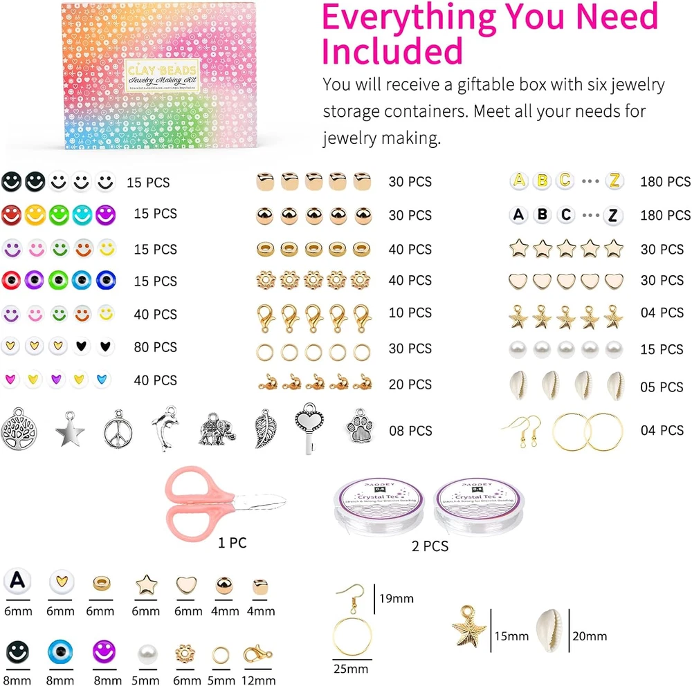 Store New Arrivals Add to Favorite View Feedback Contact Fast deliveries to the customer's home Quality customer service John Make the customers happy! 20,000 Pcs Clay Beads Bracelet Making Kit, 120 Colors 6 Boxes Polymer Beads Spacer Heishi Beads & Jewelry Kit with Pendant Charms Elastic Strings, Crafts Gift for Kids Adults Description EVERYTHING YOU NEED INCLUDE, WELL ORGANIZED IN 6 BOXES - The Clay beads bracelet making kit contains 19,000pcs clay beads in 120 different colors and 1000+ accessories. The rich accessories include letter beads, heart beads, evil eyes beads, smile face beads, square beads, star beads, pendants and charms, lobster clasps, etc. More than ten kinds of accessories to make your design more exciting. (Everything shown on the picture contains) PREMIUM MATERIAL & RAINBOW LIKE COLORS - 120 colors strictly selected popular colors which will meet all your DIY needs. Creativity is more important than skills here for bracelet jewelry making. Heishi beads kits are lightweight, comfortable to wear and made of polymer clay, non-toxic, not easy to fade, waterproof, so you can wear them on everything from the beach, pool or bathroom. ORDERLY ORGANIZATION - 120 different colors in 6 storage boxes. About 150+pcs/color, each color and the accessories are placed in a dedicated box, which is easy to access and will not be messed up, and you can easily find it according to your needs. NOT ONLY A BRACELET MAKING KIT - With this polymer clay beads kit, you can play with your children during the holidays, improve parent-child relationship, keep your children away from electronics, as well as inspire their creativity and imagination, which is a cute gift for your children, family, friends, and yourself. TRENDY ARTS AND CRAFTS GIFTS CHOICE - Exquisite gift box contains everything for a clay beads bracelet making crafts enthusiast. It’s a great gift for girls ages 6-14 teen and preteen girls. Lovely crafts kit for kids or adults as christmas gifts, birthday gifts. Product Description The video showcases the product in use. The video guides you through product setup. The video compares multiple products. The video shows the product being unpacked. 1 DIY EARINGS 2 DIY BRACELETS 3 DIY NECKLACES 4 DIY CRAFTS Top 3 reasons to choose us! Exquisite Packaging Perfect gift that’s stunning at your first glance Create Beautiful Bracelets with Ease Our step-by-step instructions are easy to follow and make for a lovely and joyful day for you and your child. Unleash Your Creativity The latest trendy elements are incorporated into our kit, setting it apart from the outdated styles you might find on the market. More Bracelet Making Kit in Paodey Add to Cart Add to Cart Add to Cart Add to Cart Add to Cart Customer Reviews 4.7 out of 5 stars 1,988 4.7 out of 5 stars 241 4.8 out of 5 stars 110 4.6 out of 5 stars 367 4.6 out of 5 stars 158 4.6 out of 5 stars 322 Price $22.99 $ 22 . 99 $17.99 $ 17 . 99 — $12.99 $ 12 . 99 $18.99 $ 18 . 99 $25.99 $ 25 . 99 Material Polymer Clay Acrylic Plastic Glass Glass Glass Glass Size 6mm 9mm 8mm 6mm 4mm (6/0) 3mm (8/0) Rich Accessories ✔ ✔ ✔ ✔ ✔ ✔ Giftable ✔ ✔ ✔ ✔ ✔ ✔ Usage bracelets, necklaces, earrings bracelets, craft with pipetube bracelets, necklaces, jewelry bracelets, necklaces, jewelry bracelets, intricate beadwork bracelets, intricate beadwork Item model number Beads Item dimensions L x W x H 0.24 x 0.24 x 0.08 inches Age Range (Description) Kid,Adult Color Classic 120 Colors Included Components Beads Material polymer clay Country of Origin China Style Box Item Weight 2.88 pounds Theme Jewelry Size Small Model Name PD-2W Seasons All Seasons Art Craft Kit Type Clay Bead Jewelry Making Kit Special Feature 120 colors Product Dimensions 0.24 x 0.24 x 0.08 inches Number of Pieces 20000 ABOUT US We offer the best prices around on high quality products. Our E-store includes media such as books, movies, music and games while offering electronics, toys, sporting apparel, clothing, tools, general home, garden items and more. SHIPPING We are always working hard to ensure your package arrives as soon as possible. Please understand that some factors like weather, high postal traffic, and the performance of shipping companies are outside of our control. We offer free shipping to the lower 48 states and ship within 2 business days of payment, usually sooner. We do not accept P.O. Boxes. Please provide a physical address. For shipping outside of the continental USA, we only use eBay's Global Shipping Program. The item is shipped to KY and then sent to the rest of the world. International customers are responsible for all duties and taxes. Continue to 'check out' to calculate costs for shipping the item to your country. Messages regarding eBay's Global Shipping Program MUST be directed at eBay EXCLUSIVELY. RETURNS We offer a 30-Day Return Policy on items in which you are not completely satisfied with. You have the option of a full-refund or an exchange of the item. No returns are available on items shipped outside of the USA PAYMENT We accept PayPal. CONTACT US This page content is yet to come Please ad us to your favorite seller and visit again later Thank You CUSTOMER SATISFACTION We try our very best to make sure every customer is completely satisfied. If there's a problem, message us! We're happy to help. WE ACCEPT