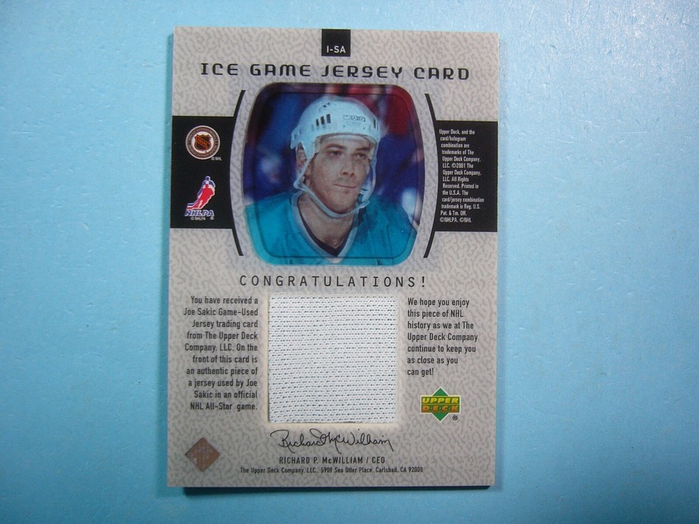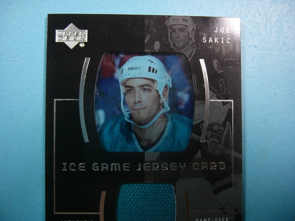 YOU ARE BIDDING ON A 2000/01 UPPER DECK ICE GAME JERSEY NHL HOCKEY CARD #I-SA JOE SAKIC, ALL-STAR, COLORADO AVALANCHE. CARD FEATURES A 100% ORIGINAL AND AUTHENTIC GAME-USED JERSEY SWATCH OF PLAYER NOTED ABOVE GUARANTEED BY UPPER DECK AS STATED ON THE BACK OF THE CARD. CARD IS IN NEAR MINT CONDITION . CORNERS ARE SHARP. ABSOLUTELY NO CREASES, BENDS OR WRINKLES. SEE SCANS FOR FURTHER CONDITION. GREAT COLOUR & GLOSS--A VERY SHARP, CLEAN & ATTRACTIVE SUPER POPULAR JERSEY CARD FROM THIS VALUABLE UPPER DECK ICE HOCKEY SET!!! THANK YOU FOR LOOKING AND GOOD LUCK!!! -------------------------------------------------------------------------------------------------------------------------------- SHIPPING WITHIN CANADA IS $3.99, TO THE UNITED STATES $4.99 AND INTERNATIONALLY $9.99 (EVERYWHERE ELSE). ITEM WILL BE CAREFULLY PACKAGED SO AS NOT TO GET DAMAGED DURING SHIPPING. IF YOU WOULD LIKE EXPEDITED SECURE SHIPPING WITH TRACKING & INSURANCE SHIPPING WITHIN CANADA IS $16.00, TO THE UNITED STATES IS $25.00 AND EVERYWHERE ELSE $50.00. I DO COMBINE SHIPPING ON MULTIPLE PURCHASES--ONLY 50 CENTS PER ADDITIONAL GRADED CARD OR ONLY 20 CENTS MORE PER ADDITIONAL SINGLE UNGRADED PHOTO OR CARD. TAKE A LOOK AT MY OTHER AUCTIONS AND SAVE ON SHIPPING!!!