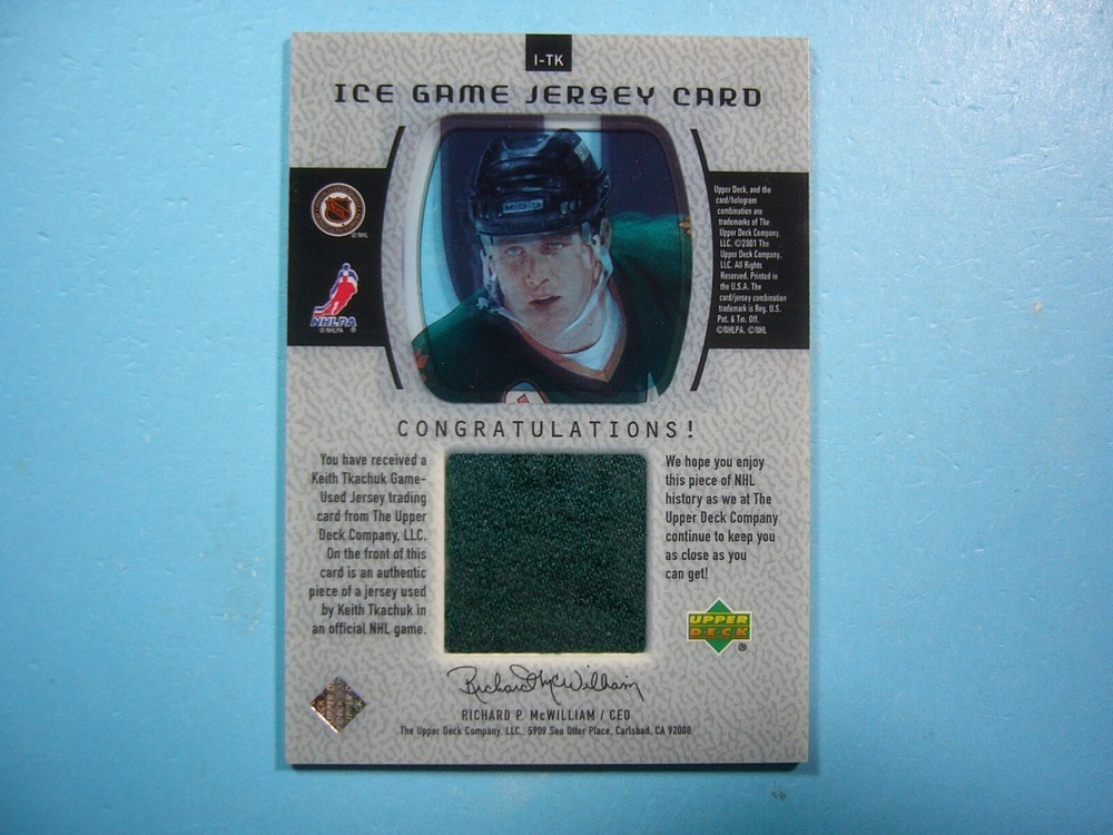 YOU ARE BIDDING ON A 2000/01 UPPER DECK ICE GAME JERSEY NHL HOCKEY CARD #JC-TK KEITH TKACHUK, PHOENIX COYOTES. CARD FEATURES A 100% ORIGINAL AND AUTHENTIC GAME-USED JERSEY SWATCH OF PLAYER NOTED ABOVE GUARANTEED BY UPPER DECK AS STATED ON THE BACK OF THE CARD. CARD IS IN NEAR MINT CONDITION . CORNERS ARE SHARP. ABSOLUTELY NO CREASES, BENDS OR WRINKLES. SEE SCANS FOR FURTHER CONDITION. GREAT COLOUR & GLOSS--A VERY SHARP, CLEAN & ATTRACTIVE SUPER POPULAR JERSEY CARD FROM THIS VALUABLE UPPER DECK ICE HOCKEY SET!!! THANK YOU FOR LOOKING AND GOOD LUCK!!! -------------------------------------------------------------------------------------------------------------------------------- SHIPPING WITHIN CANADA IS $3.99, TO THE UNITED STATES $4.99 AND INTERNATIONALLY $9.99 (EVERYWHERE ELSE). ITEM WILL BE CAREFULLY PACKAGED SO AS NOT TO GET DAMAGED DURING SHIPPING. IF YOU WOULD LIKE EXPEDITED SECURE SHIPPING WITH TRACKING & INSURANCE SHIPPING WITHIN CANADA IS $16.00, TO THE UNITED STATES IS $25.00 AND EVERYWHERE ELSE $50.00. I DO COMBINE SHIPPING ON MULTIPLE PURCHASES--ONLY 50 CENTS PER ADDITIONAL GRADED CARD OR ONLY 20 CENTS MORE PER ADDITIONAL SINGLE UNGRADED PHOTO OR CARD. TAKE A LOOK AT MY OTHER AUCTIONS AND SAVE ON SHIPPING!!!