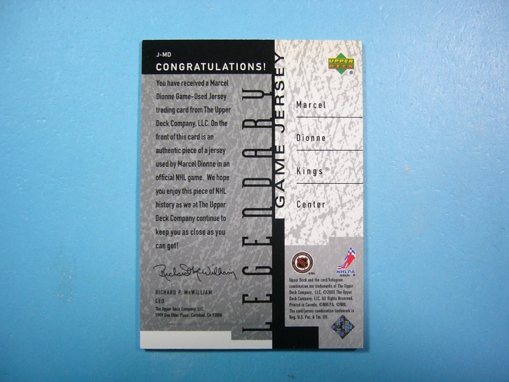 YOU ARE BIDDING ON A 2000/01 UPPER DECK NHL LEGENDS LEGENDARY GAME JERSEY NHL HOCKEY CARD #J-MD MARCEL DIONNE, NEW YORK RANGERS. CARD FEATURES A 100% ORIGINAL AND AUTHENTIC GAME-USED JERSEY SWATCH OF PLAYER NOTED ABOVE GUARANTEED BY UPPER DECK AS STATED ON THE BACK OF THE CARD. CARD IS IN NEAR MINT CONDITION . CORNERS ARE SHARP. ABSOLUTELY NO CREASES, BENDS OR WRINKLES. SEE SCANS FOR FURTHER CONDITION. GREAT COLOUR & GLOSS--A VERY SHARP, CLEAN & ATTRACTIVE JERSEY CARD FROM THIS VALUABLE UPPER DECK HOCKEY SET!!! THANK YOU FOR LOOKING AND GOOD LUCK!!! -------------------------------------------------------------------------------------------------------------------------------- SHIPPING WITHIN CANADA IS $3.99, TO THE UNITED STATES $4.99 AND INTERNATIONALLY $9.99 (EVERYWHERE ELSE). ITEM WILL BE CAREFULLY PACKAGED SO AS NOT TO GET DAMAGED DURING SHIPPING. IF YOU WOULD LIKE EXPEDITED SECURE SHIPPING WITH TRACKING & INSURANCE SHIPPING WITHIN CANADA IS $16.00, TO THE UNITED STATES IS $25.00 AND EVERYWHERE ELSE $50.00. I DO COMBINE SHIPPING ON MULTIPLE PURCHASES--ONLY 50 CENTS PER ADDITIONAL GRADED CARD OR ONLY 20 CENTS MORE PER ADDITIONAL SINGLE UNGRADED PHOTO OR CARD. TAKE A LOOK AT MY OTHER AUCTIONS AND SAVE ON SHIPPING!!!