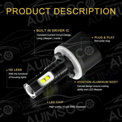 Feture: 【 Super Bright and Low Power 】 : (Set of 2 bulbs,6000K, White) 880 2323 10SMD Chipsets LED Bulbs,1200 Lumens Per Bulb, Much Brighter Than Original Bulb. 【 Heat Dissipation 】 : Built-in intelligent IC driver and aviation aluminum material for better performance, stable input current protects the circuit, Ensure the secure temperature range and consistent brightness out to reach a long LED bulb life up to 50,000 hours. 【 Application 】: Fits 889, 892, 893, PG13, PGJ13, 880, 890, 862, 884, 885, 894, 898, 899 .Used for DRL, Fog Lights. Bulb Size: 56x26mm, Working voltage: DC 12V-24V. For most vehicles, Just Plug & Play Replacement LED Bulb. 【 Note 】 : Please double check the owner's manual or original bulb size to confirm before placing an order. Specification: Type: LED Fog Light Number of Bulbs: 2 Bulb Size: 880 Voltage: 12V-24V Lumens: 1200LM/per bulb LED Quantity: 10 LEDs/per bulb LED Type: 2323 10SMD LED High Power Chip Light Color: White Color Temperature: 6000K Beam Angle: 360° Beam Lifetime: 50,000 hours Size: 56x26mm Interchange Part Number: 889, 892, 893, PG13, PGJ13, 880, 890, 862, 884, 885, 894, 898, 899 Fit For: Used for DRL, Fog Lights Package Include: 2Pcs 880 6000K White LED Fog Light Driving Bulbs Brand New High Quality with Reasonable Price Fast Ship from KY or CA within 1 business day Tracking# Is Available With Free Shipping 60 days money-back guarantee & free return